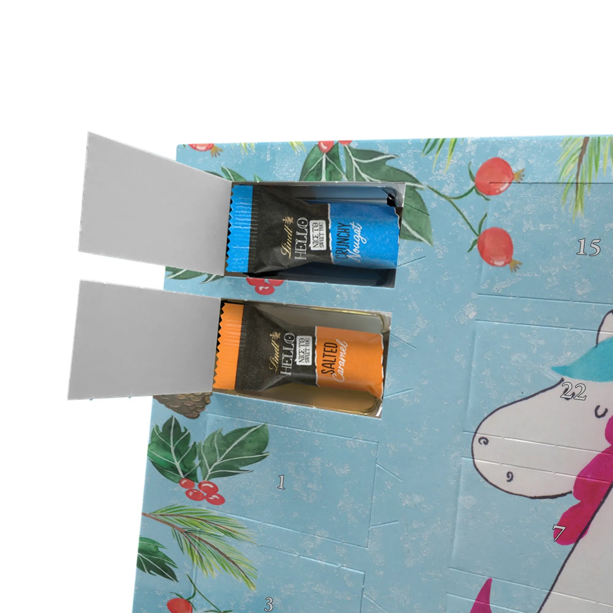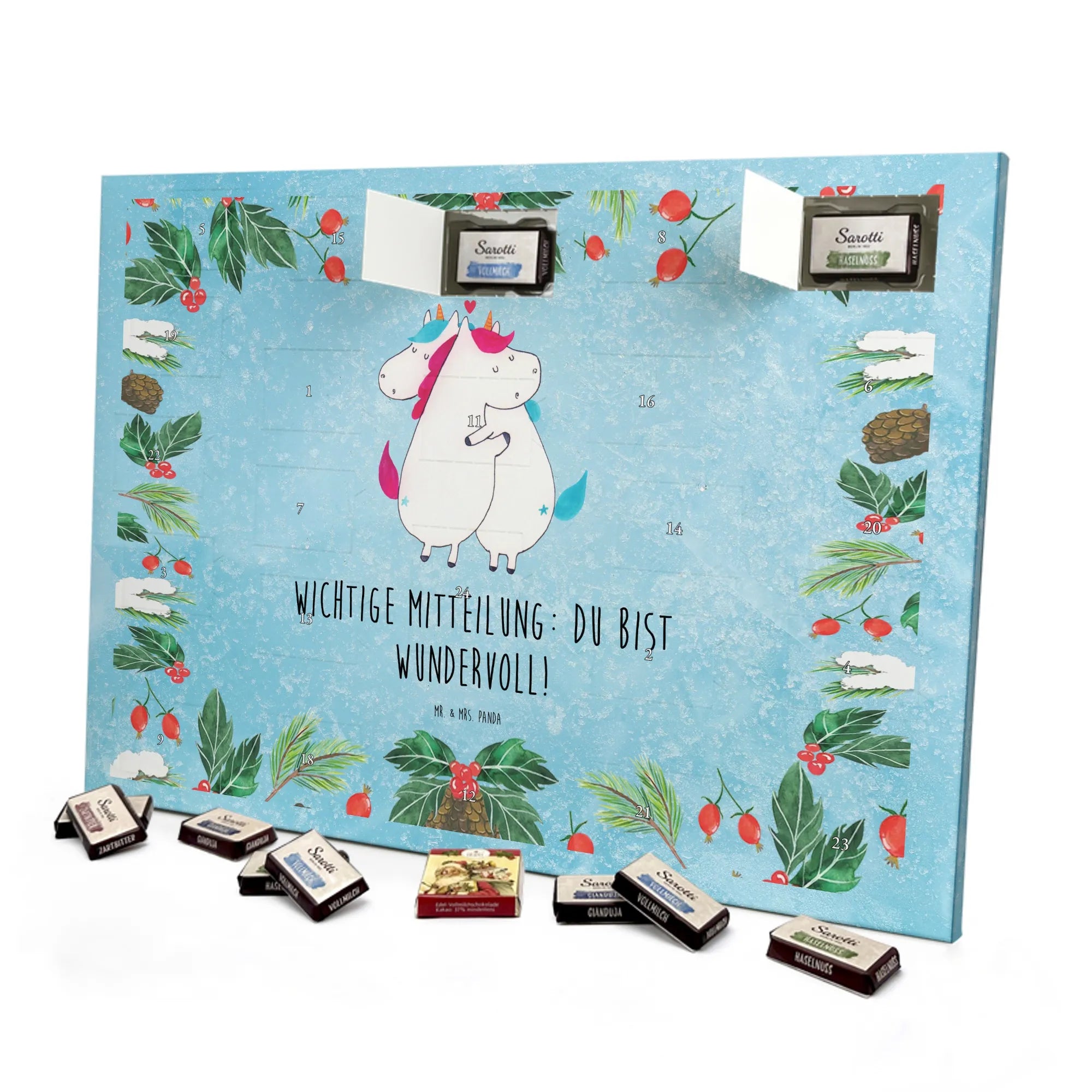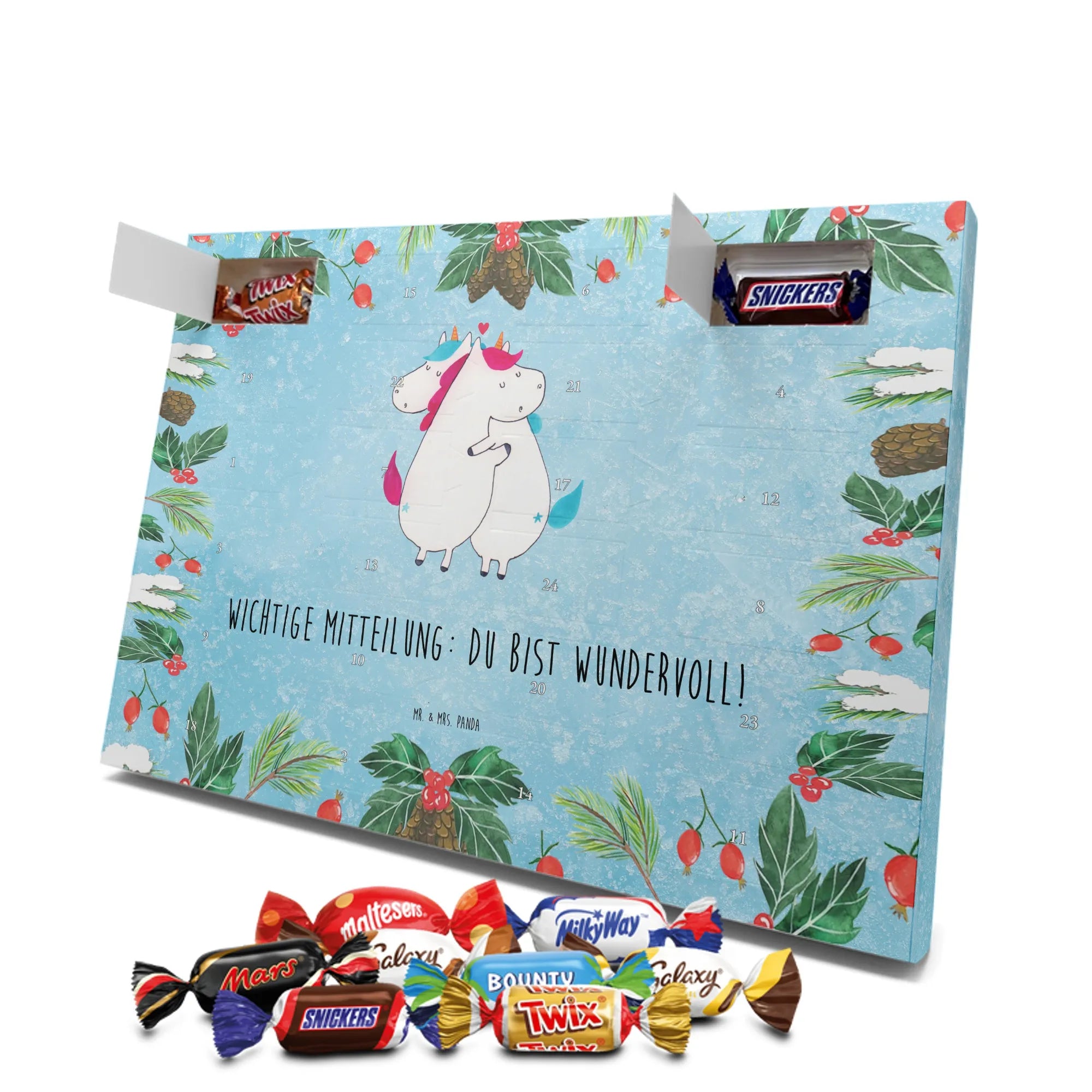 Verschenke mit unserem Schoko Adventskalender Einhorn Mitteilung aus der Einhorn - Kollektion ein Lächeln, tägliche Vorfreude und die liebevolle Botschaft: Du bist wundervoll! 🦄✨
