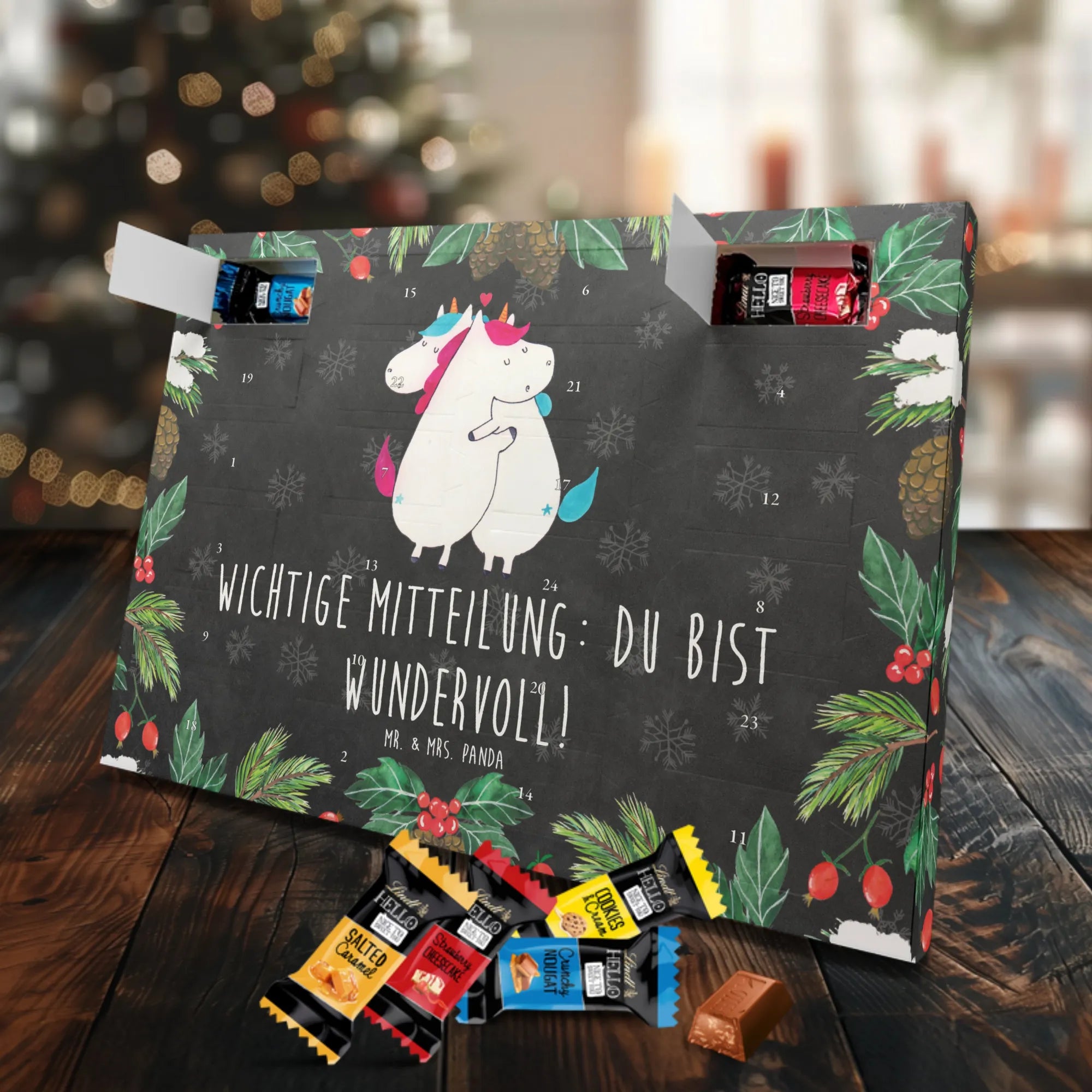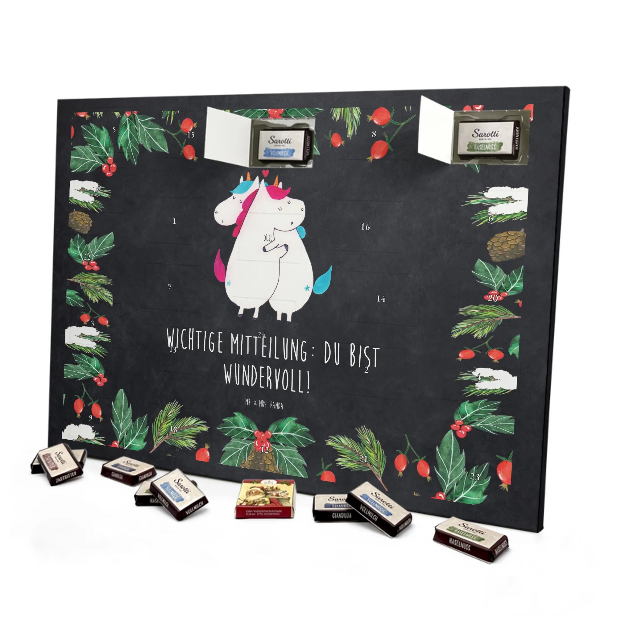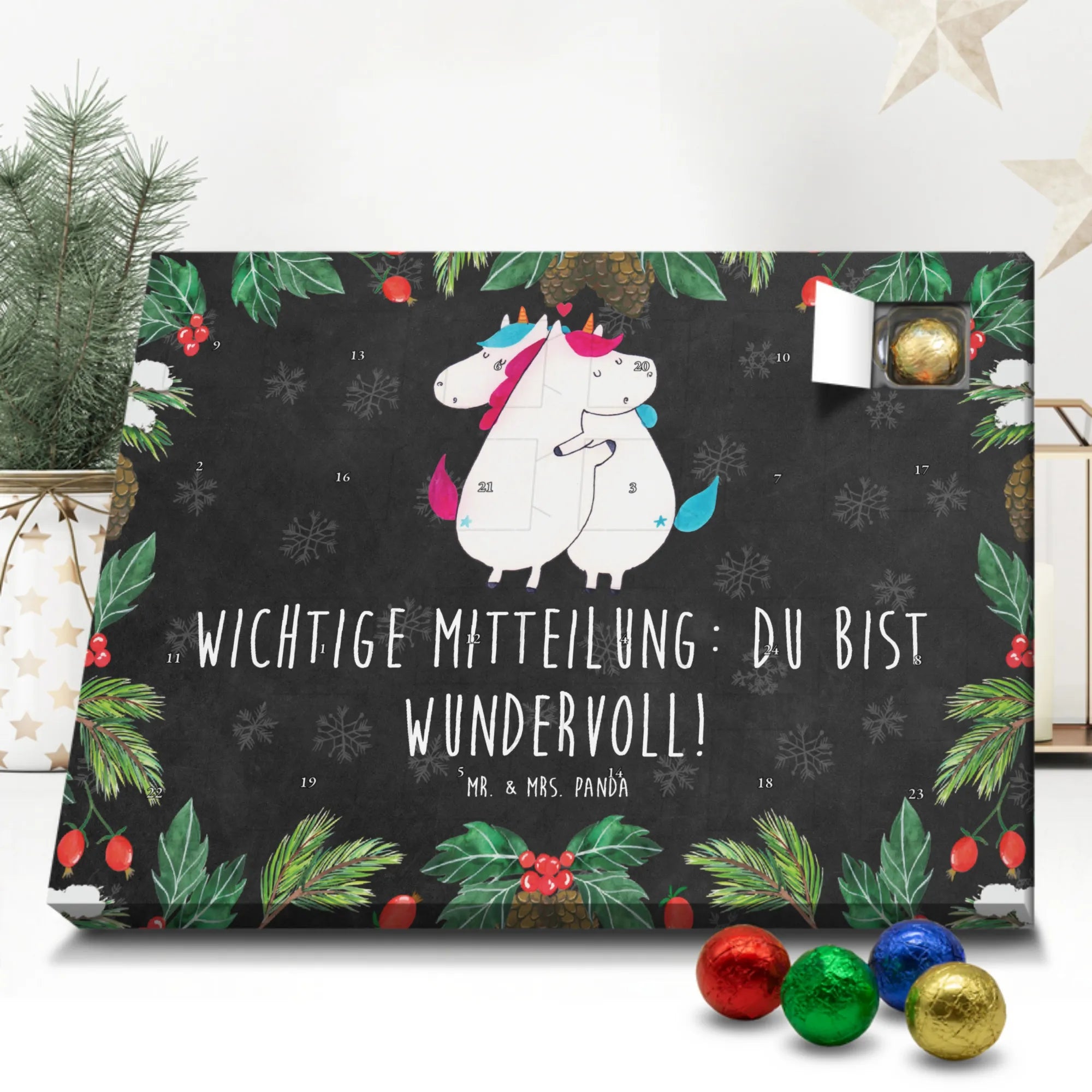 Schoko Adventskalender „Einhorn Mitteilung“ – ein zauberhaftes Geschenk aus der Einhorn - Kollektion von Mr. & Mrs. Panda. Auf einer hübschen Kreidetafel-Optik kuscheln zwei Einhörner und überbringen die herzerwärmende Botschaft: Wichtige Mitteilung: du bist wundervoll! 🦄💌 Dieser Adventskalender ist die perfekte Mischung aus Humor, Liebe und süßem Genuss – ideal für Partner, Ehe, Freundinnen, Kollegen oder einfach für alle Einhorn-Fans.