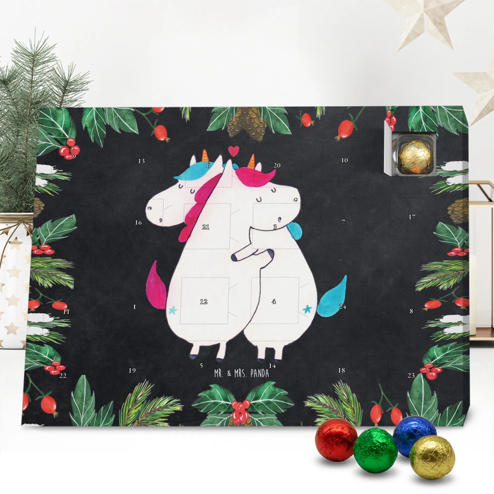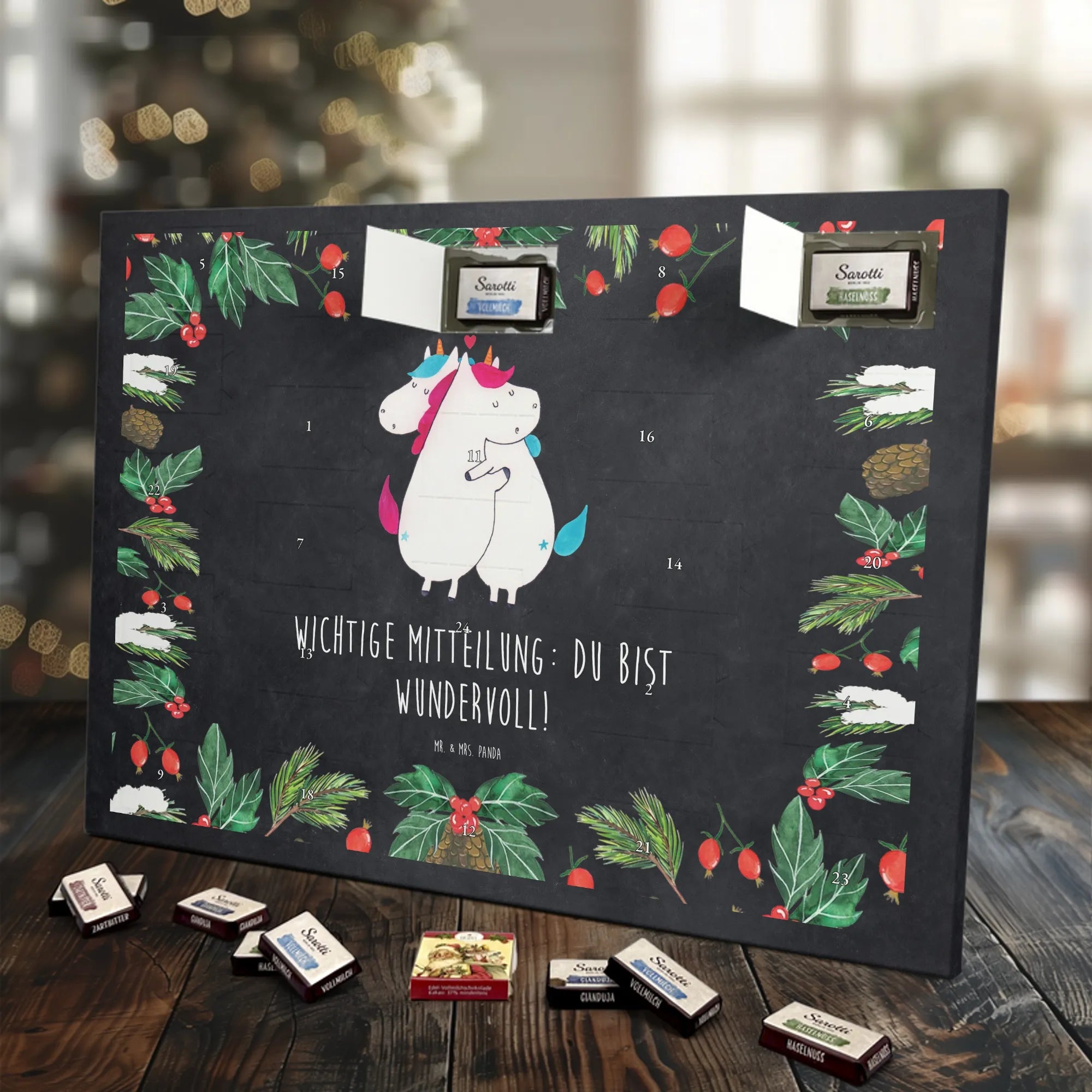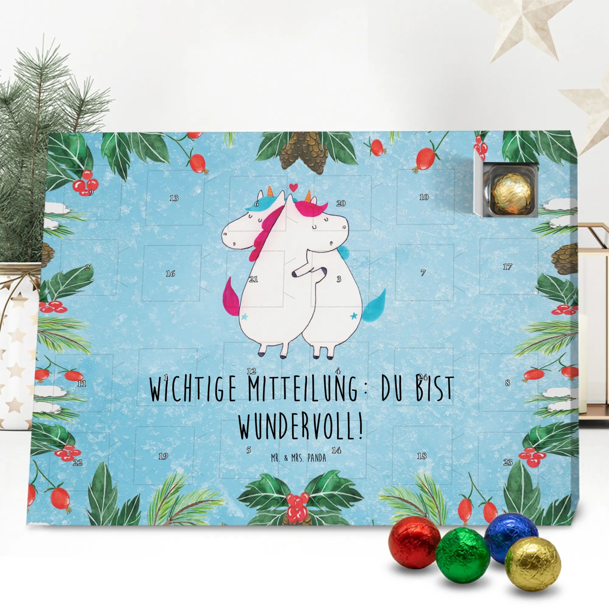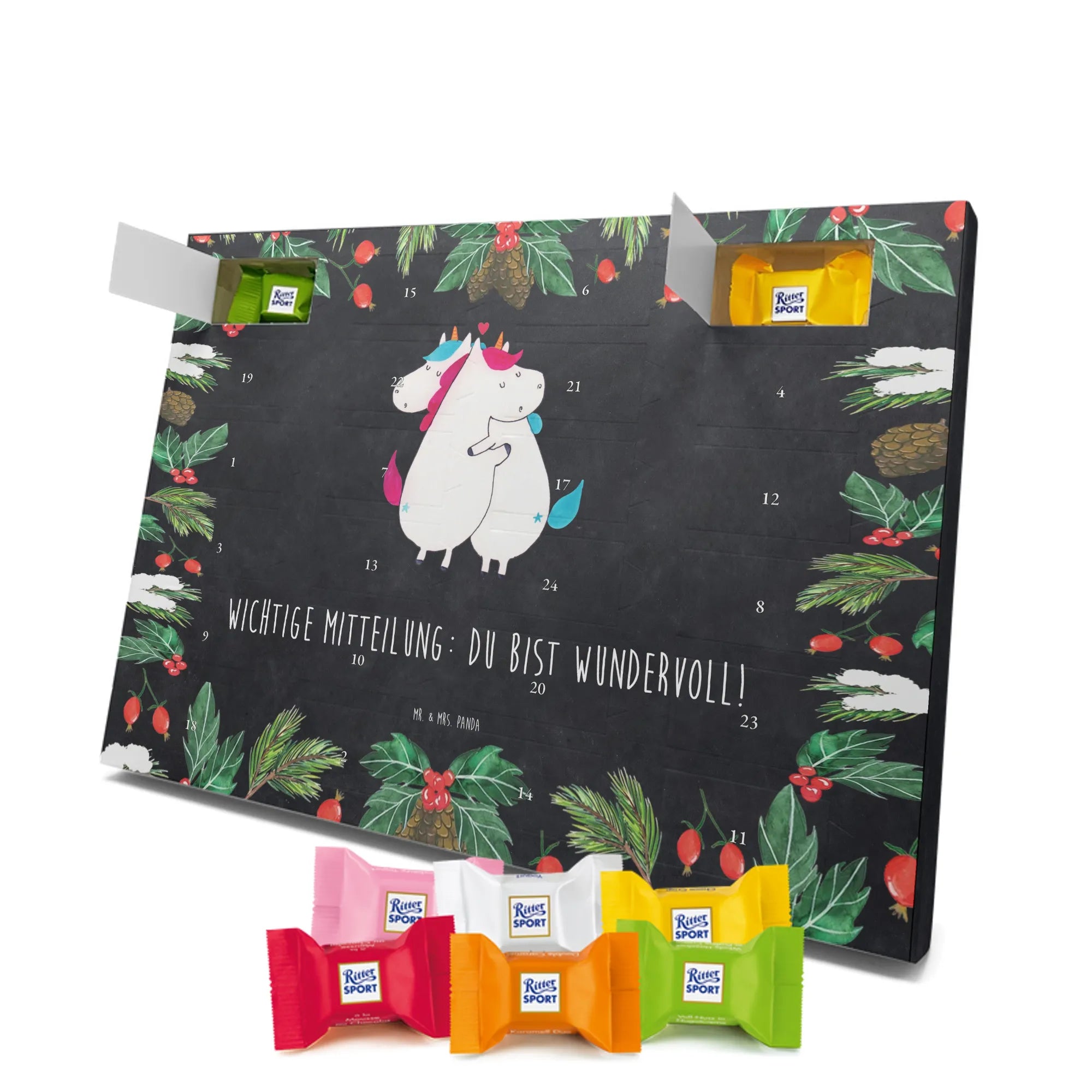Schoko Adventskalender „Einhorn Mitteilung“ – ein zauberhaftes Geschenk aus der Einhorn - Kollektion von Mr. & Mrs. Panda. Auf einer hübschen Kreidetafel-Optik kuscheln zwei Einhörner und überbringen die herzerwärmende Botschaft: Wichtige Mitteilung: du bist wundervoll! 🦄💌 Dieser Adventskalender ist die perfekte Mischung aus Humor, Liebe und süßem Genuss – ideal für Partner, Ehe, Freundinnen, Kollegen oder einfach für alle Einhorn-Fans.