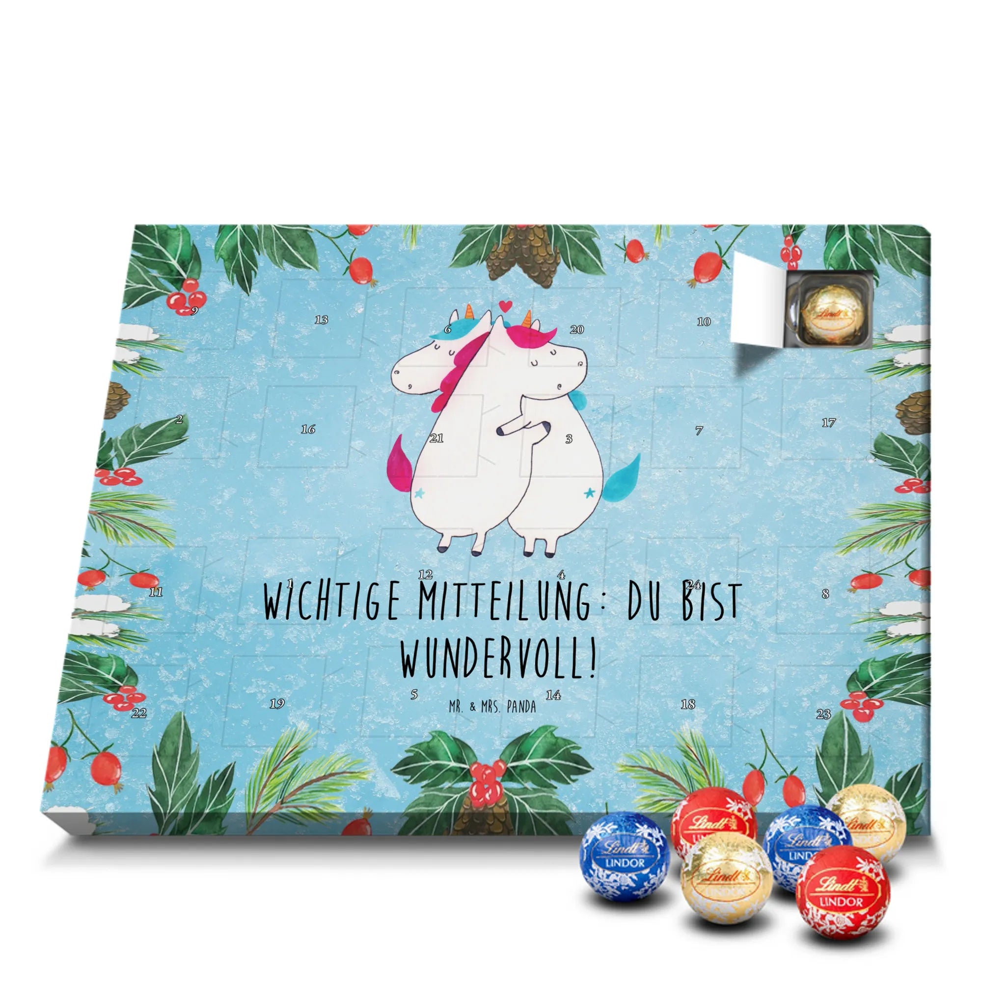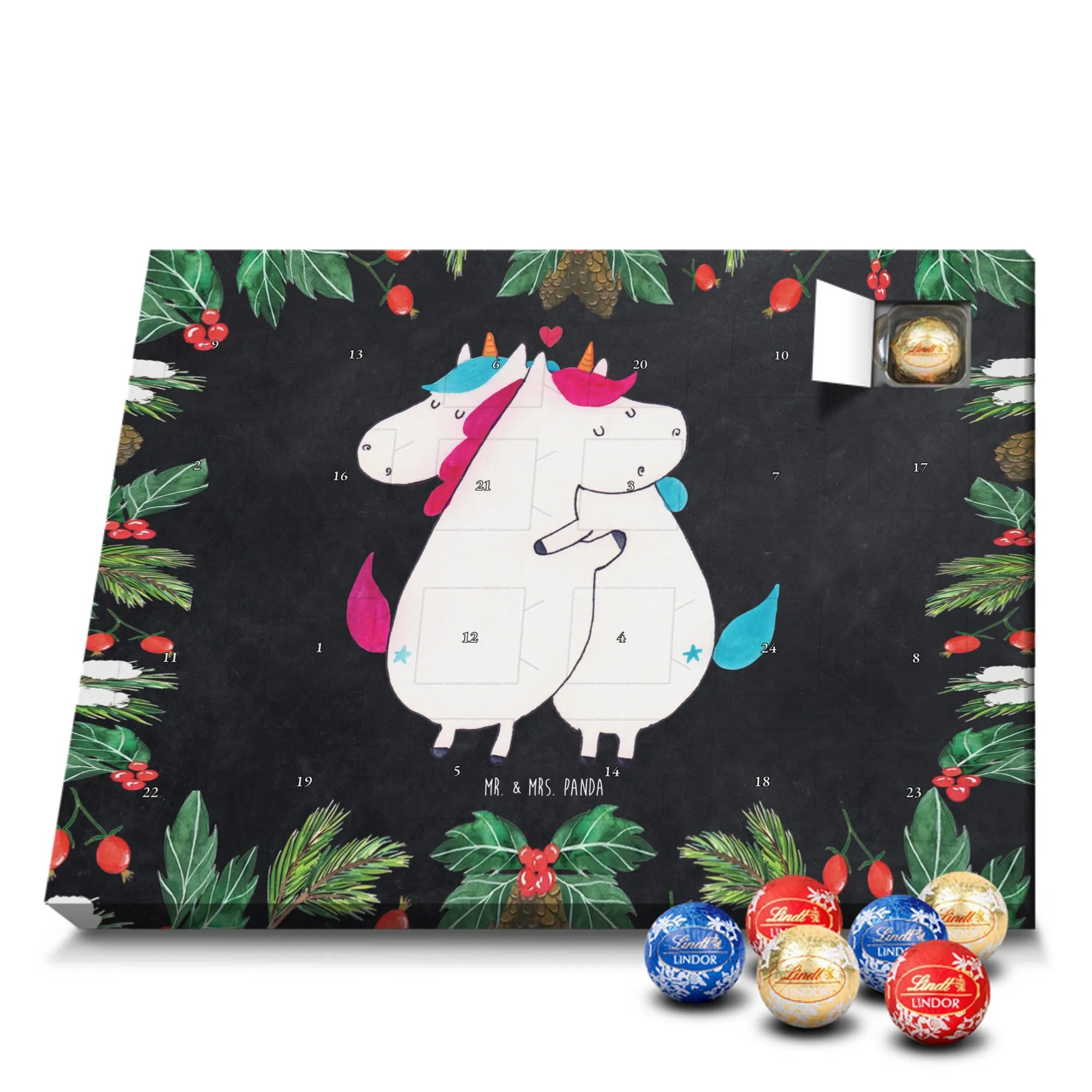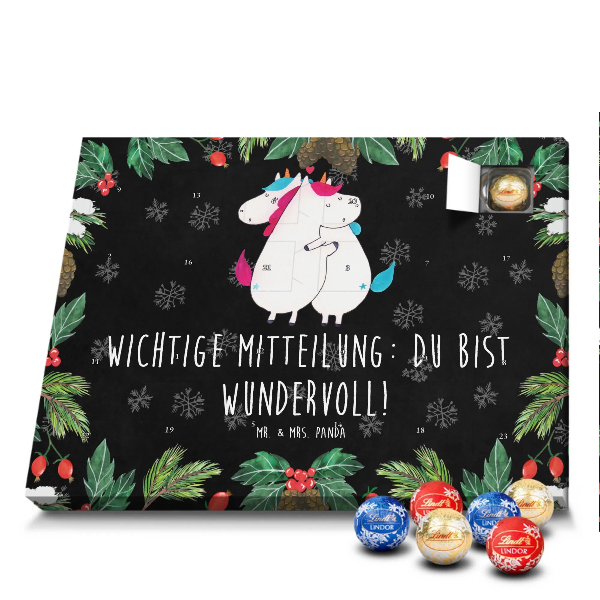 Unser zauberhafter Schoko Adventskalender von Mr. & Mrs. Panda bringt dir die süßeste Vorfreude auf Weihnachten! Dieser liebevoll gestaltete Adventskalender ist bedruckt mit wunderschönen Motiven & Sprüchen von Mr. & Mrs. Panda und ist nicht personalisierbar – dafür aber ein perfektes Geschenk für Freunde und Familie. Brillante Druckqualität mit seidenmatter Oberflächenveredelung sorgt für ein edles Finish, und die bedruckten Seitenflächen machen den Kalender von allen Seiten zu einem Hingucker. Maße: 233 mm x 178 mm x 24 mm. Besonderheit: kann aufgehängt oder aufgestellt werden, je nachdem, wie du ihn präsentieren möchtest. Gefüllt mit Lindt Lindor: 24 einzeln verpackte Markenschokoladen Kugeln in drei verschiedenen Sorten – Vollmilch, Feinherb und Weiße Schokolade – sorgen für abwechslungsreichen Genuss in der Adventszeit. Zutaten: Zucker, pflanzliches Fett (Kokosnuss, Palmkern), Kakaobutter, Vollmilchpulver, Kakaomasse, Milchzucker, Magermilchpulver, Butterreinfett, Emulgator (Sojalecithin), Gerstenmalzextrakt, Aromen. Besondere Hinweise: Kann Haselnüsse und Mandeln enthalten. Unser Schoko Adventskalender verbindet niedliches Design mit hochwertiger Füllung – ideal zum Verschenken oder selbst Naschen. Mr. & Mrs. Panda wünschen dir eine fröhliche und leckere Adventszeit!