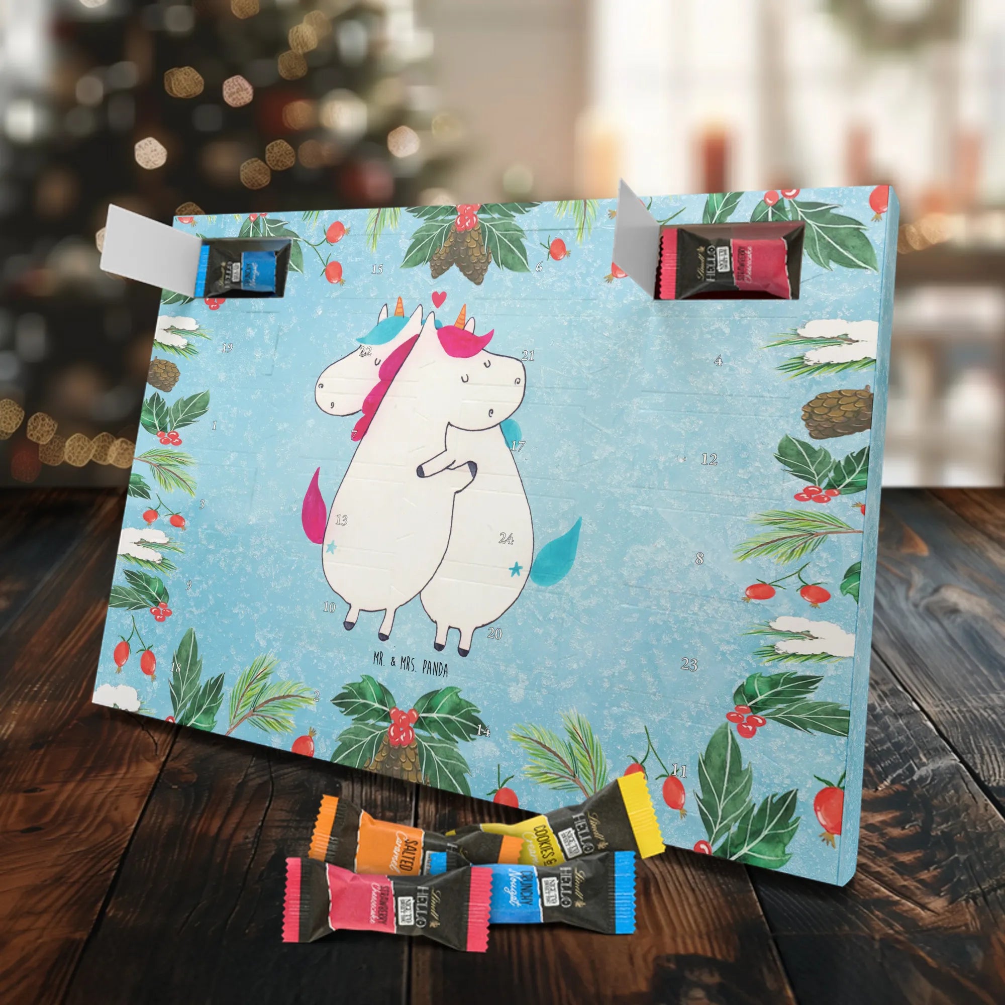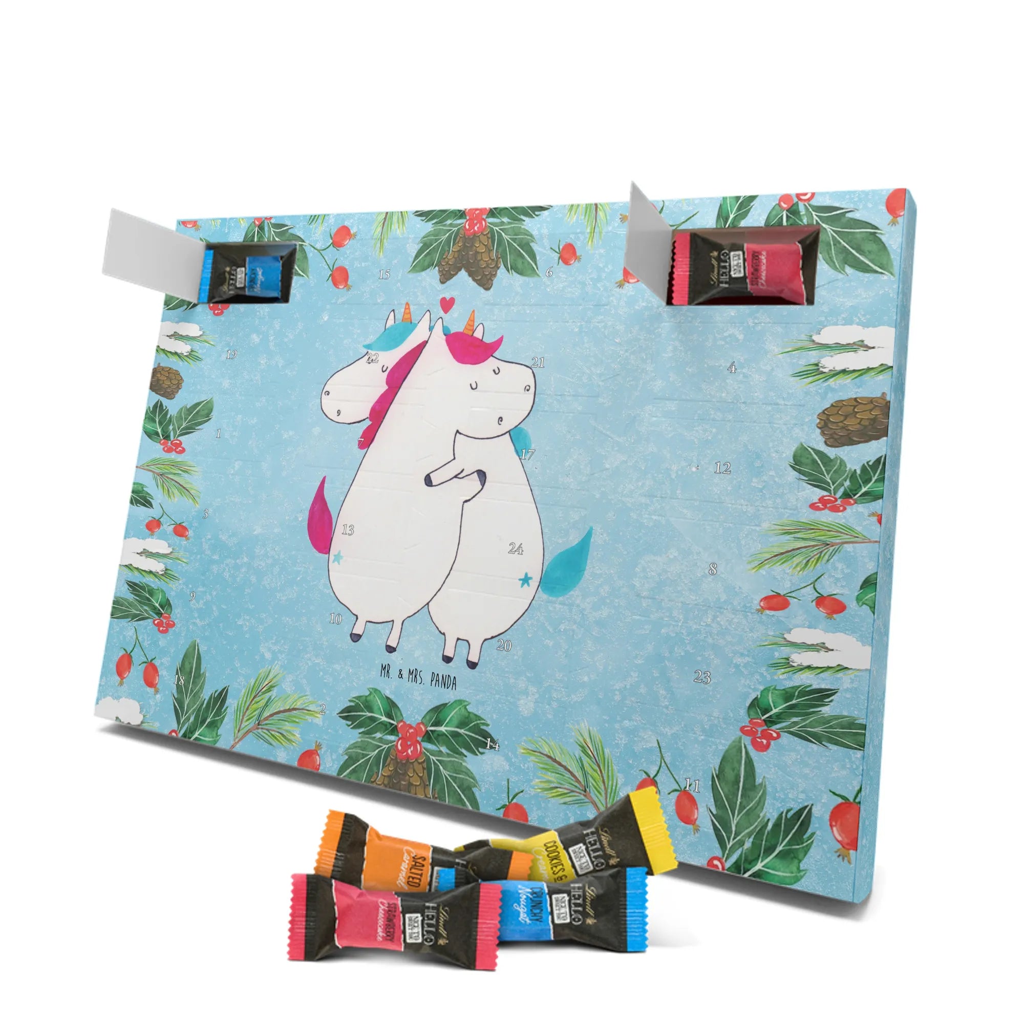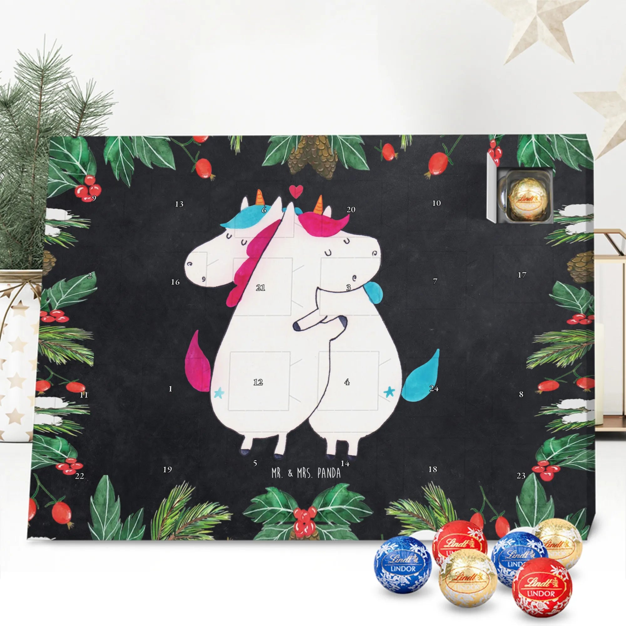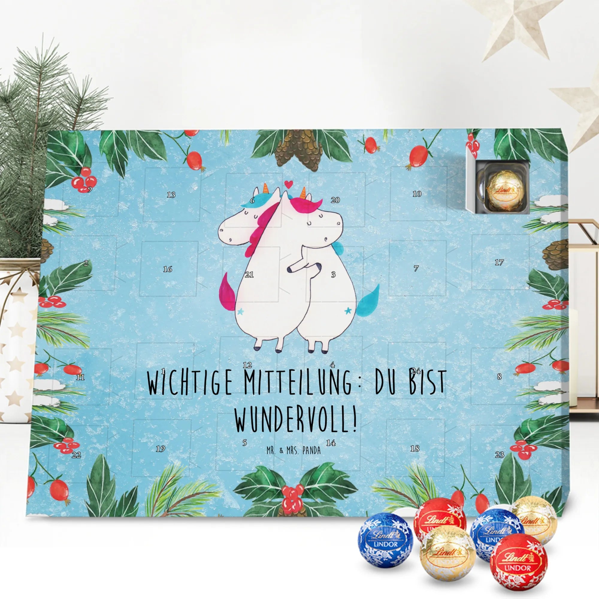 Unser zauberhafter Schoko Adventskalender von Mr. & Mrs. Panda bringt dir die süßeste Vorfreude auf Weihnachten! Dieser liebevoll gestaltete Adventskalender ist bedruckt mit wunderschönen Motiven & Sprüchen von Mr. & Mrs. Panda und ist nicht personalisierbar – dafür aber ein perfektes Geschenk für Freunde und Familie. Brillante Druckqualität mit seidenmatter Oberflächenveredelung sorgt für ein edles Finish, und die bedruckten Seitenflächen machen den Kalender von allen Seiten zu einem Hingucker. Maße: 233 mm x 178 mm x 24 mm. Besonderheit: kann aufgehängt oder aufgestellt werden, je nachdem, wie du ihn präsentieren möchtest. Gefüllt mit Lindt Lindor: 24 einzeln verpackte Markenschokoladen Kugeln in drei verschiedenen Sorten – Vollmilch, Feinherb und Weiße Schokolade – sorgen für abwechslungsreichen Genuss in der Adventszeit. Zutaten: Zucker, pflanzliches Fett (Kokosnuss, Palmkern), Kakaobutter, Vollmilchpulver, Kakaomasse, Milchzucker, Magermilchpulver, Butterreinfett, Emulgator (Sojalecithin), Gerstenmalzextrakt, Aromen. Besondere Hinweise: Kann Haselnüsse und Mandeln enthalten. Unser Schoko Adventskalender verbindet niedliches Design mit hochwertiger Füllung – ideal zum Verschenken oder selbst Naschen. Mr. & Mrs. Panda wünschen dir eine fröhliche und leckere Adventszeit!