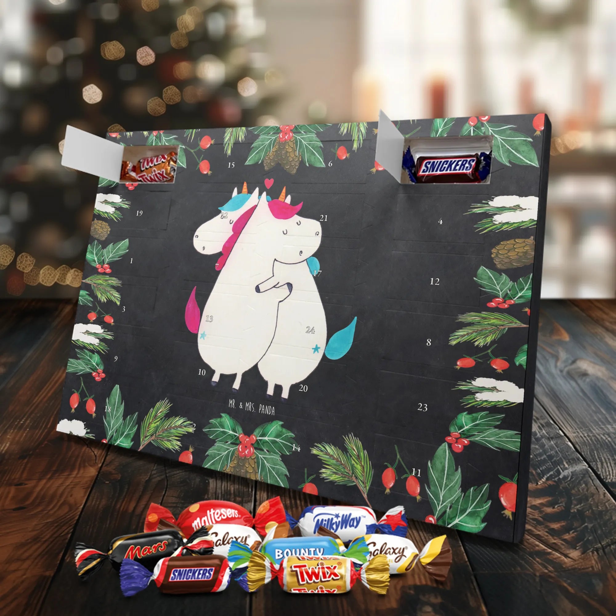 Unser Celebrations Adventskalender von Mr. & Mrs. Panda ist die süße Art, die Tage bis Weihnachten zu zählen. Liebevoll gestaltete Motive und herzliche Sprüche machen jeden Öffnungsmoment besonders. Die brillante Druckqualität zusammen mit einer seidenmatten Oberflächenveredelung sorgt für strahlende Farben und eine angenehme Haptik; auch die Seitenflächen sind bedruckt, damit alles rundum hübsch aussieht. Der Kalender ist nicht personalisierbar. Innen erwarten dich 24 hochwertige Celebrations-Füllungen in acht verschiedenen Sorten: Maltesers, Mars, Snickers, Twix, Milky Way, Bounty, Galaxy und Galaxy Caramel — abwechslungsreicher Genuss für jeden Tag. Als Extra kannst du den Kalender entweder einfach hinstellen oder an die Wand hängen. Maße: 325 mm x 225 mm x 27 mm. Ein ideales Geschenk für alle, die Freude an schönen Details und kleinen Süßigkeiten haben.