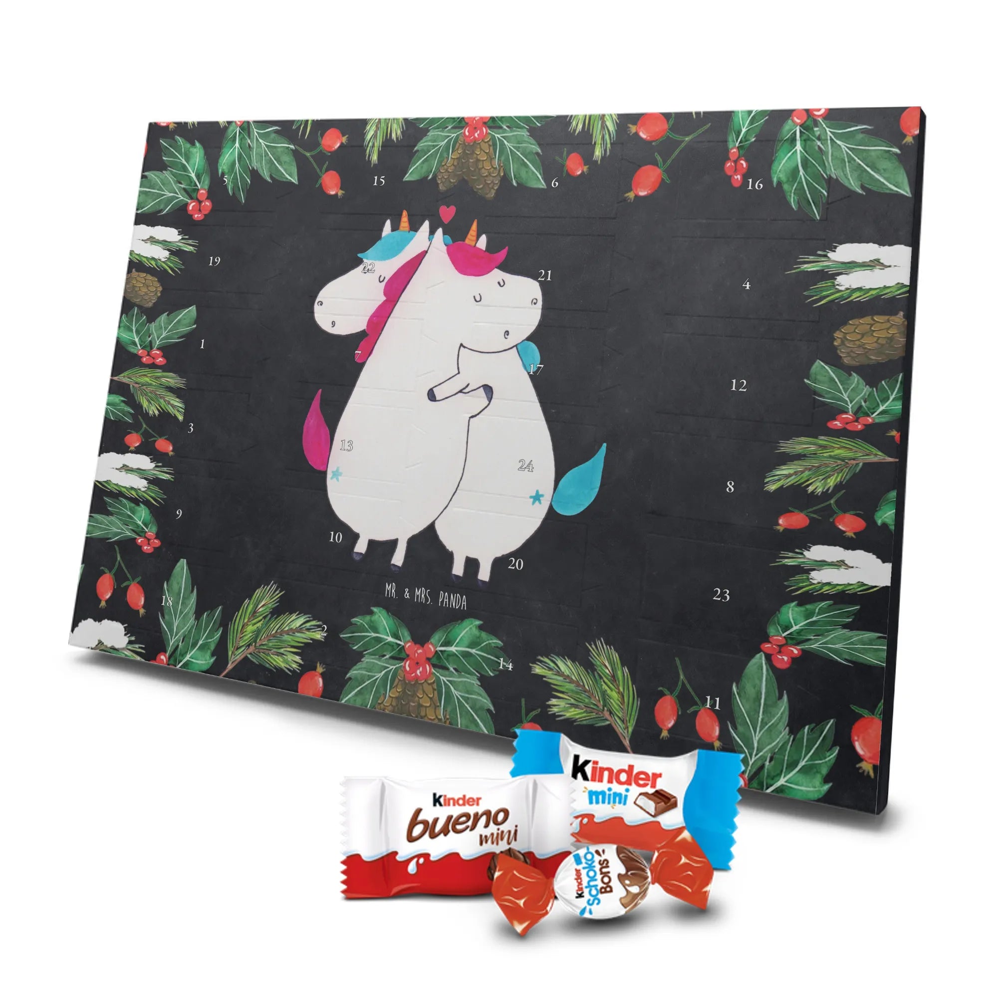 Schoko Adventskalender von Mr. & Mrs. Panda – die charmante Art, sich oder anderen die Adventszeit zu versüßen. Der Kalender ist bedruckt mit wunderschönen Motiven & Sprüchen von Mr. & Mrs. Panda und nicht personalisierbar. Wir legen Wert auf brillante Druckqualität mit seidenmatter Oberflächenveredelung sowie auf bedruckte Seitenflächen für ein stimmiges Gesamtbild. Maße: 355 mm x 245 mm x 11 mm. Besonders praktisch: kann aufgehängt oder aufgestellt werden und passt so in jede Wohnung. Gefüllt mit Markenname Schokolade: Adventskalender gefüllt mit kinder® Schokolade. Inhalt: kinder® Schoko-Bons, kinder® Bueno mini und kinder® Schokolade mini. Die 24 Türchen sind mit kleinen Schoko-Überraschungen bestückt und schaffen jeden Tag Vorfreude. Ob als Geschenk für Kinder, Partner oder als nette Aufmerksamkeit für Kolleginnen und Kollegen – dieser Kalender macht Freude. Robust, schön gestaltet und sofort einsatzbereit für die süßeste Zeit des Jahres!