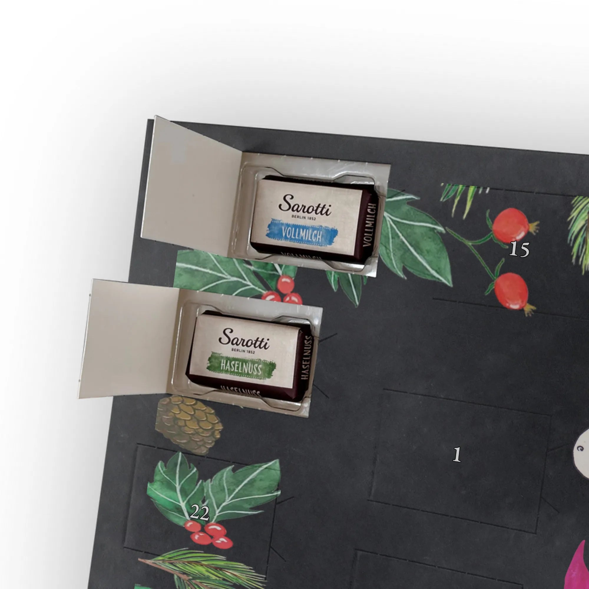 🐼 Schoko-Adventskalender: Liebevolles Design, seidenmatt, brillanter Druck – ein Hingucker.