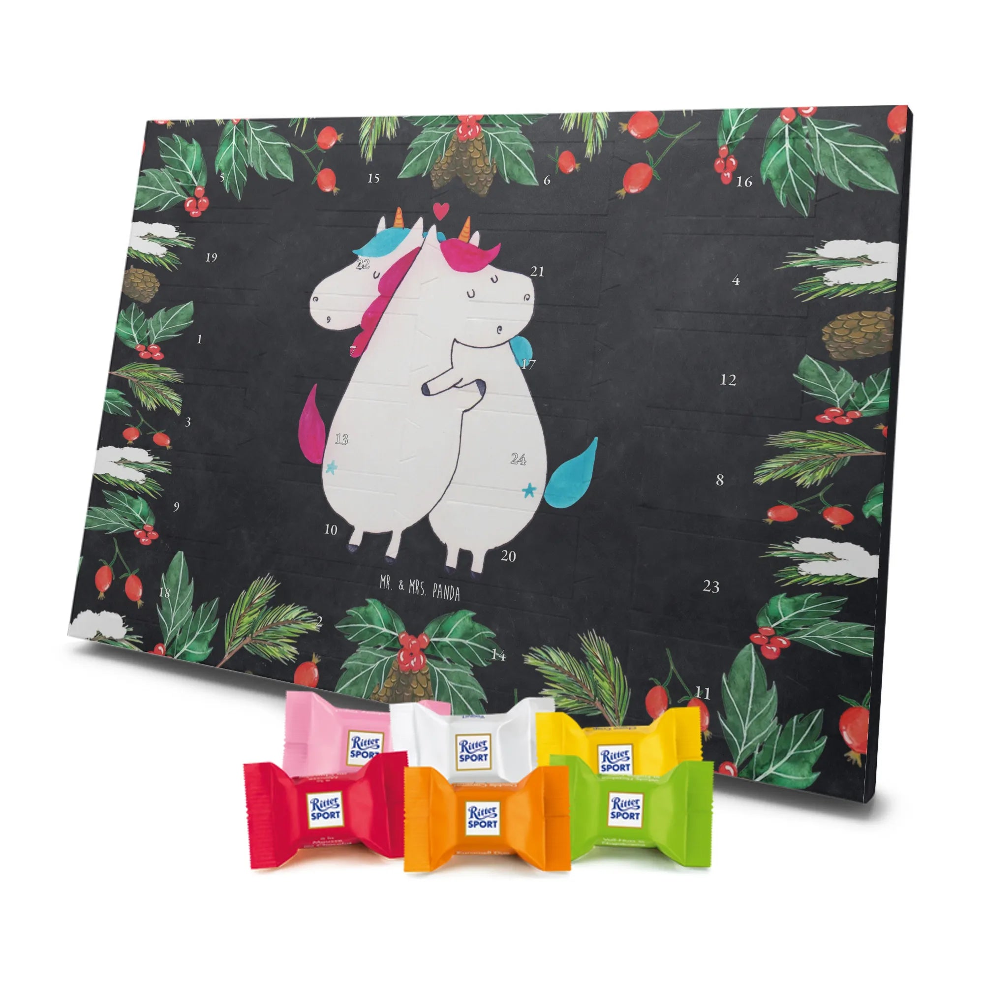 Adventskalender Schokolade von Mr. & Mrs. Panda – eine liebevolle Kombination aus hübschem Design und süßem Inhalt. Der Kalender ist bedruckt mit wunderschönen Motiven & Sprüchen von Mr. & Mrs. Panda und besticht durch brillante Druckqualität mit seidenmatter Oberflächenveredelung. Die Seitenflächen sind ebenfalls bedruckt, wodurch der Kalender rundum ein Hingucker ist. Er ist nicht personalisierbar. Maße: 325 mm x 225 mm x 27 mm. Besonders praktisch: Du kannst ihn sowohl aufgehängt als auch aufgestellt nutzen, je nachdem, wo er bei dir am schönsten wirkt. Gefüllt ist der Kalender mit Ritter Sport Schokowürfeln in verführerischen Sorten – Mousse au Chocolat, Schoko Crisp, Voll-Nuss in Nougatcreme, Karamell Duo, Joghurt und Erdbeer-Joghurt. Wichtiger Hinweis: Es handelt sich um einen Kalender gefüllt mit Ritter Sport Schokolade, nicht um einen Kalender der Marke Ritter Sport. Schenke deinen Liebsten oder dir selbst tägliche Schokoglücksmomente mit diesem charmanten Adventskalender.
