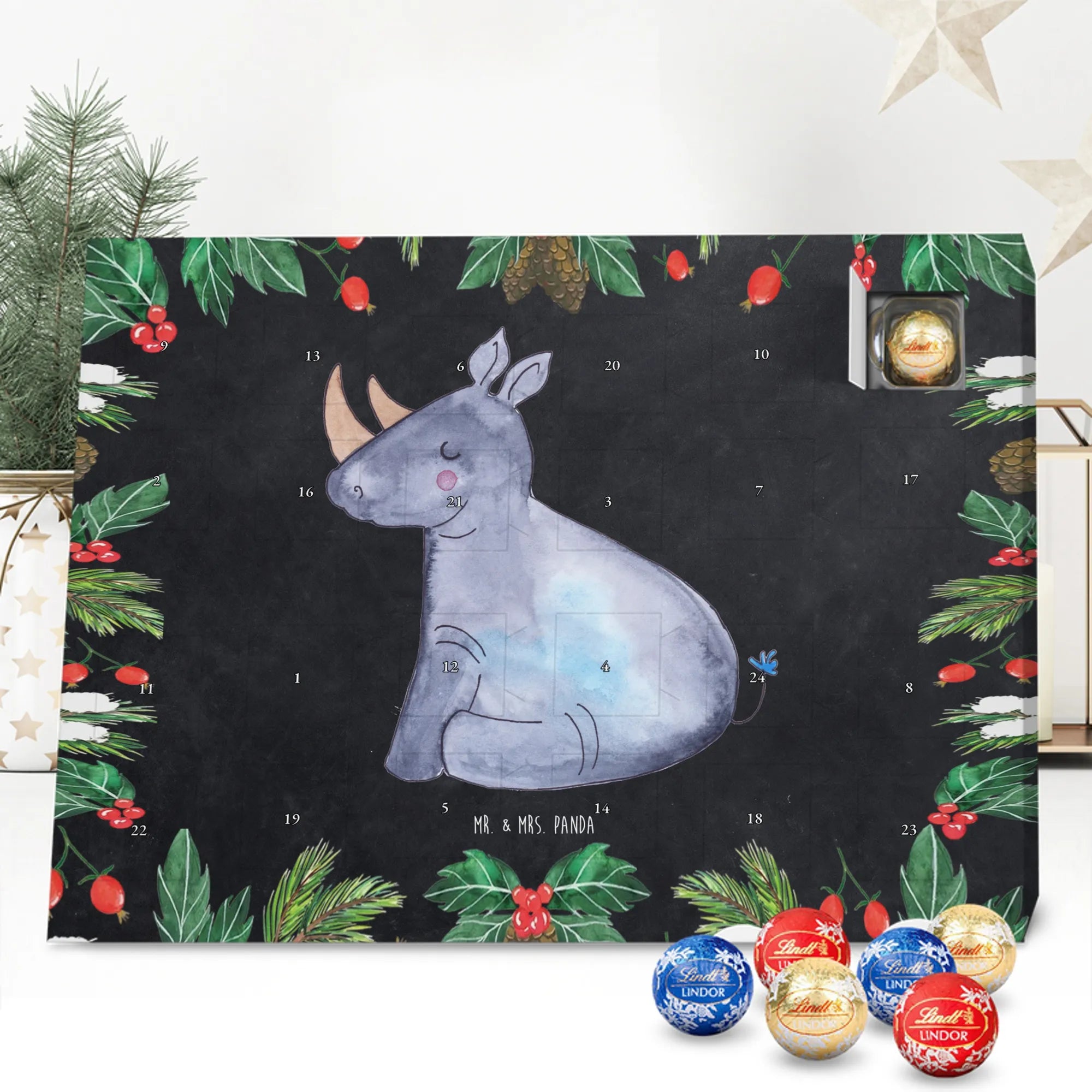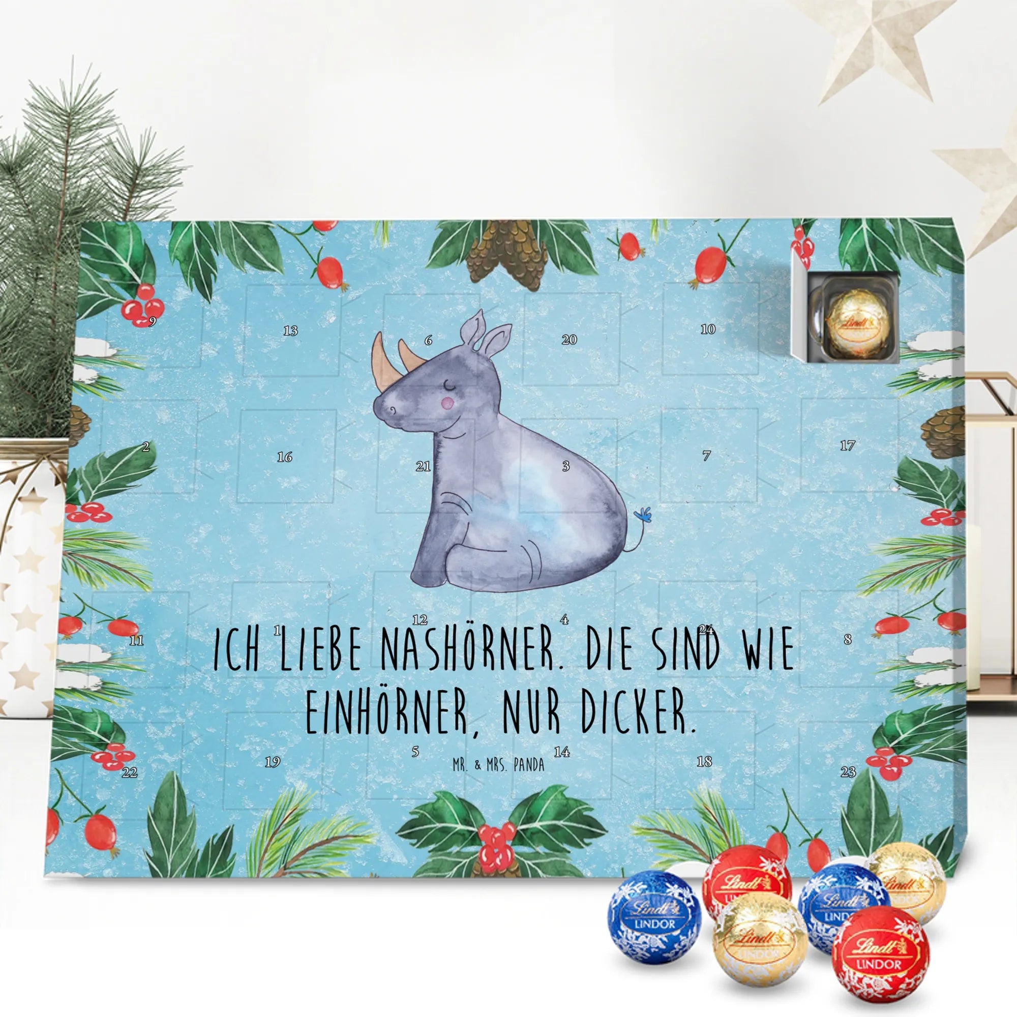 Der Adventskalender mit Schokolade von Mr. & Mrs. Panda ist ein echter Blickfang und eine köstliche Überraschung für die Vorweihnachtszeit. Er ist bedruckt mit wunderschönen Motiven & Sprüchen von Mr. & Mrs. Panda und nicht personalisierbar – deshalb perfekt als unkompliziertes Geschenk. Die brillante Druckqualität und die seidenmatte Oberflächenveredelung sorgen für eine hochwertige Optik, ergänzt durch bedruckte Seitenflächen. Maße: 233 mm x 178 mm x 24 mm. Besonderheit: kann aufgehängt oder aufgestellt werden, ganz wie es dir gefällt. Gefüllt mit Lindt Lindor: 24 einzeln verpackte Markenschokoladen Kugeln in den Sorten Vollmilch, Feinherb und Weiße Schokolade bieten täglich neue Geschmackserlebnisse. Zutaten: Zucker, pflanzliches Fett (Kokosnuss, Palmkern), Kakaobutter, Vollmilchpulver, Kakaomasse, Milchzucker, Magermilchpulver, Butterreinfett, Emulgator (Sojalecithin), Gerstenmalzextrakt, Aromen. Besondere Hinweise: Kann Haselnüsse und Mandeln enthalten. Ob als Mitbringsel, Geschenk oder zum Selbstverwöhnen – dieser Adventskalender vereint schönes Design mit zarter Markenschokolade.