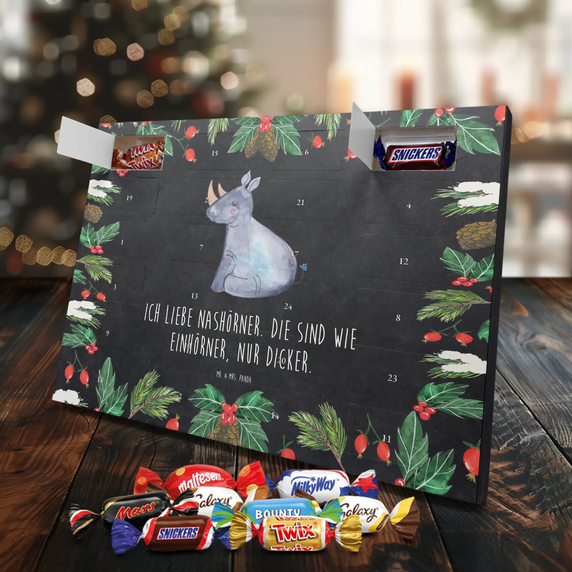 Unser Adventskalender mit Schokolade von Mr. & Mrs. Panda ist ein liebevoll gestaltetes Highlight für die Adventszeit. Die süßen Illustrationen und charmanten Sprüche sorgen für gute Stimmung bei Groß und Klein. Gedruckt in brillanter Qualität mit seidenmatter Oberflächenveredelung, wirken die Farben kräftig und edel; auch die Seitenflächen sind dekorativ bedruckt. Bitte beachten: Der Kalender ist nicht personalisierbar. Gefüllt ist er mit 24 Celebrations-Überraschungen in acht verschiedenen Sorten: Maltesers, Mars, Snickers, Twix, Milky Way, Bounty, Galaxy und Galaxy Caramel — perfekte Abwechslung für jeden Tag. Besonderheit: Du kannst den Kalender sowohl aufstellen als auch aufhängen. Maße: 325 mm x 225 mm x 27 mm. Schenke Vorfreude und kleine Genussmomente – ideal als Geschenk oder für deine eigene Adventszeit.