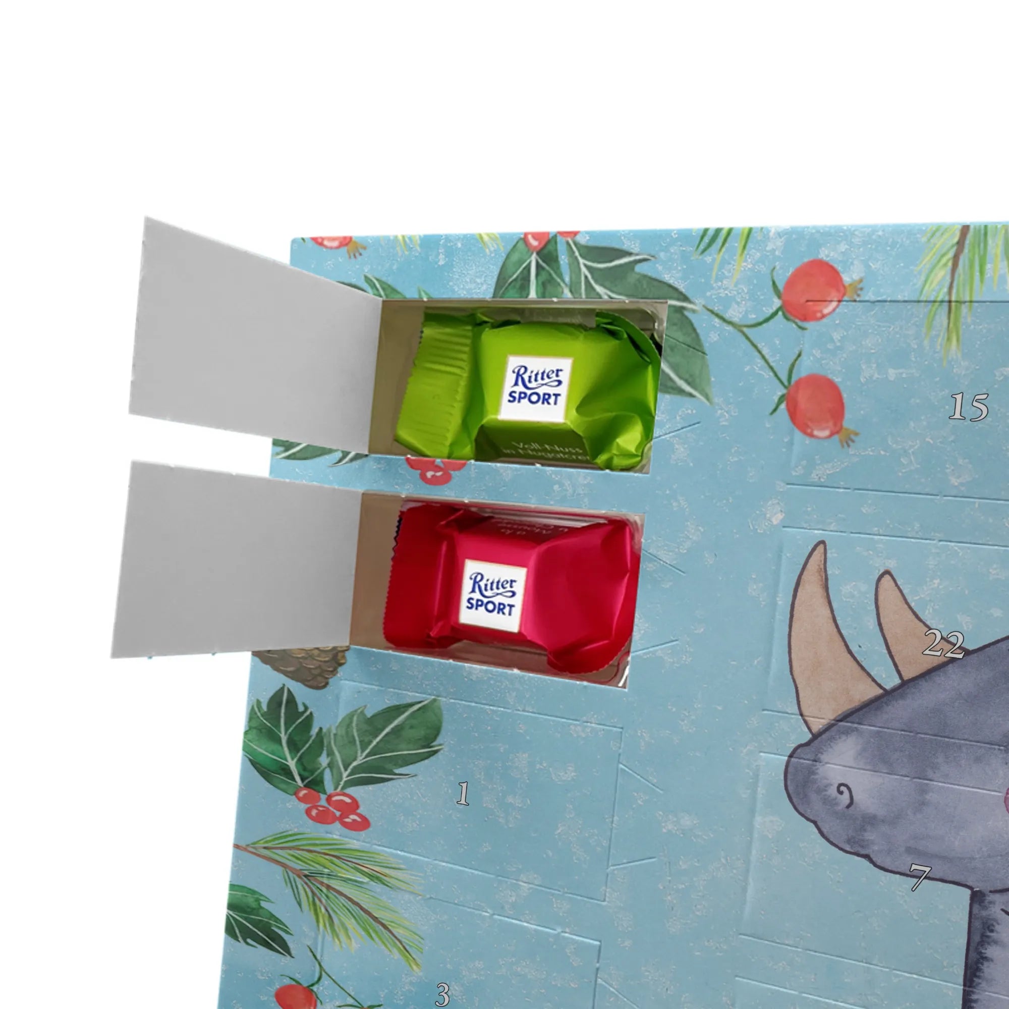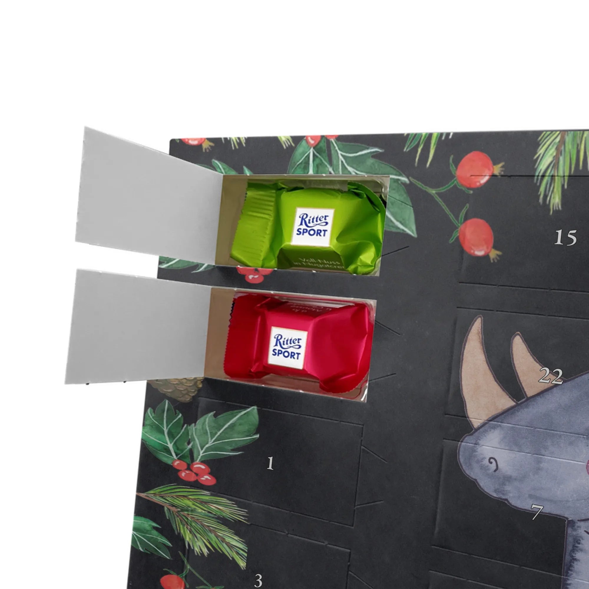 Adventskalender mit Schokolade – so schmeckt Vorfreude! Unser Mr. & Mrs. Panda Adventskalender ist liebevoll gestaltet und bedruckt mit wunderschönen Motiven & Sprüchen, die jeden Tag versüßen. Die brillante Druckqualität mit seidenmatter Oberflächenveredelung sorgt für ein edles Finish, und auch die Seitenflächen sind hübsch bedruckt. Der Kalender ist nicht personalisierbar, dafür aber vielseitig einsetzbar: Maße: 325 mm x 225 mm x 27 mm und die besondere Eigenschaft, dass du ihn aufgehängt oder aufgestellt verwenden kannst, geben dir Flexibilität bei der Dekoration. Gefüllt ist der Kalender mit Ritter Sport Schokowürfeln in beliebten Geschmacksrichtungen wie Mousse au Chocolat, Schoko Crisp, Voll-Nuss in Nougatcreme, Karamell Duo, Joghurt und Erdbeer-Joghurt. Wichtig: Es handelt sich um einen Kalender gefüllt mit Ritter Sport Schokolade, nicht um einen Kalender der Marke Ritter Sport. Ideal als Geschenk oder als Adventsdeko für dein Zuhause – kleine Schokofreuden warten hinter jedem Türchen.