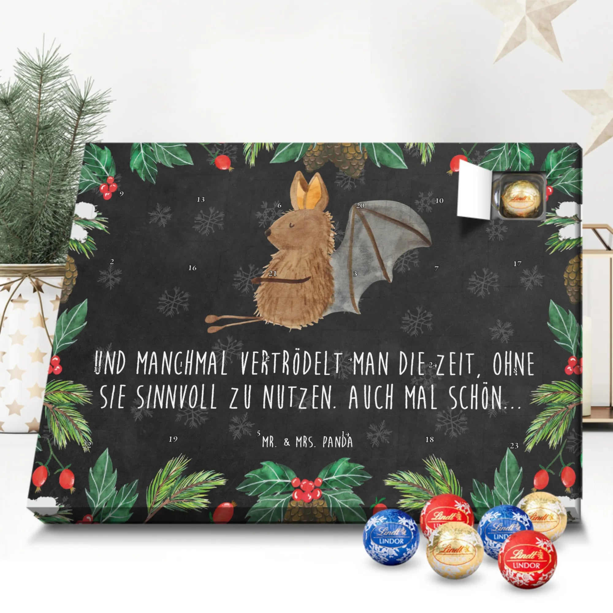 Unser zauberhafter Schoko Adventskalender von Mr. & Mrs. Panda bringt dir die süßeste Vorfreude auf Weihnachten! Dieser liebevoll gestaltete Adventskalender ist bedruckt mit wunderschönen Motiven & Sprüchen von Mr. & Mrs. Panda und ist nicht personalisierbar – dafür aber ein perfektes Geschenk für Freunde und Familie. Brillante Druckqualität mit seidenmatter Oberflächenveredelung sorgt für ein edles Finish, und die bedruckten Seitenflächen machen den Kalender von allen Seiten zu einem Hingucker. Maße: 233 mm x 178 mm x 24 mm. Besonderheit: kann aufgehängt oder aufgestellt werden, je nachdem, wie du ihn präsentieren möchtest. Gefüllt mit Lindt Lindor: 24 einzeln verpackte Markenschokoladen Kugeln in drei verschiedenen Sorten – Vollmilch, Feinherb und Weiße Schokolade – sorgen für abwechslungsreichen Genuss in der Adventszeit. Zutaten: Zucker, pflanzliches Fett (Kokosnuss, Palmkern), Kakaobutter, Vollmilchpulver, Kakaomasse, Milchzucker, Magermilchpulver, Butterreinfett, Emulgator (Sojalecithin), Gerstenmalzextrakt, Aromen. Besondere Hinweise: Kann Haselnüsse und Mandeln enthalten. Unser Schoko Adventskalender verbindet niedliches Design mit hochwertiger Füllung – ideal zum Verschenken oder selbst Naschen. Mr. & Mrs. Panda wünschen dir eine fröhliche und leckere Adventszeit!