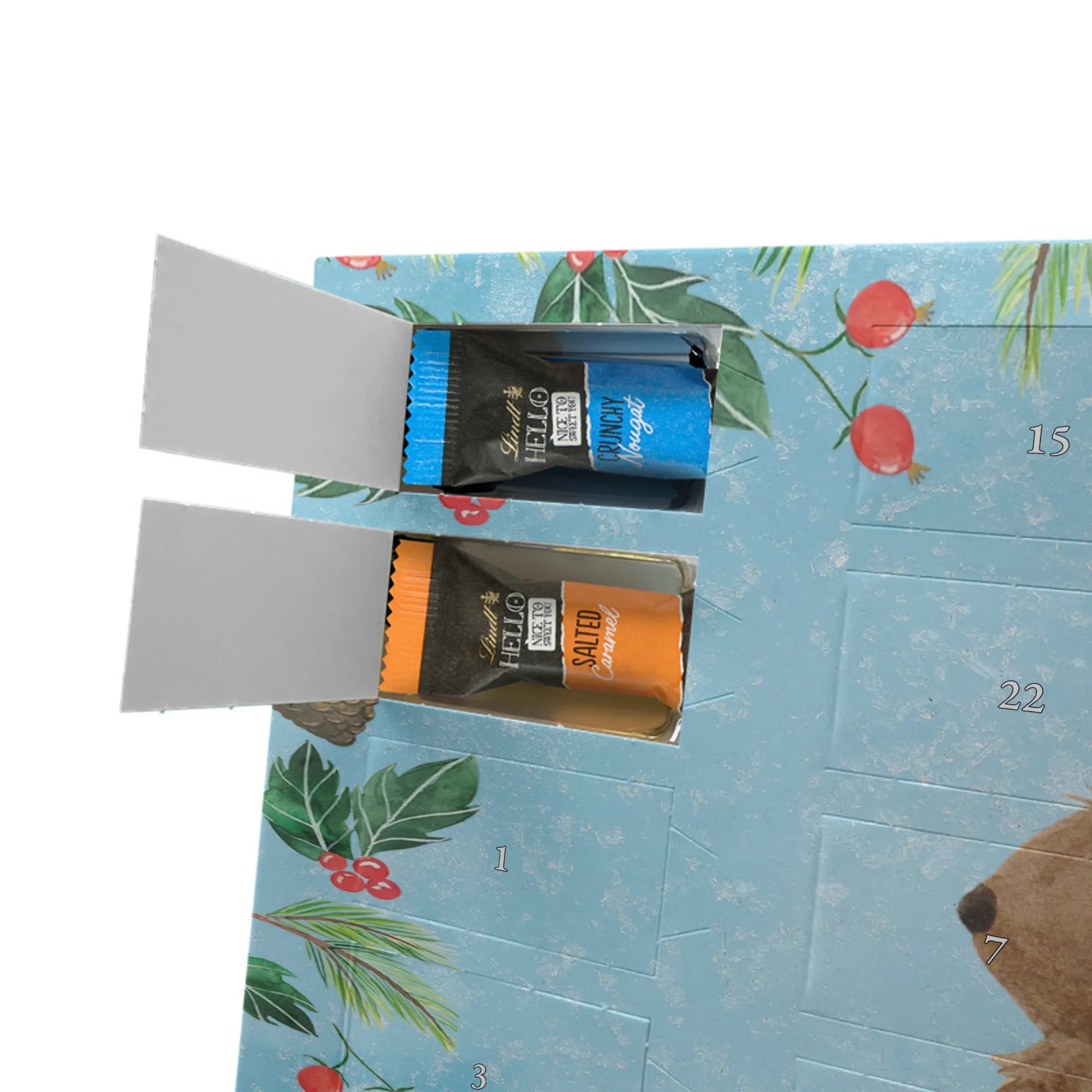 Unser Adventskalender mit Schokolade von Mr. & Mrs. Panda ist die perfekte Mischung aus süßem Genuss und hübschem Design. Bedruckt mit liebevollen Motiven und kurzen Sprüchen, bringt dieser Adventskalender Freude in jeden Raum. Er ist nicht personalisierbar, überzeugt jedoch durch eine brillante Druckqualität und eine seidenmatte Oberflächenveredelung. Die Seitenflächen sind ebenfalls bedruckt, was dem Kalender ein rundes, hochwertiges Erscheinungsbild verleiht. Maße: 325 mm x 225 mm x 27 mm. Die Besonderheit: Du kannst ihn sowohl aufhängen als auch aufstellen – flexibel je nach Platz und Stimmung. Gefüllt mit Lindt Hello Schokolade: 24 einzeln verpackte Mini Sticks in vier verführerischen Sorten – Karamell-Schokoladenkuchen, Kekse, Knuspriger Nougat und Erdbeer-Cheesecake. Zutaten umfassen u. a. Zucker, Kakaomasse, Vollmilchpulver, Palmöl und Haselnüsse; Allergene: Milcheiweiß, Milchzucker, Soja, Weizen, Haselnüsse; kann Mandeln und andere Schalenfrüchte enthalten. Ideal zum Verschenken oder selbst Genießen – jeden Tag ein kleines Highlight in der Vorweihnachtszeit.