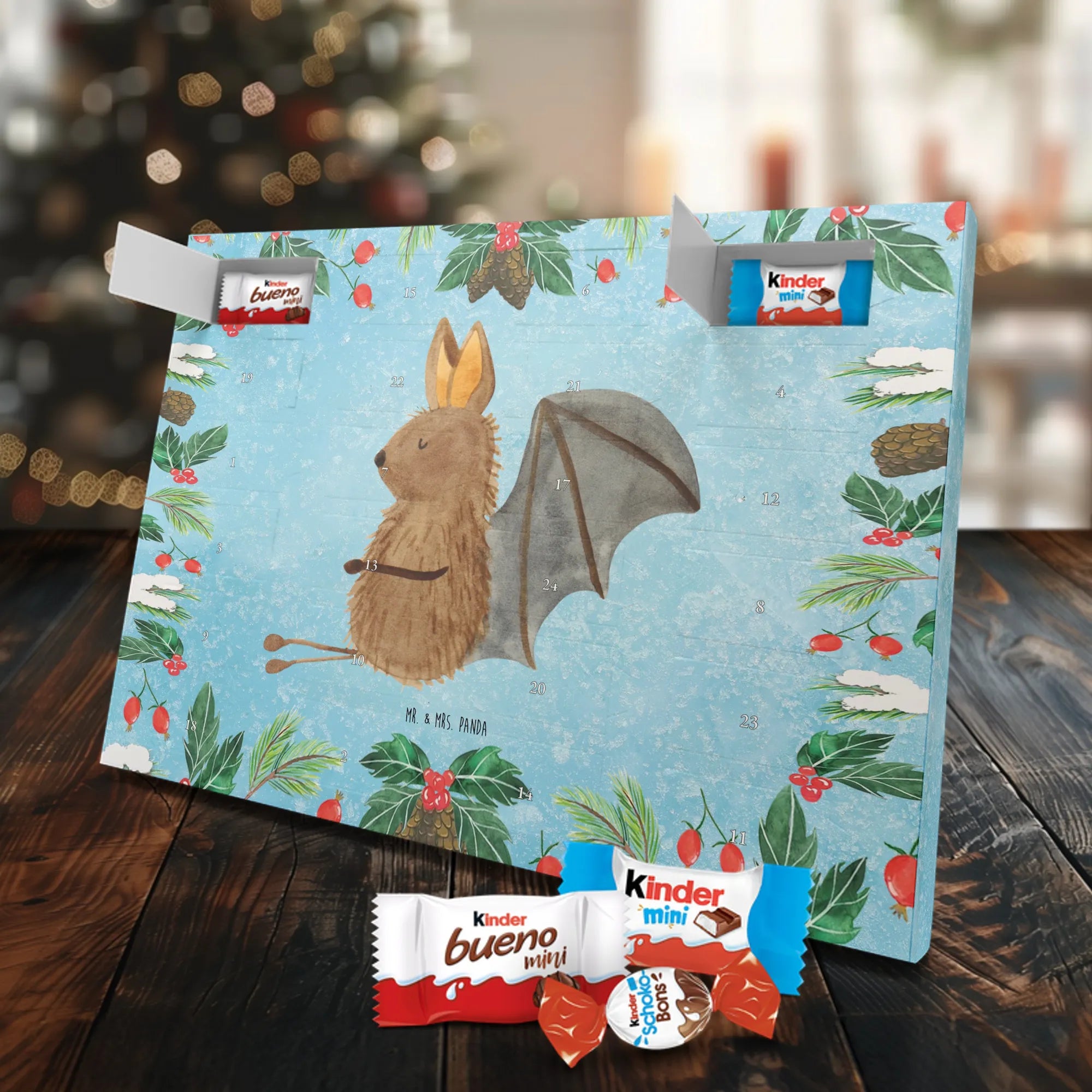 Wunderschöner Schoko Adventskalender von Mr. & Mrs. Panda – perfekt, wenn du die Vorweihnachtszeit mit einem liebevoll gestalteten Kalender versüßen möchtest. Unser Kalender ist bedruckt mit wunderschönen Motiven & Sprüchen von Mr. & Mrs. Panda und eignet sich hervorragend als Geschenk für Freunde, Familie oder einfach für dich selbst. Er ist nicht personalisierbar, dafür aber mit viel Liebe zum Detail gestaltet. Die brillante Druckqualität mit seidenmatter Oberflächenveredelung sorgt für edles Aussehen, und die bedruckten Seitenflächen geben dem Kalender einen wertigen Gesamteindruck. Maße: 355 mm x 245 mm x 11 mm. Besonderheit: kann aufgehängt oder aufgestellt werden – so findest du immer den perfekten Platz bei dir zuhause. Gefüllt mit Markenname Schokolade: Adventskalender gefüllt mit kinder® Schokolade. Inhalt: kinder® Schoko-Bons, kinder® Bueno mini und kinder® Schokolade mini. Der Kalender bietet 24 Türchen mit kleinen Überraschungen, die Kinderherzen höherschlagen lassen und Erwachsene schmunzeln. Er ist robust verarbeitet und ideal für den täglichen Genuss in der Adventszeit. Ob dekorativ auf der Kommode oder an der Wand aufgehängt – er bringt Freude und süße Momente in die Vorweihnachtszeit. Bestelle jetzt und mach dir oder deinen Lieben die Adventszeit ein bisschen süßer!