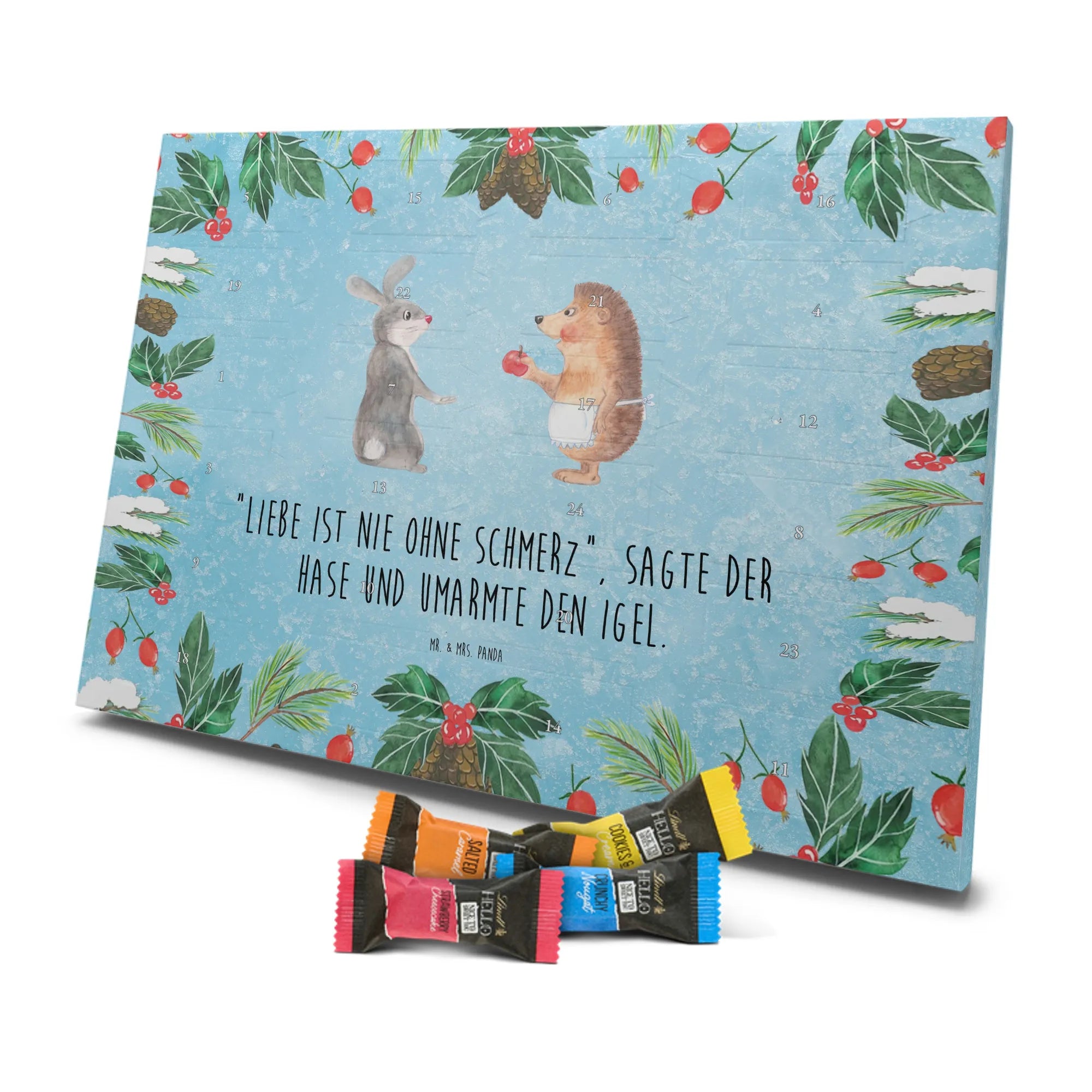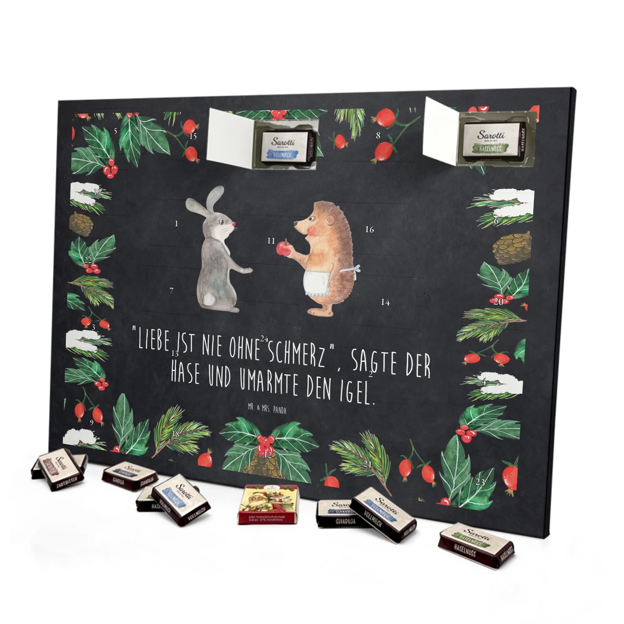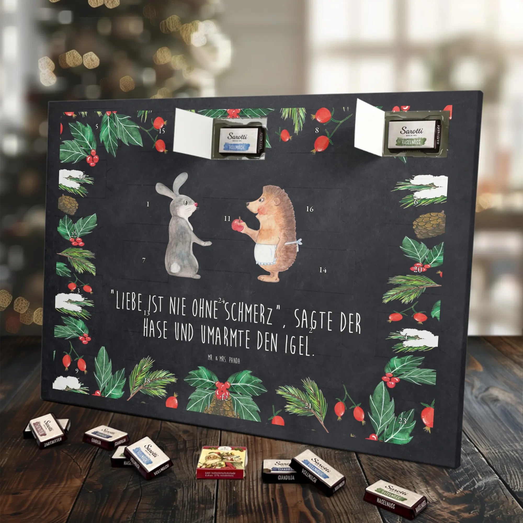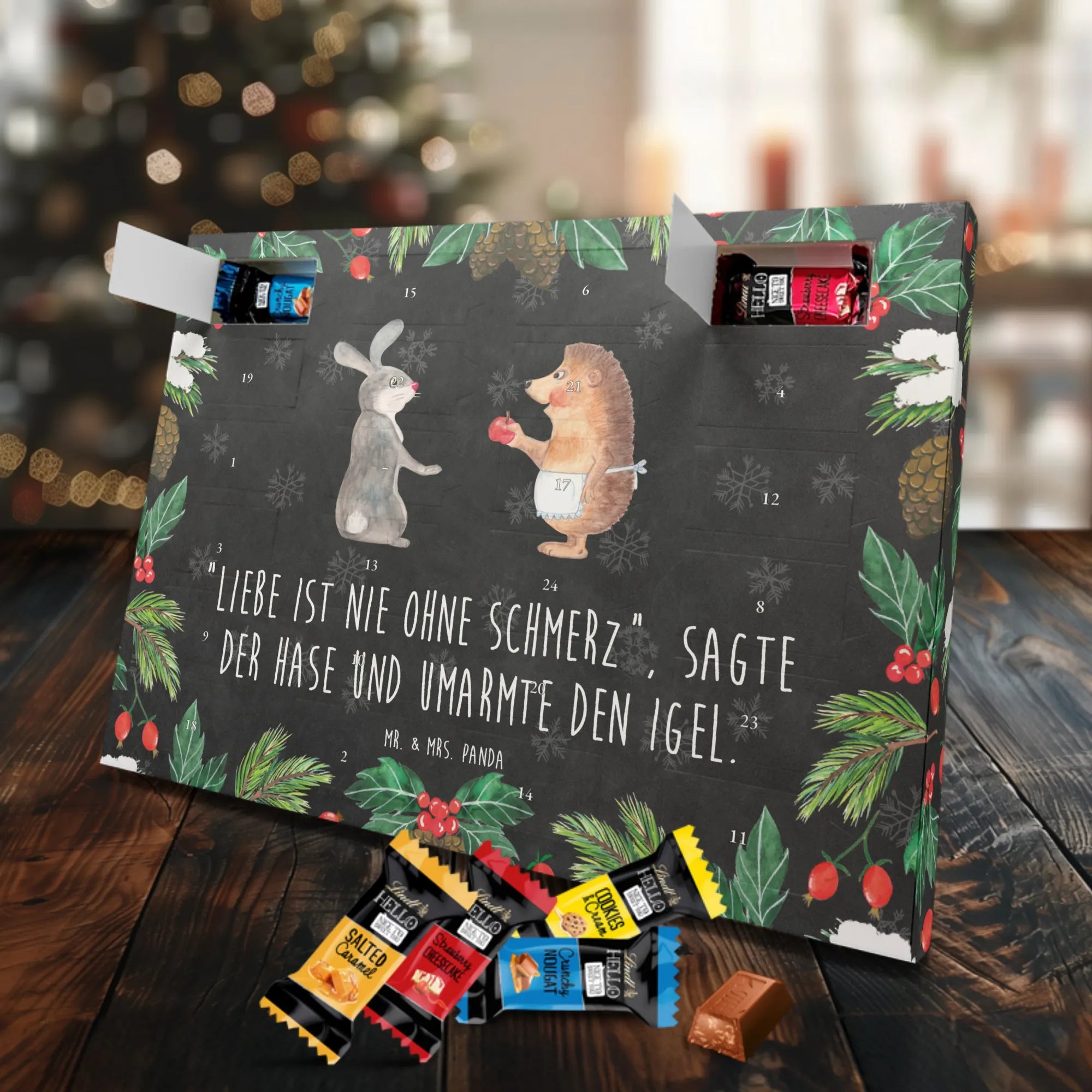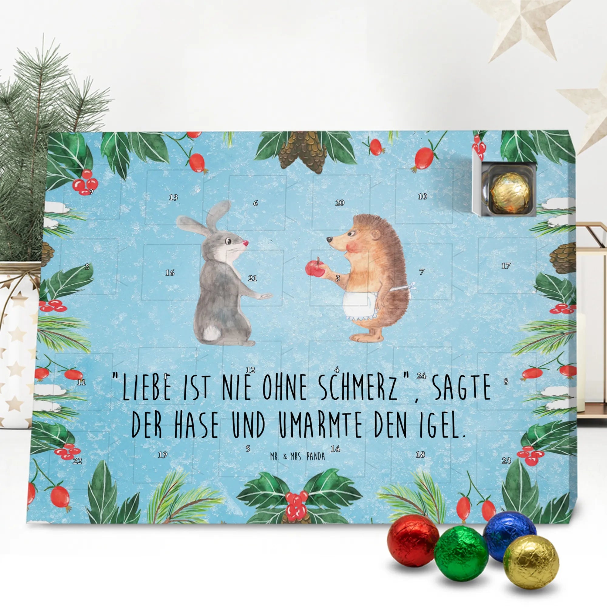Mr. & Mrs. Panda Schoko Adventskalender „Liebe ist nie ohne Schmerz“ – ein zärtliches Geschenk aus der Small World Kollektion. Das liebevoll illustrierte Motiv mit dem Hasen und dem Igel trägt den versöhnlichen Spruch „Liebe ist nie ohne Schmerz“, sagte der Hase und umarmte den Igel. und erinnert daran, dass Liebe trotz Schmerz schön und tröstlich sein kann.