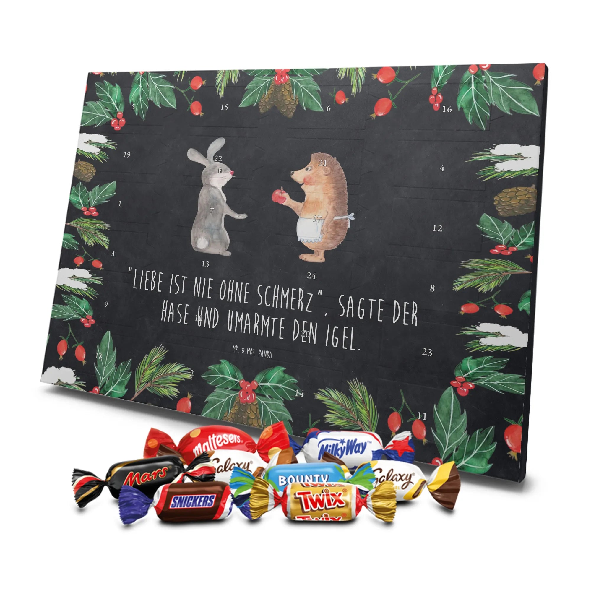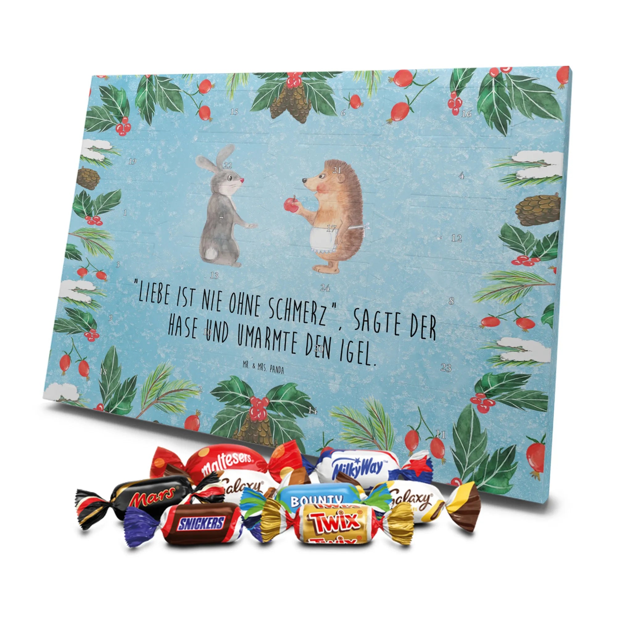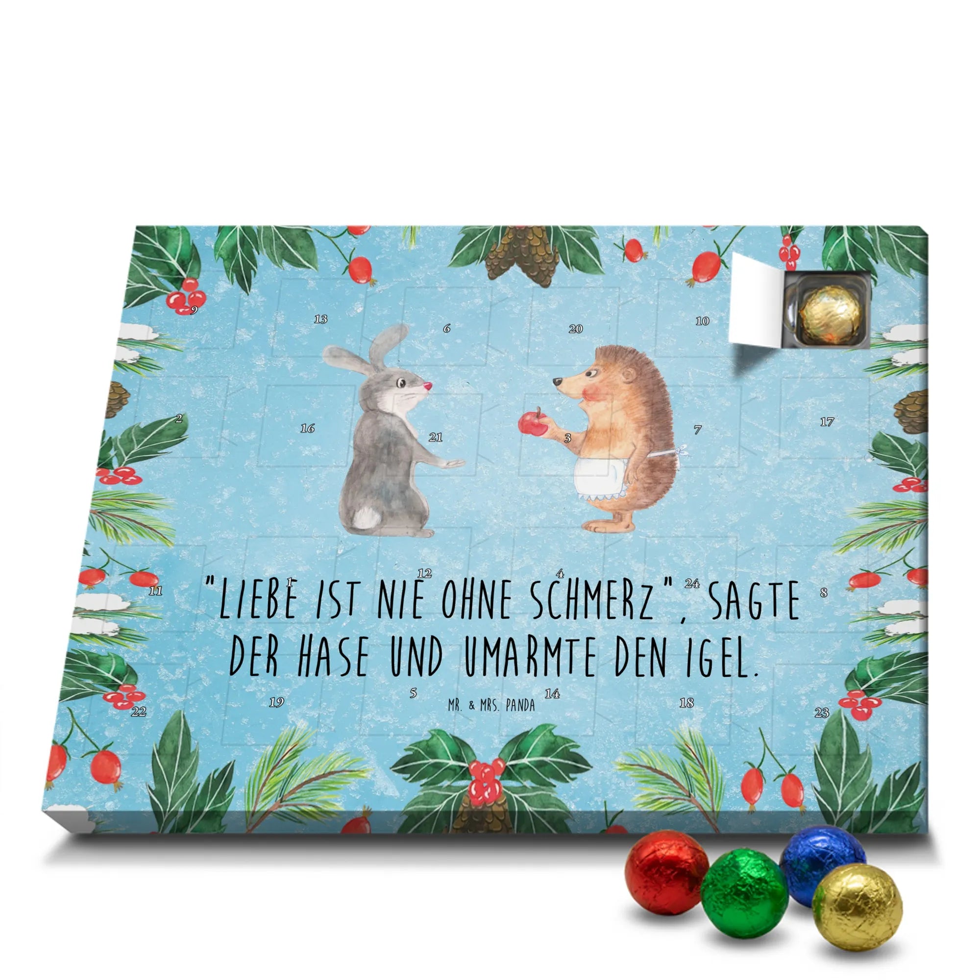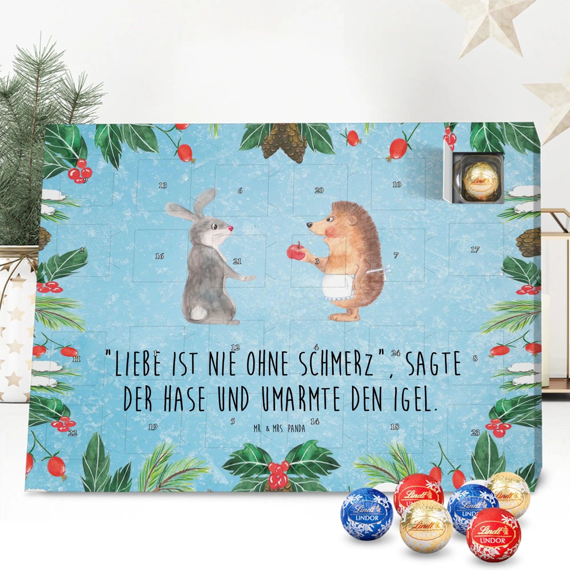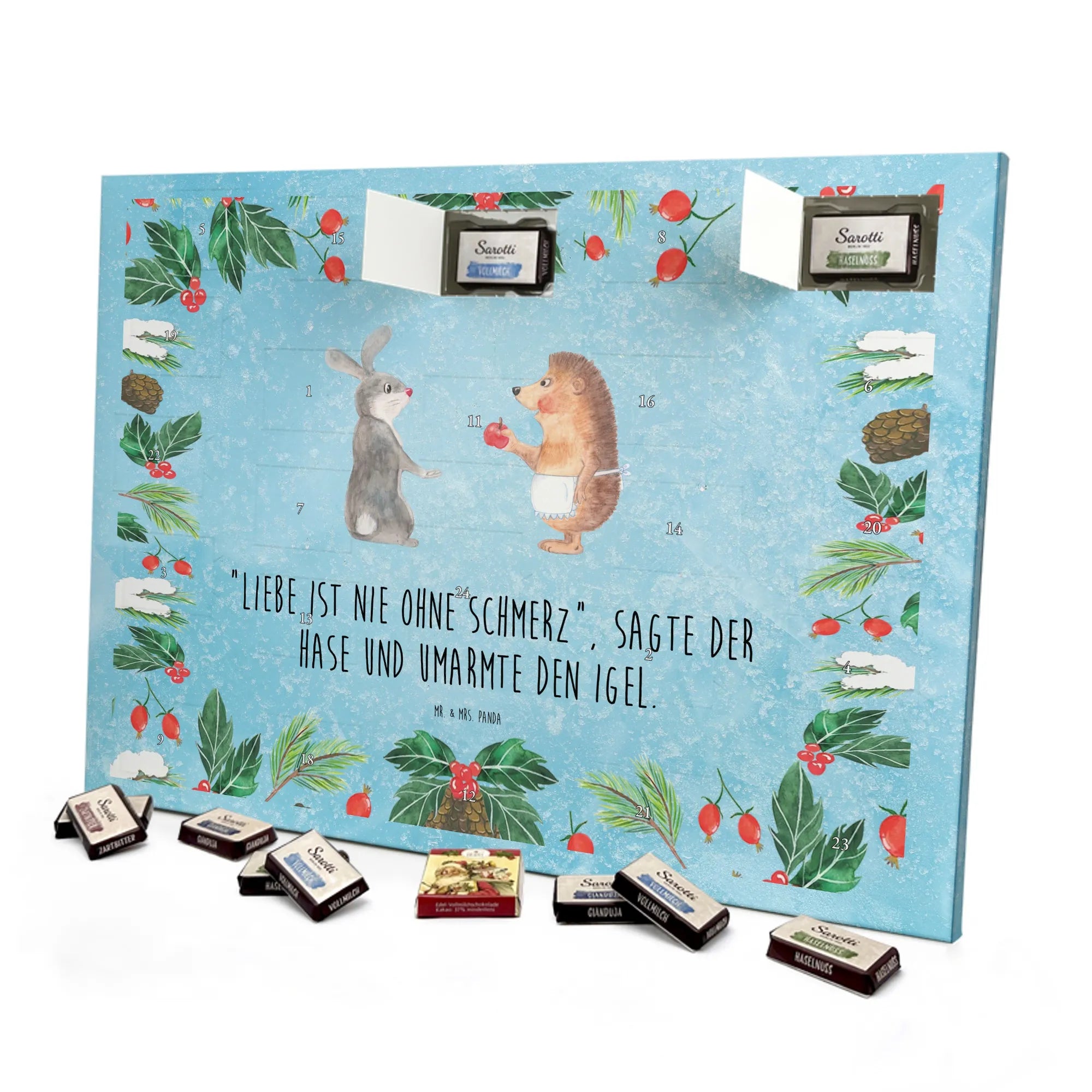 Mr. & Mrs. Panda Schoko Adventskalender „Liebe ist nie ohne Schmerz“ – ein zärtliches Geschenk aus der Small World Kollektion. Das liebevoll illustrierte Motiv mit dem Hasen und dem Igel trägt den versöhnlichen Spruch „Liebe ist nie ohne Schmerz“, sagte der Hase und umarmte den Igel. und erinnert daran, dass Liebe trotz Schmerz schön und tröstlich sein kann.