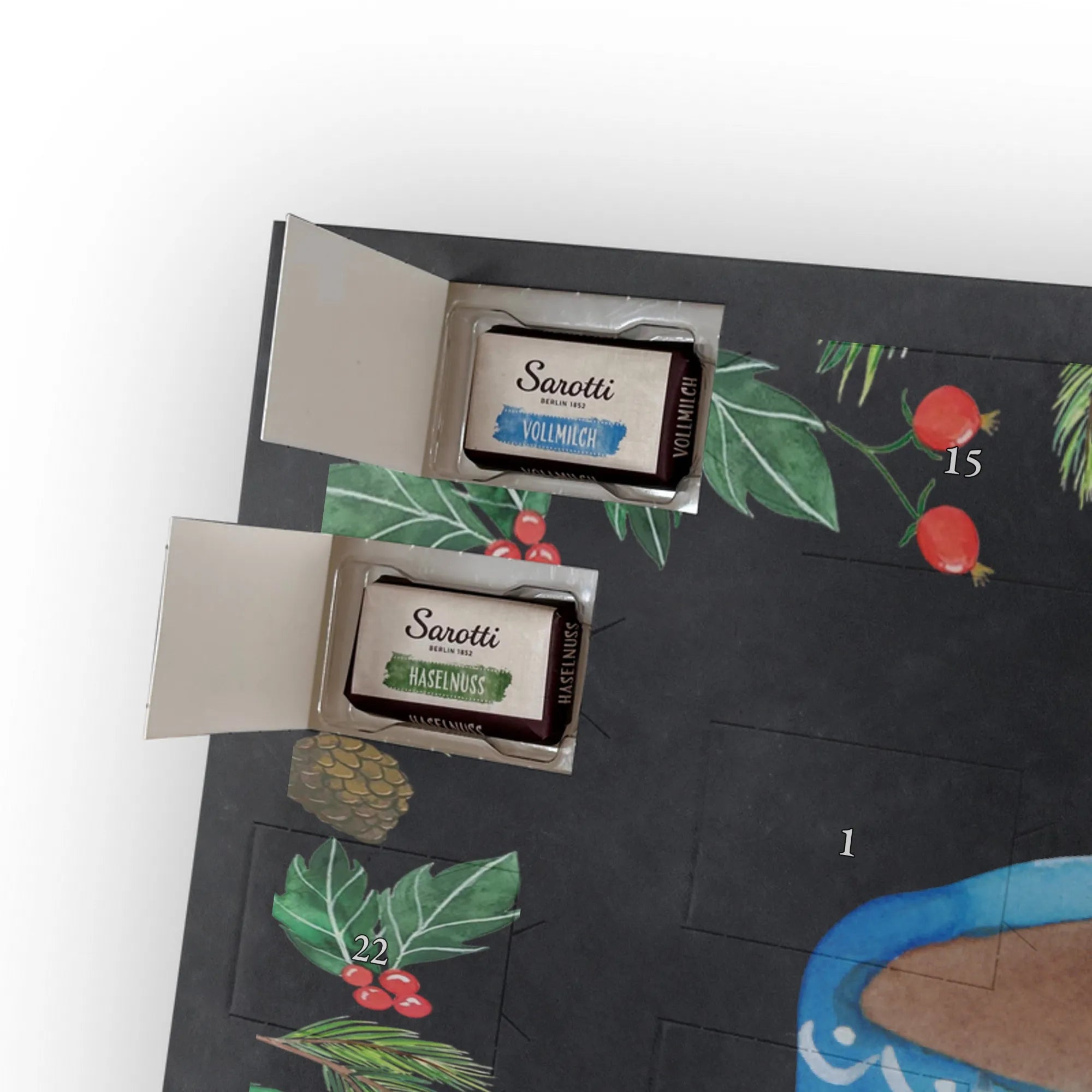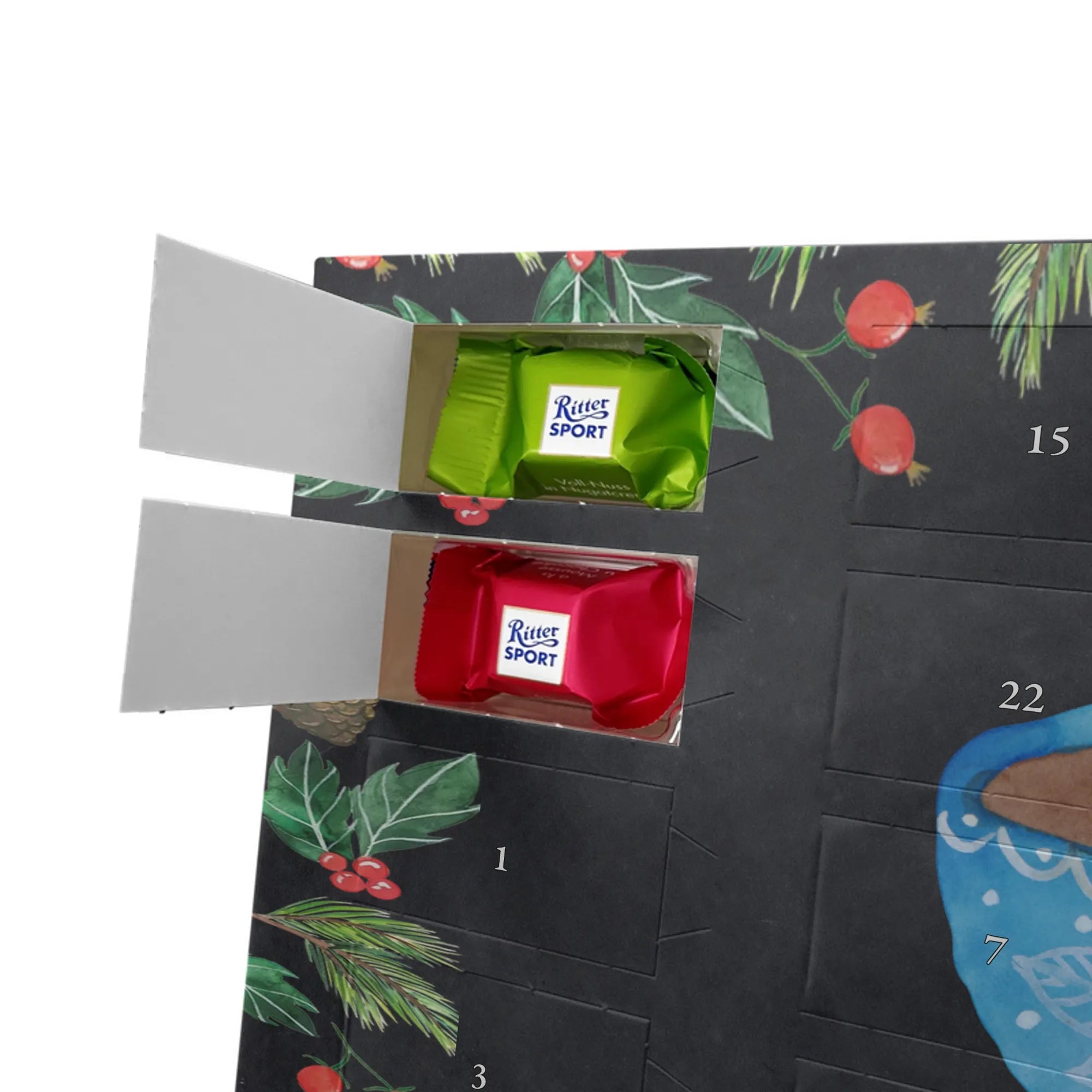 Täglicher Genuss in hübscher Verpackung: Hinter 24 Türchen verstecken sich leckere Schokoladenkugeln, die jeden Adventsmorgen zu einem kleinen Ritual machen. Die brillante Druckqualität mit seidenmatter Oberflächenveredelung lässt die Aquarell-Illustration und die Kreidetafel-Hintergründe besonders schön zur Geltung kommen.