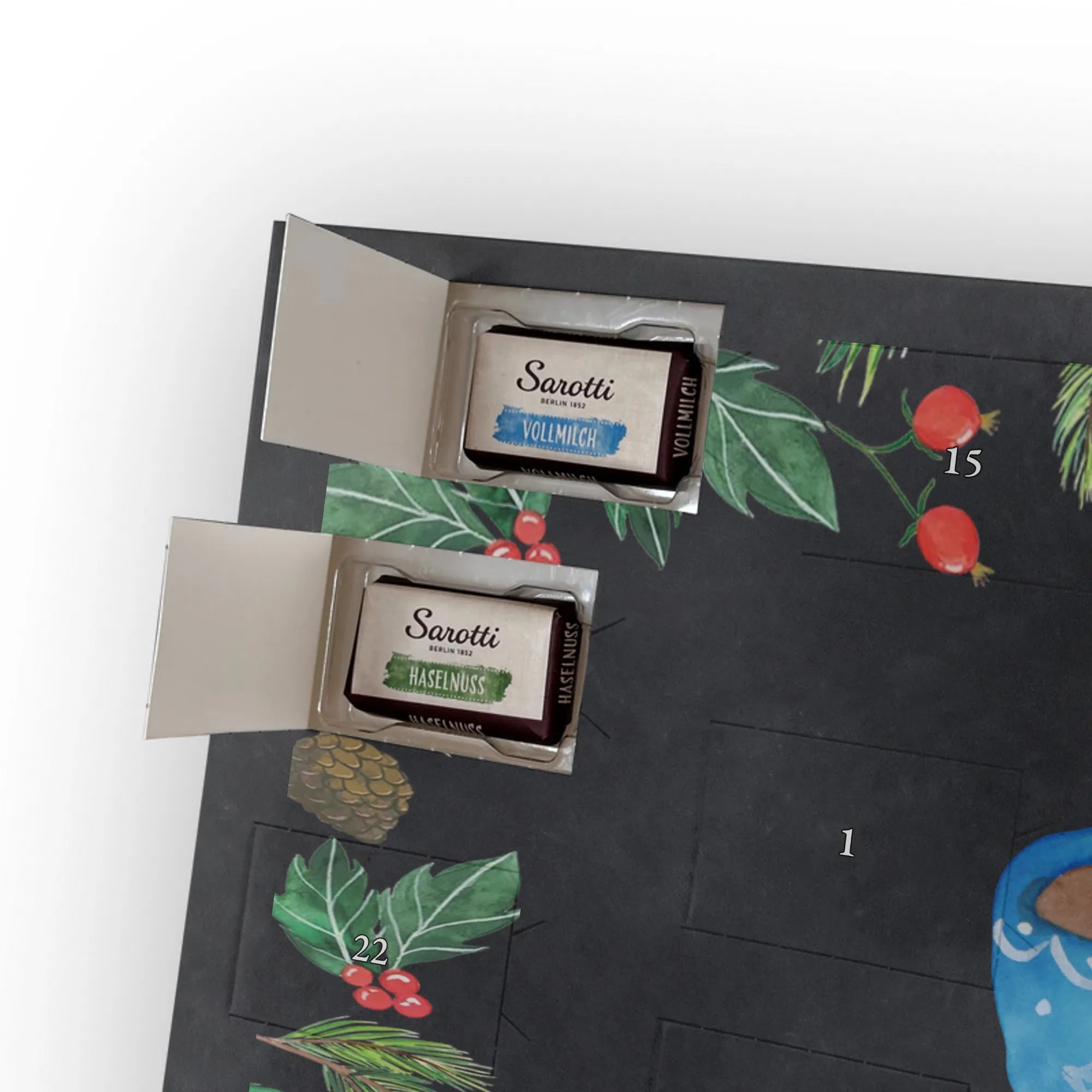 - Gefüllt mit 24 einzeln verpackten Schokoladentäfelchen von Sarotti® und Confiserie Heidel®.
