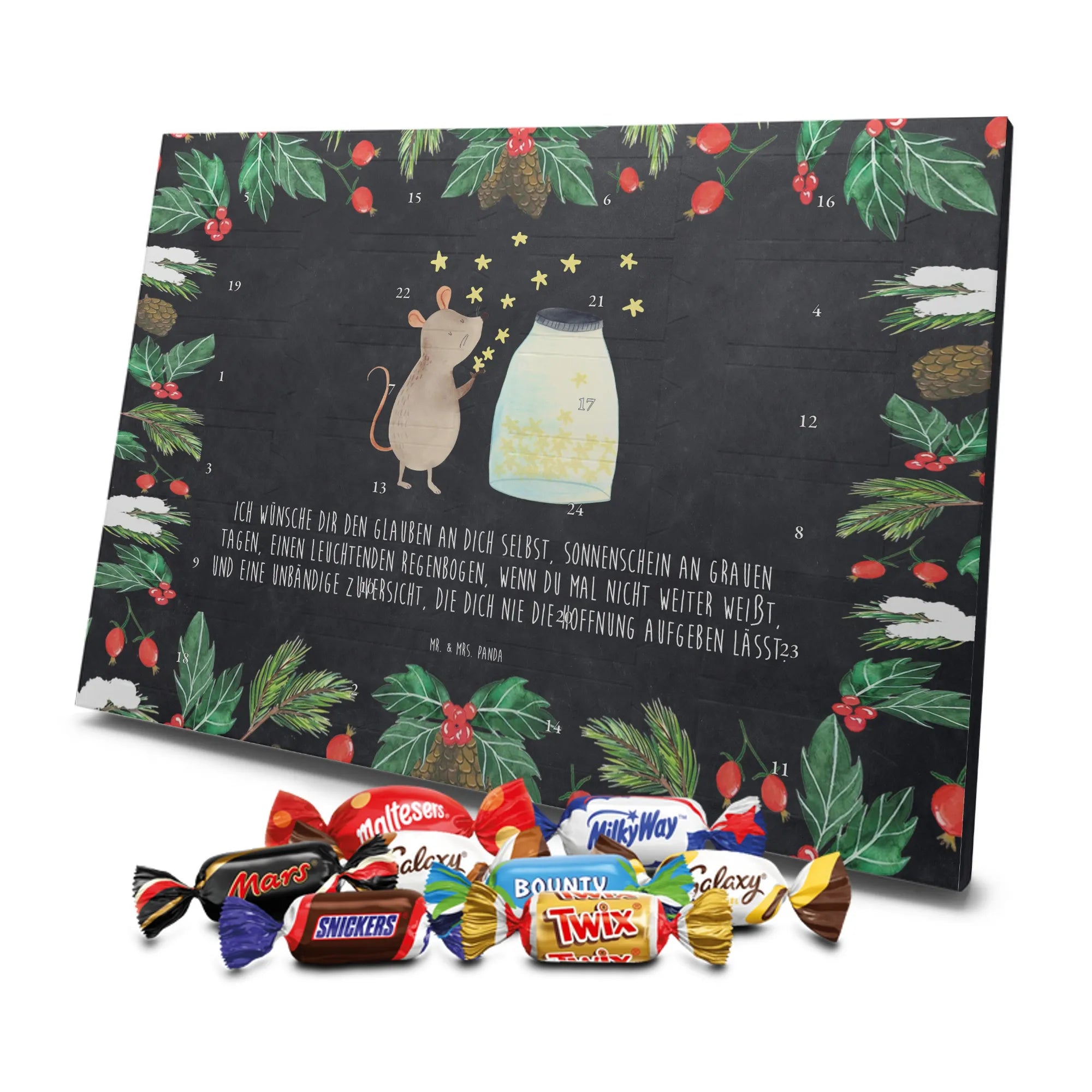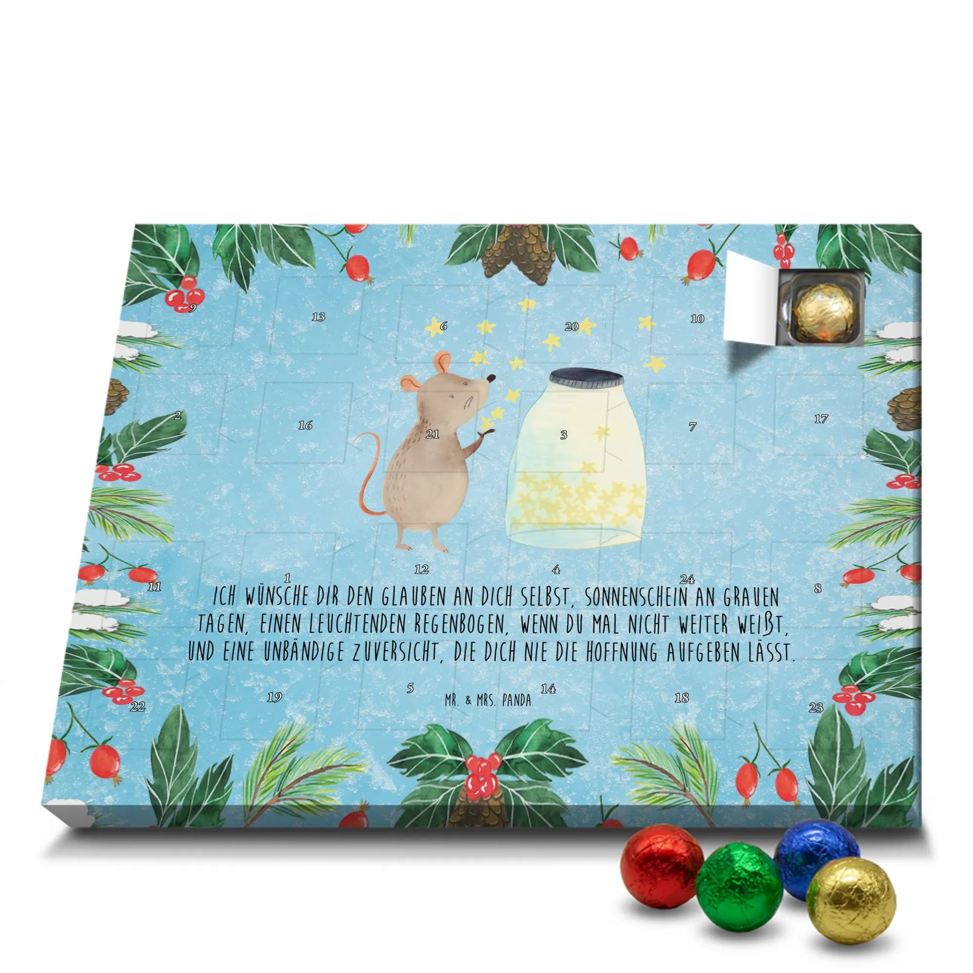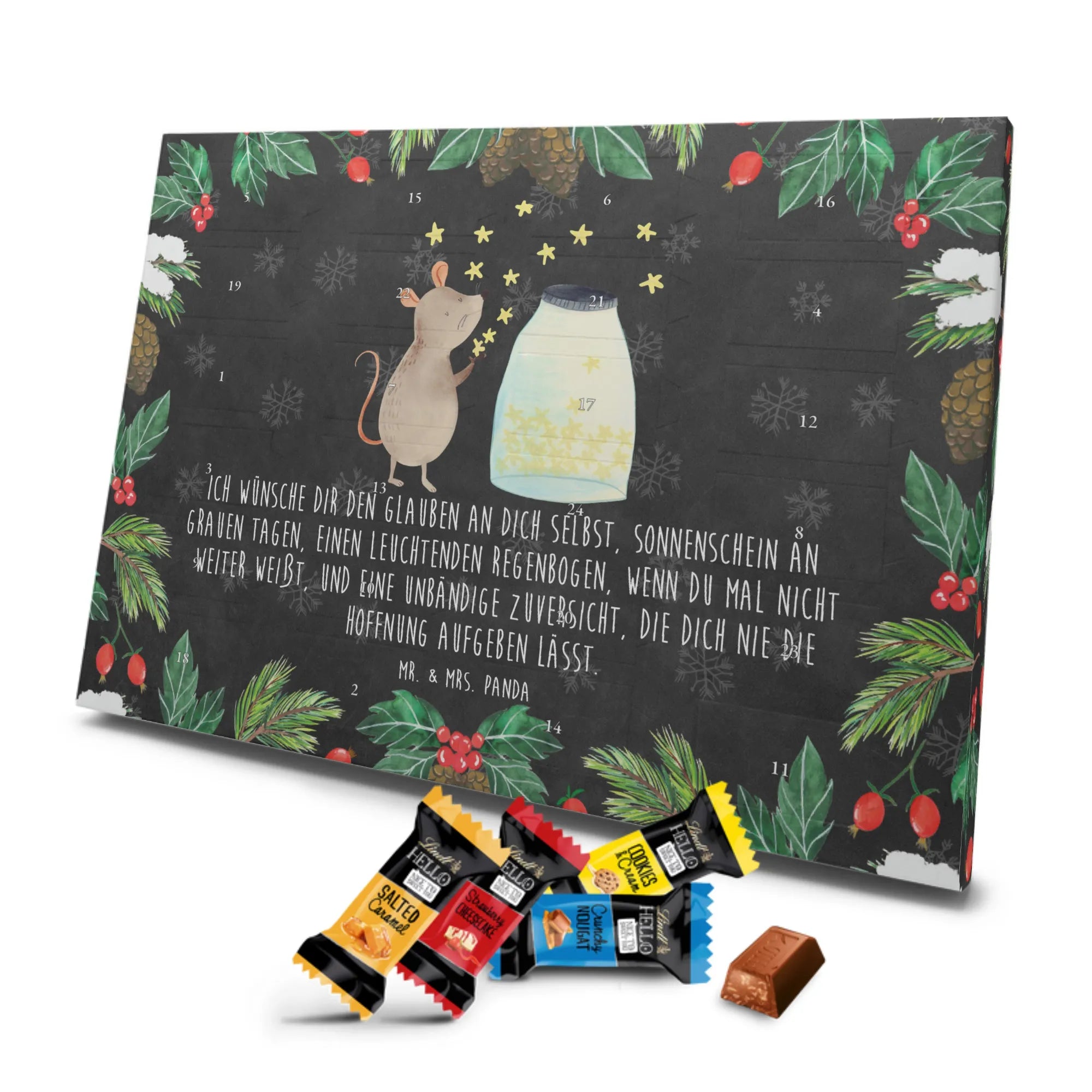 Wunderschöner Adventskalender mit Schokolade von Mr. & Mrs. Panda – für alle, die Advent und Design lieben. Dieser Adventskalender mit Schokolade ist liebevoll bedruckt mit wunderschönen Motiven & Sprüchen von Mr. & Mrs. Panda und ist nicht personalisierbar, aber mit viel Liebe zum Detail gefertigt. Brillante Druckqualität mit seidenmatter Oberflächenveredelung sorgt für einen edlen Look, und die bedruckten Seitenflächen geben dem Kalender eine besondere Optik. Maße: 233 mm x 178 mm x 24 mm. Dank seiner stabilen Verarbeitung kannst du ihn aufstellen oder ganz einfach aufhängen – Besonderheit: kann aufgehängt oder aufgestellt werden. Gefüllt mit MARKENNAMEN Schokolade und leckeren Schokoladenkugeln, bringt er jeden Tag ein kleines Glückserlebnis. Wichtige Hinweise: (Kann Spuren von Haselnüssen, Mandeln, Gluten und Soja enthalten!), bitte kühl und trocken lagern. Ob als Geschenk, Mitbringsel oder Adventsdeko – dieser Kalender zaubert ein Lächeln und sorgt für gemütliche Vorfreude. Viel Freude beim Entdecken der süßen Überraschungen wünscht dir Mr. & Mrs. Panda!