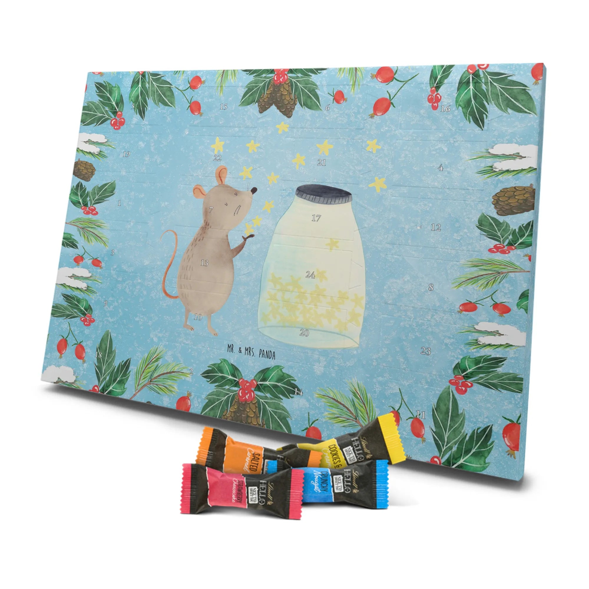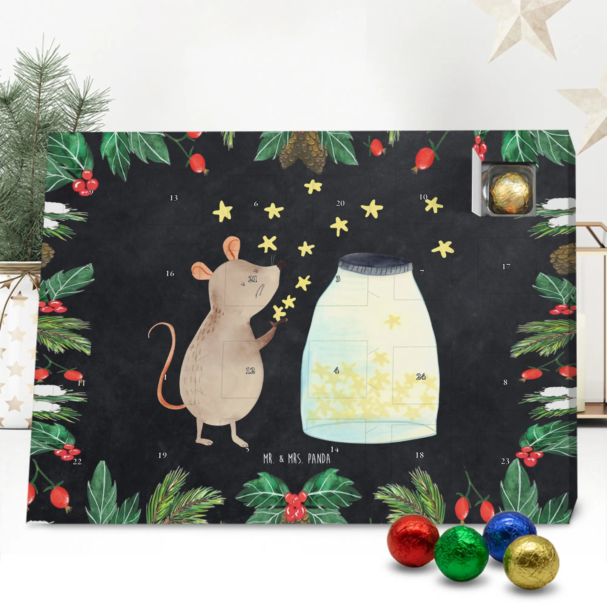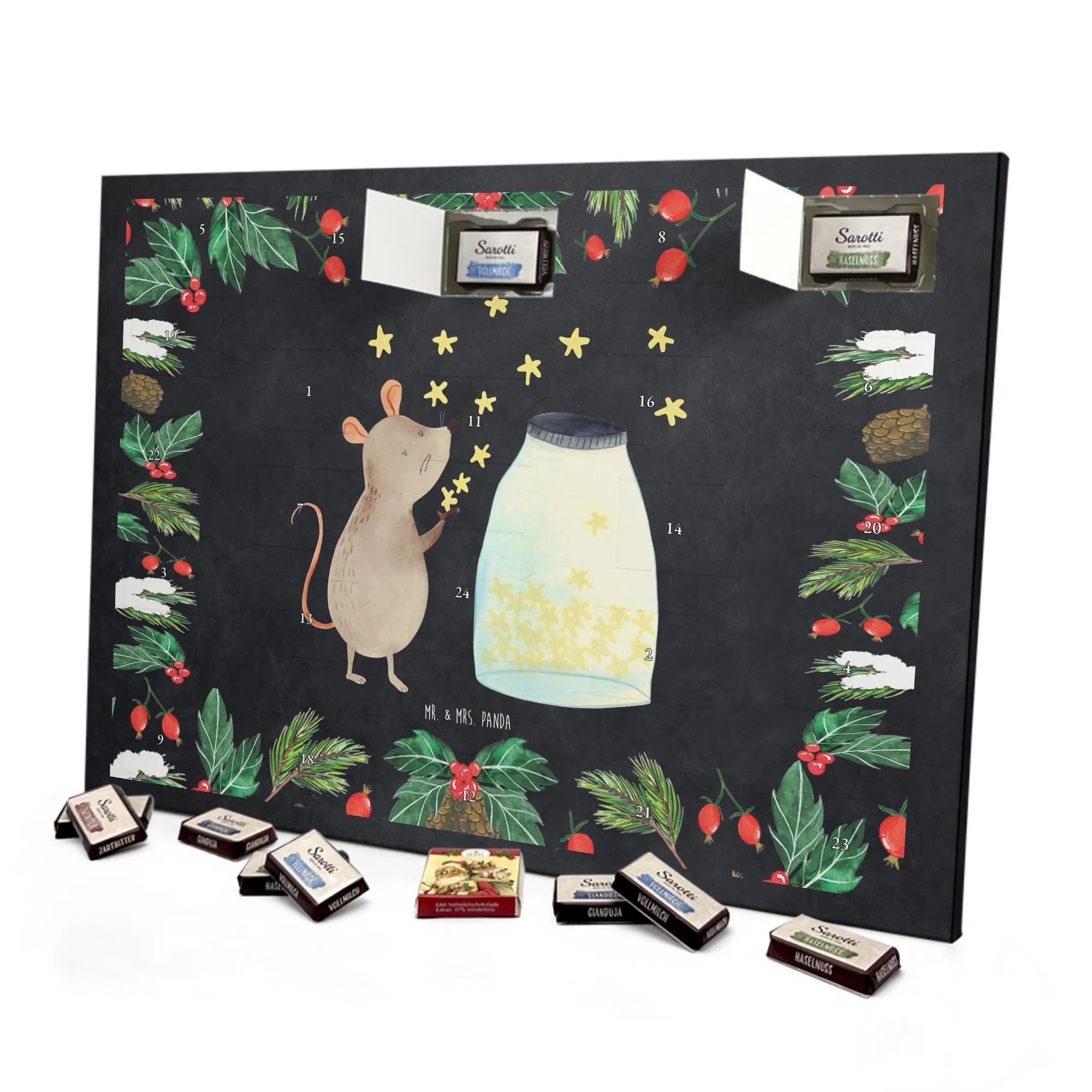 Wunderschöner Adventskalender mit Schokolade von Mr. & Mrs. Panda – für alle, die Advent und Design lieben. Dieser Adventskalender mit Schokolade ist liebevoll bedruckt mit wunderschönen Motiven & Sprüchen von Mr. & Mrs. Panda und ist nicht personalisierbar, aber mit viel Liebe zum Detail gefertigt. Brillante Druckqualität mit seidenmatter Oberflächenveredelung sorgt für einen edlen Look, und die bedruckten Seitenflächen geben dem Kalender eine besondere Optik. Maße: 233 mm x 178 mm x 24 mm. Dank seiner stabilen Verarbeitung kannst du ihn aufstellen oder ganz einfach aufhängen – Besonderheit: kann aufgehängt oder aufgestellt werden. Gefüllt mit MARKENNAMEN Schokolade und leckeren Schokoladenkugeln, bringt er jeden Tag ein kleines Glückserlebnis. Wichtige Hinweise: (Kann Spuren von Haselnüssen, Mandeln, Gluten und Soja enthalten!), bitte kühl und trocken lagern. Ob als Geschenk, Mitbringsel oder Adventsdeko – dieser Kalender zaubert ein Lächeln und sorgt für gemütliche Vorfreude. Viel Freude beim Entdecken der süßen Überraschungen wünscht dir Mr. & Mrs. Panda!