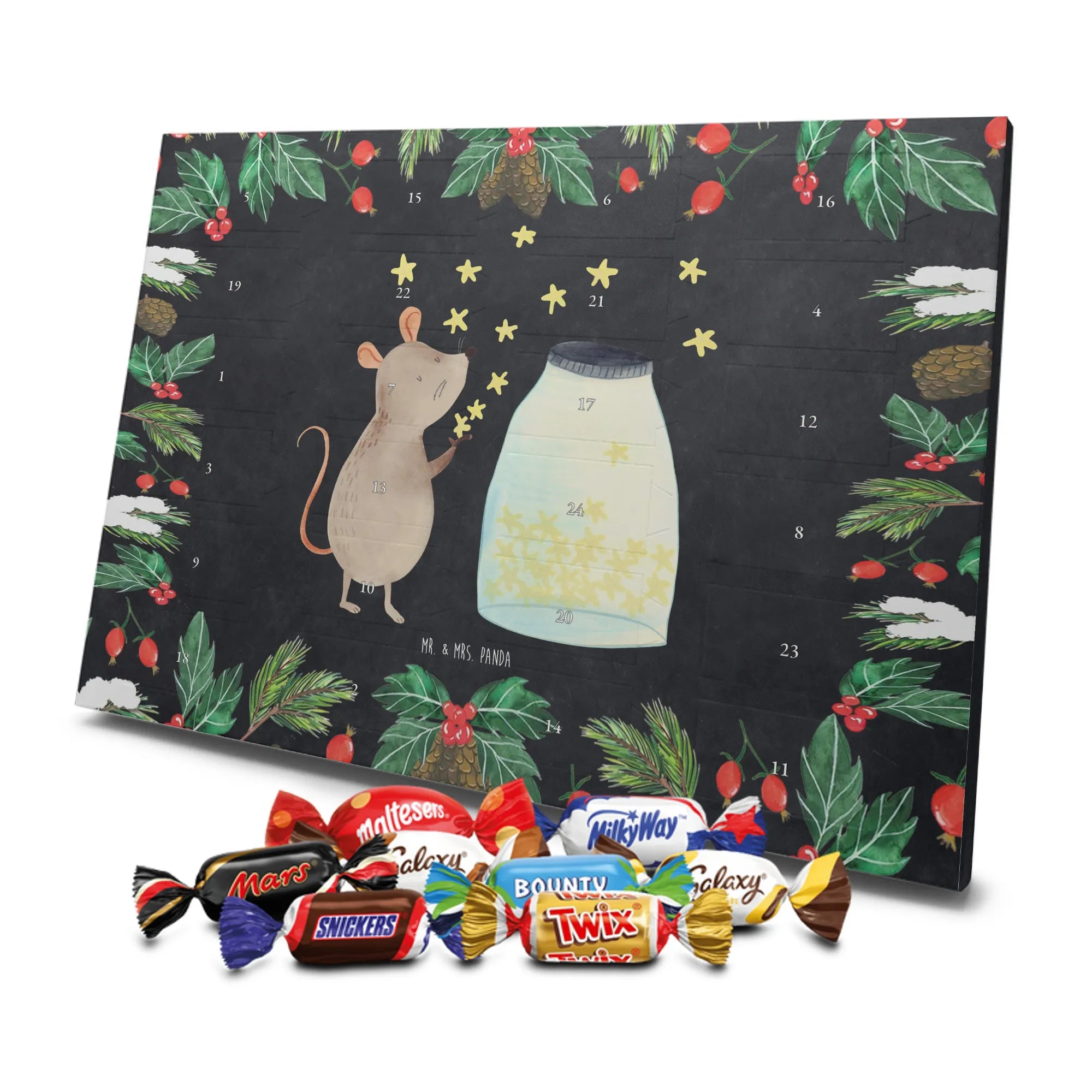 Unser Adventskalender mit Schokolade von Mr. & Mrs. Panda ist ein liebevoll gestaltetes Highlight für die Adventszeit. Die süßen Illustrationen und charmanten Sprüche sorgen für gute Stimmung bei Groß und Klein. Gedruckt in brillanter Qualität mit seidenmatter Oberflächenveredelung, wirken die Farben kräftig und edel; auch die Seitenflächen sind dekorativ bedruckt. Bitte beachten: Der Kalender ist nicht personalisierbar. Gefüllt ist er mit 24 Celebrations-Überraschungen in acht verschiedenen Sorten: Maltesers, Mars, Snickers, Twix, Milky Way, Bounty, Galaxy und Galaxy Caramel — perfekte Abwechslung für jeden Tag. Besonderheit: Du kannst den Kalender sowohl aufstellen als auch aufhängen. Maße: 325 mm x 225 mm x 27 mm. Schenke Vorfreude und kleine Genussmomente – ideal als Geschenk oder für deine eigene Adventszeit.