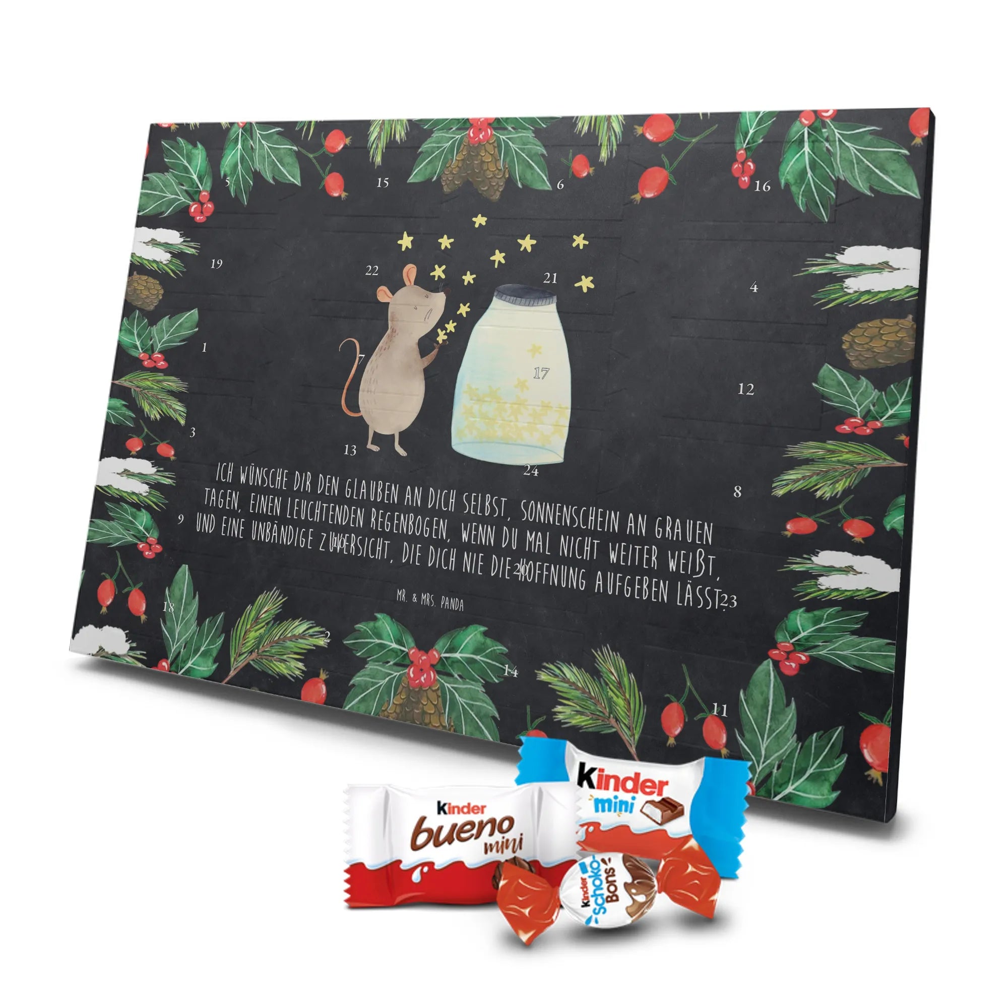Unser Schokoladen Adventskalender von Mr. & Mrs. Panda bringt Charme und süße Überraschungen in deine Adventszeit. Liebevoll bedruckt mit wunderschönen Motiven & Sprüchen von Mr. & Mrs. Panda, ist dieser Kalender nicht personalisierbar, dafür aber mit hochwertiger Verarbeitung und stimmigem Design. Die brillante Druckqualität mit seidenmatter Oberflächenveredelung verleiht jedem Motiv eine edle Optik, und die bedruckten Seitenflächen runden das Gesamtbild ab. Maße: 355 mm x 245 mm x 11 mm. Eine praktische Besonderheit: kann aufgehängt oder aufgestellt werden – so passt er perfekt in jede Deko. Gefüllt mit Markenname Schokolade: Adventskalender gefüllt mit kinder® Schokolade. Inhalt: kinder® Schoko-Bons, kinder® Bueno mini und kinder® Schokolade mini. Mit 24 kleinen Leckereien hinter den Türchen ist dieser Kalender ideal für Kinder und alle Naschkatzen. Er eignet sich wunderbar als Adventsgeschenk oder als liebevolle Aufmerksamkeit für Kollegen und Freunde. Gönn dir oder anderen eine süße Adventszeit mit diesem bezaubernden Schokoladen Adventskalender!
