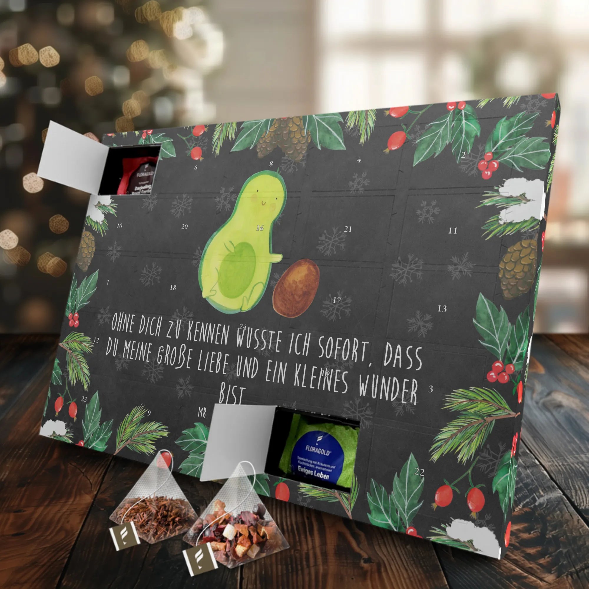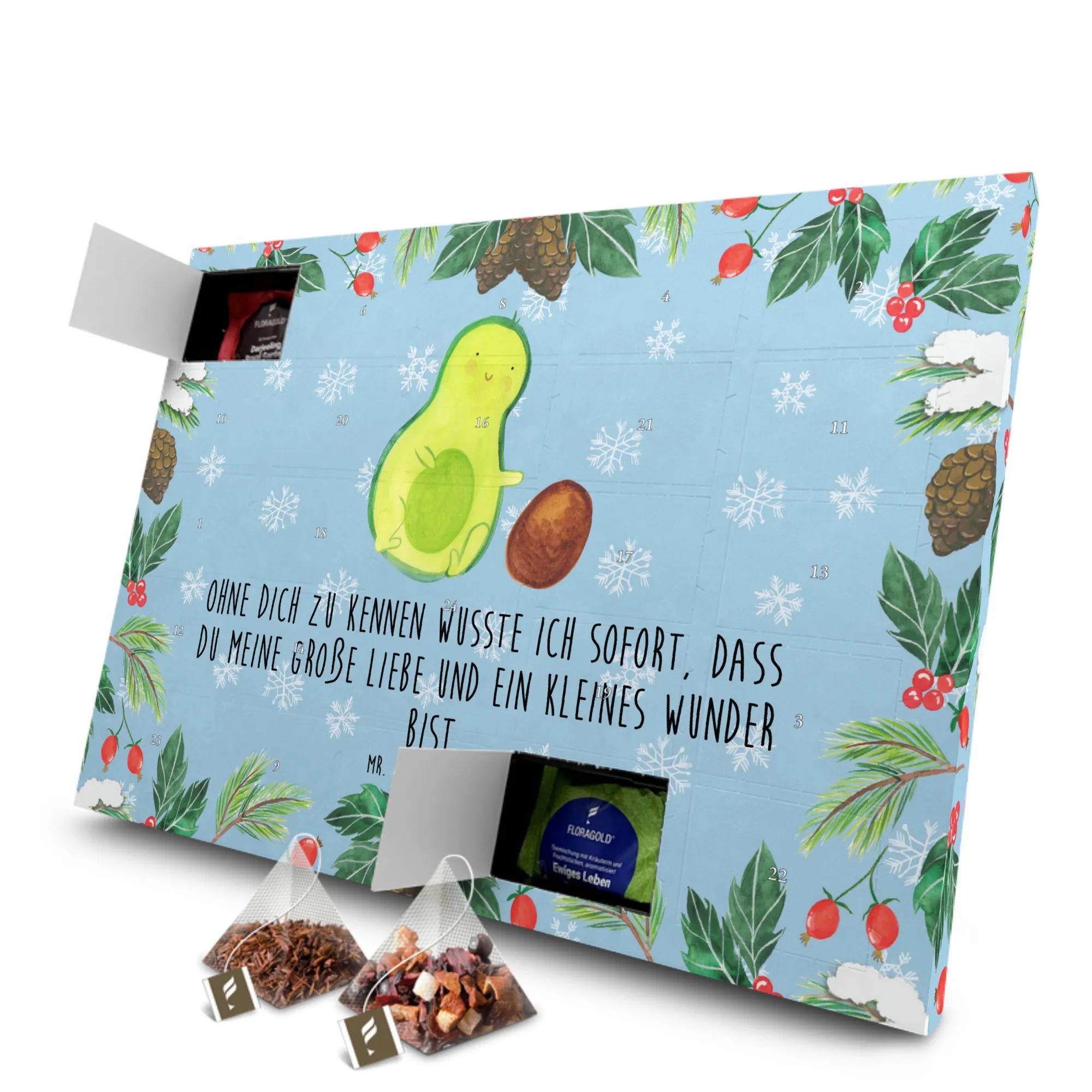 Der Tee Adventskalender "Avocado rollt Kern" von Mr. & Mrs. Panda ist das perfekte Geschenk für alle, die die Frische und den Geschmack der Avocado lieben! Egal, ob zur Schwangerschaft, zur Geburt eines Babys oder als süße Überraschung für die Babyparty – dieser Adventskalender wird sicher Herzen höher schlagen lassen.