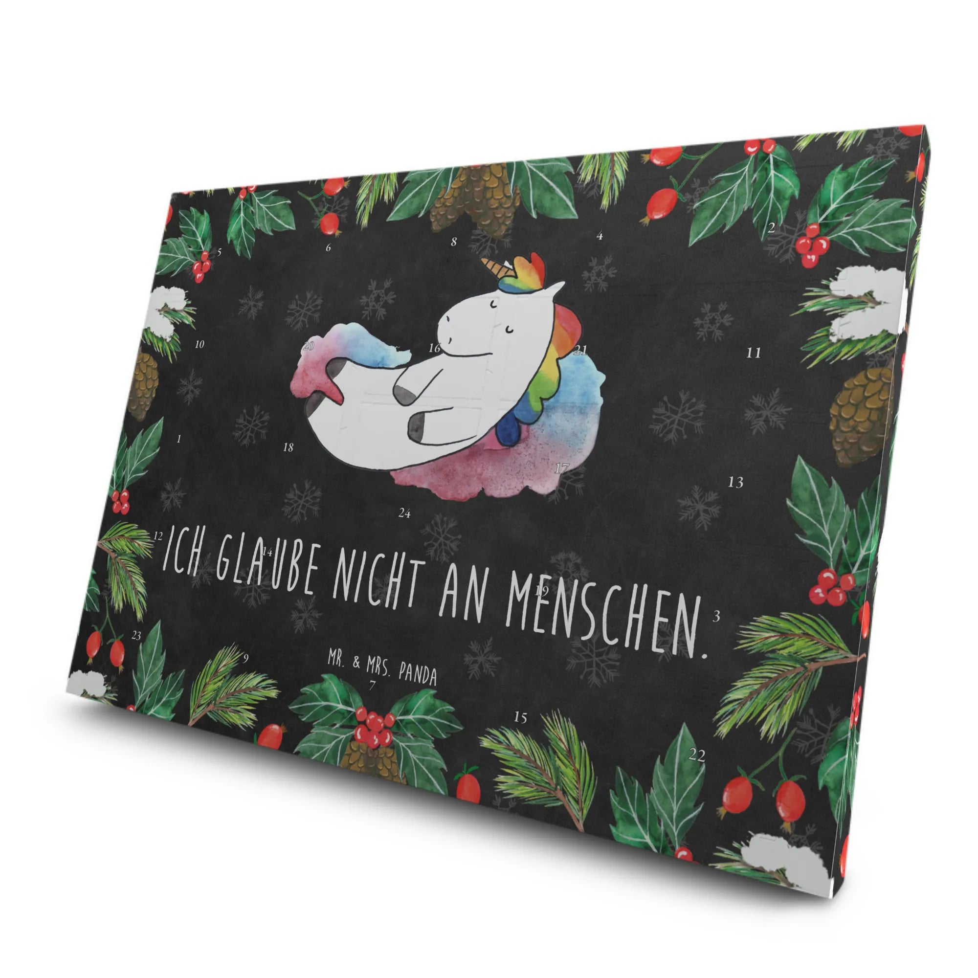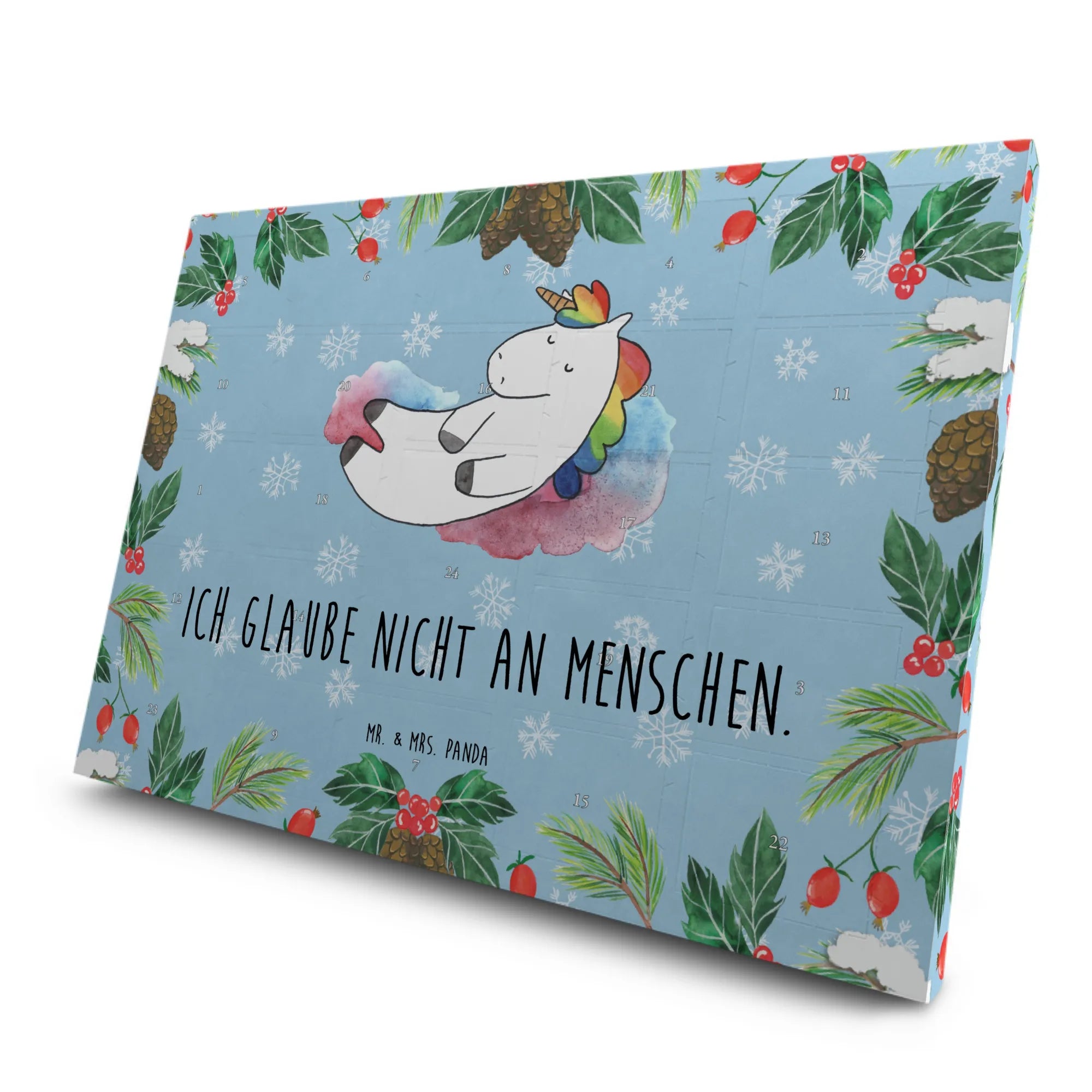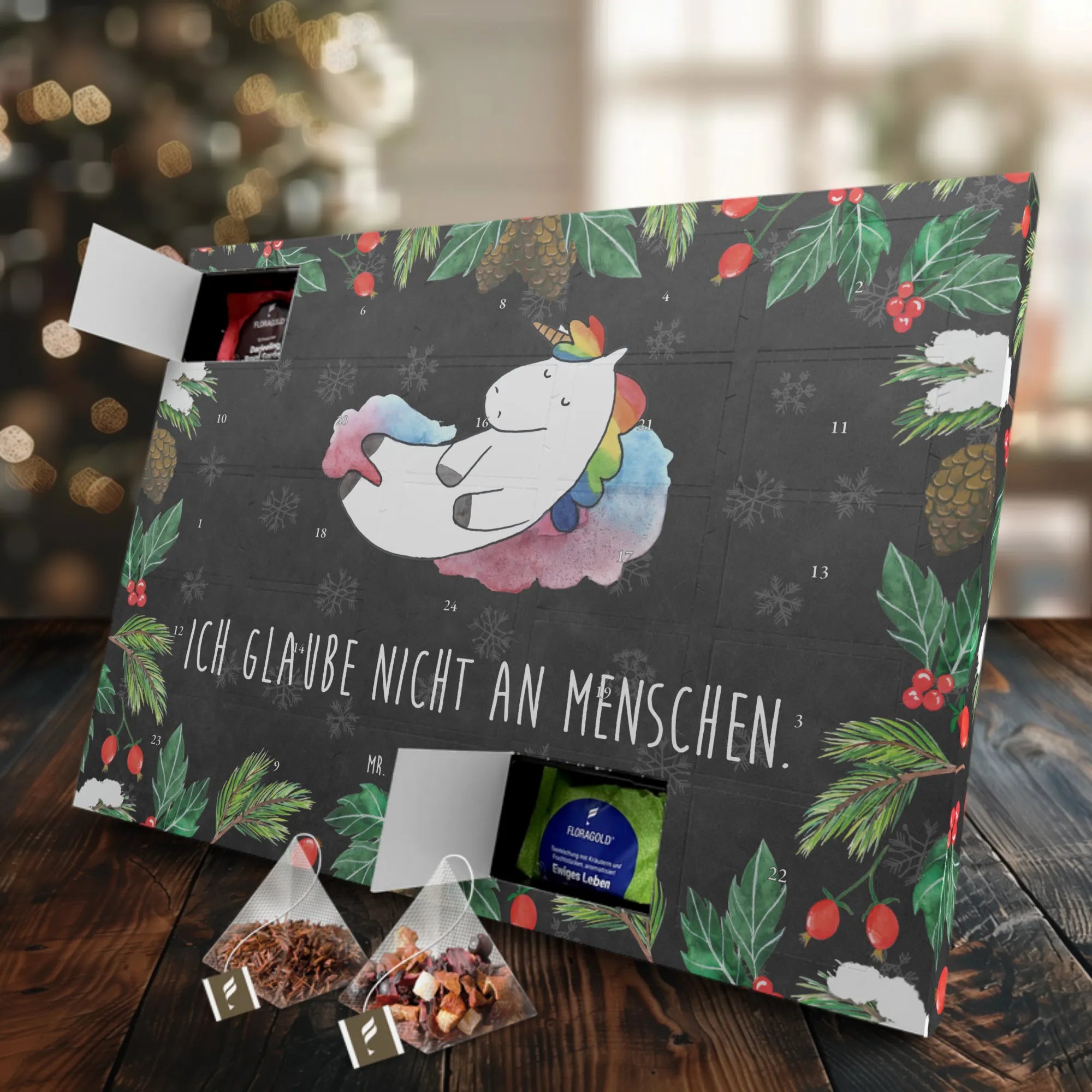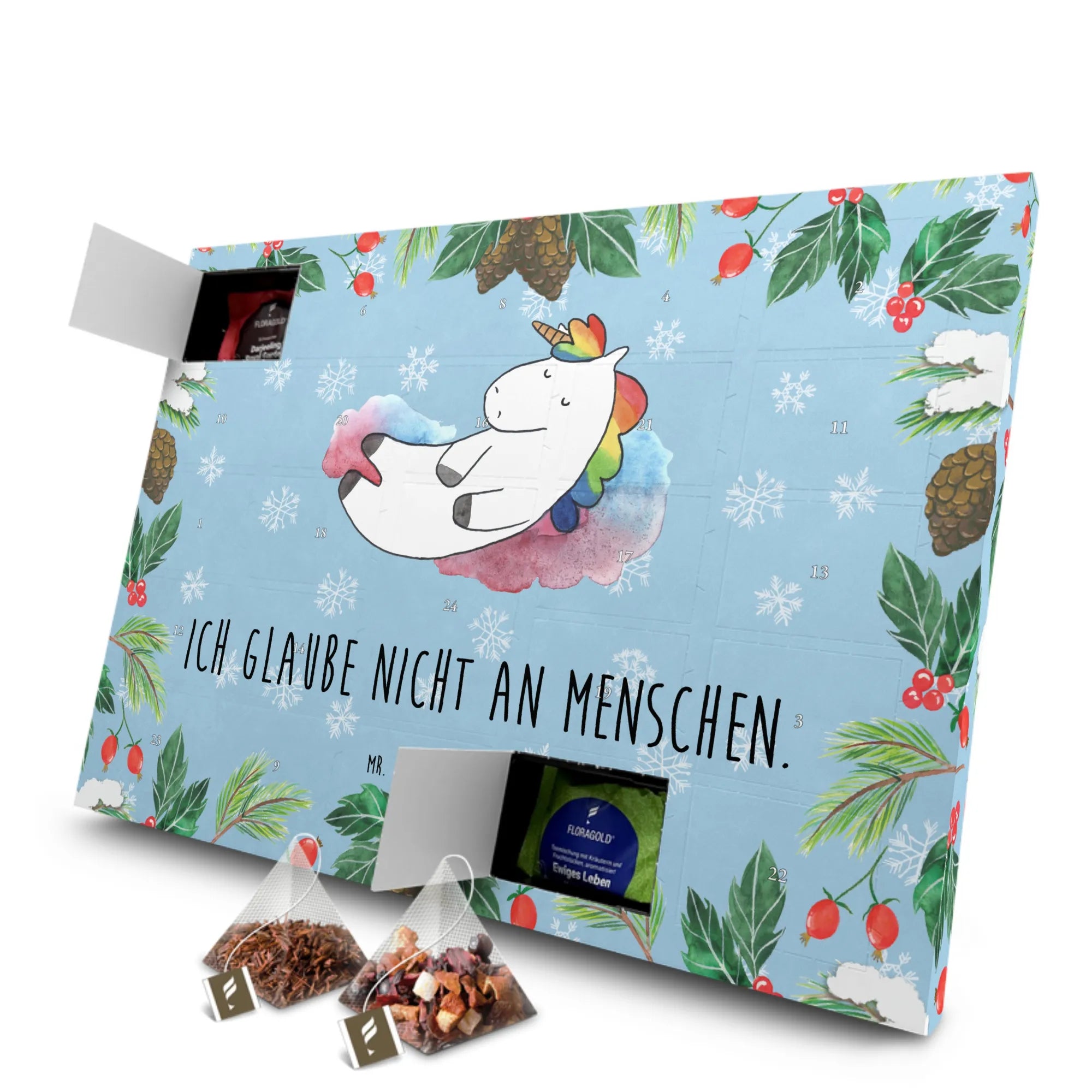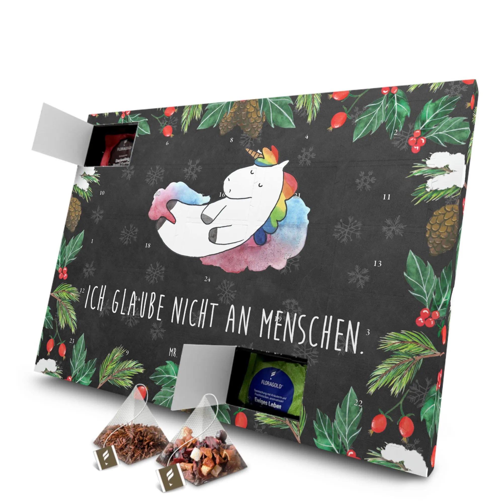 Der Tee Adventskalender "Einhorn Wolke 7" aus der zauberhaften Einhorn-Kollektion von Mr. & Mrs. Panda ist das perfekte Geschenk für alle, die die Magie der Einhörner lieben! Mit diesem Kalender kannst du die Vorfreude auf die Adventszeit auf ganz besondere Weise erleben. Hinter 24 Türchen verstecken sich hochwertige Teesorten, die in stilvollen Pyramidenbeuteln verpackt sind. Jedes Türchen öffnet sich als kleines, duftendes Abenteuer – ideal für kalte Wintertage! Das entspannte Einhorn auf Wolke 7 bringt dich zum Lächeln und sorgt für einen Hauch von Fantasie in deinem Alltag. Das Motiv ist mit dem witzigen Spruch "Ich glaube nicht an Menschen." bedruckt, was für viele ein augenzwinkerndes Lebensmotto darstellt.