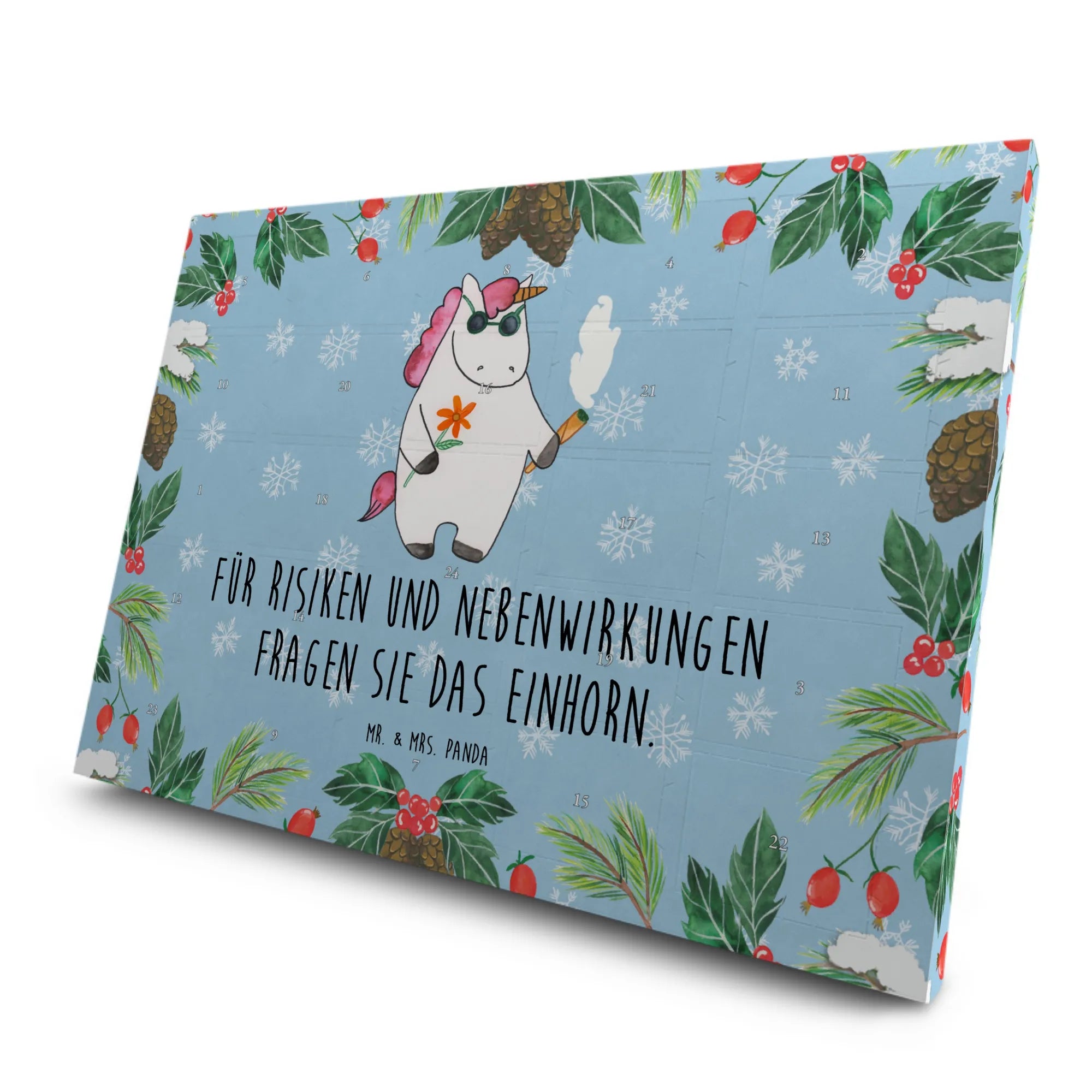 Der Kalender ist nicht nur eine geschmackvolle Überraschung, sondern auch ein echter Hingucker. Er ist bedruckt mit dem witzigen Motiv des hippen Einhorns im Woodstock-Stil, das gute Laune und jede Menge Party-Feeling verbreitet. „Für Risiken und Nebenwirkungen fragen Sie das Einhorn“ – dieser charmante Spruch sorgt für schallendes Lachen und macht den Kalender zu einem originellen Geschenk für Geburtstage, Weihnachten oder einfach nur, um jemandem eine Freude zu machen.