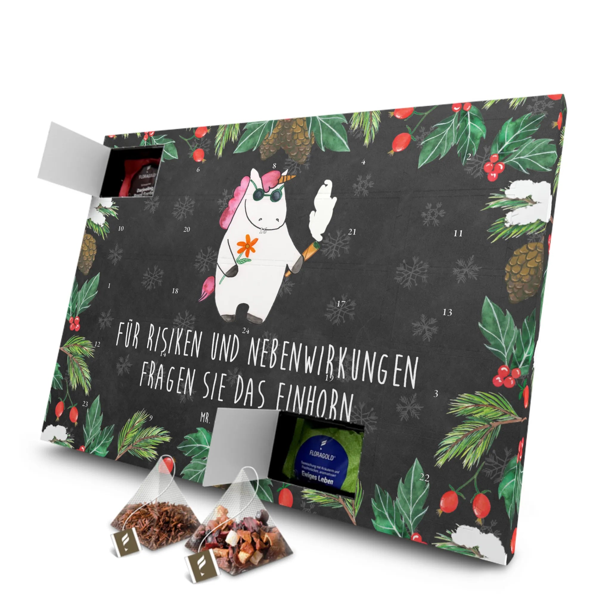 Perfekt für alle, die auf der Suche nach einem originellen Geschenk sind! Lass den Alltag hinter dir und genieße die entspannte Atmosphäre, die unser Einhorn Woodstock verbreitet. Schenke Freude, Lachen und einen Hauch von Magie mit diesem einzigartigen Tee Adventskalender von Mr. & Mrs. Panda!