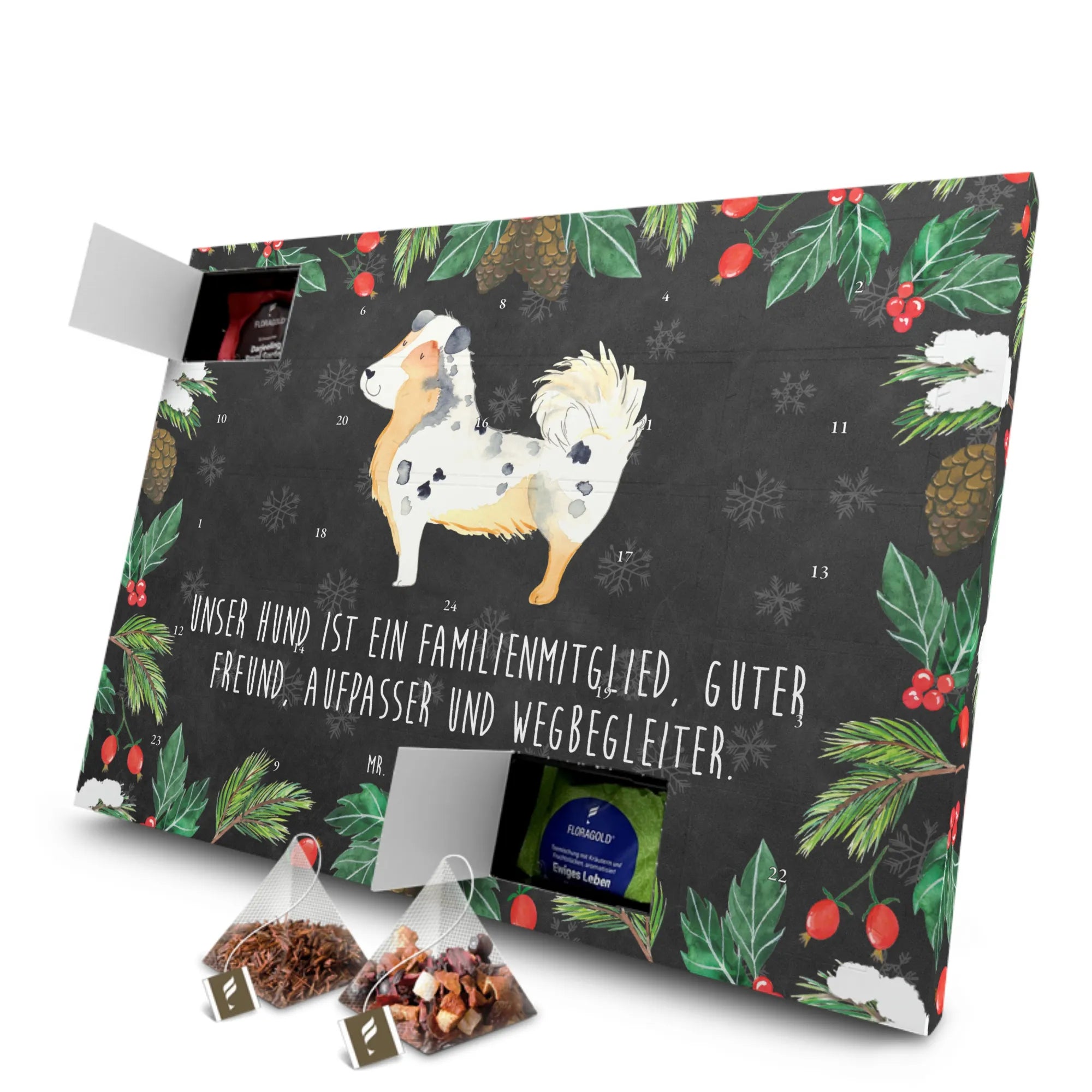 Der Tee Adventskalender mit dem süßen Motiv eines Australian Shepherds von Mr. & Mrs. Panda ist das perfekte Geschenk für alle Hundeliebhaber und Hundebesitzer. Er bringt Freude und Wärme in die kalte Adventszeit und lässt das Herz eines jeden Tierfreundes höher schlagen.