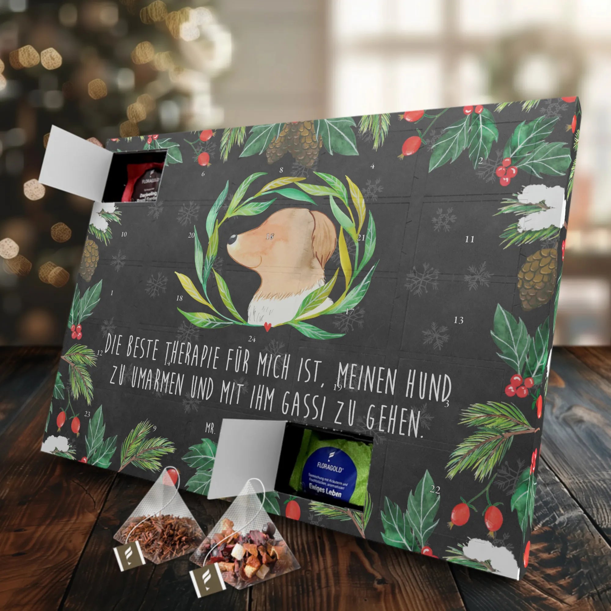 Der Adventskalender besticht nicht nur durch seine köstlichen Tees, sondern auch durch das zauberhafte Design. Das Motiv zeigt einen niedlichen Hund mit einer Blume in der Pfote, umgeben von zarten Ranken - eine echte Augenweide! Dieser Kalender ist nicht nur ein wahrer Blickfang, sondern auch ein liebevolles Symbol für die Freude, die uns unsere Haustiere bringen. Der eingedruckte Spruch „Die beste Therapie für mich ist, meinen Hund zu umarmen und mit ihm Gassi zu gehen“ spricht aus, was viele Hundebesitzer fühlen: Die Liebe und das Glück, das ein Hund ins Leben bringt.