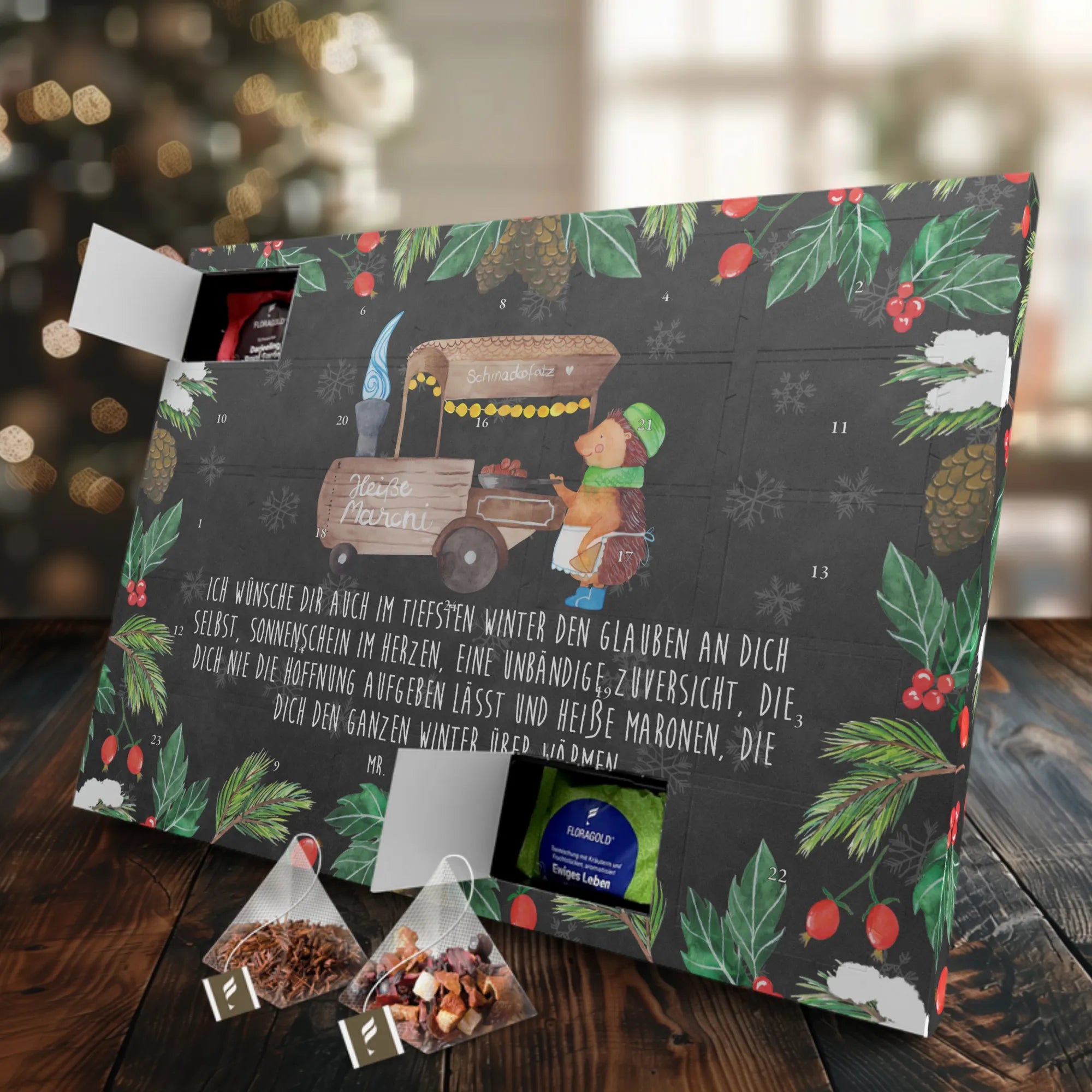 Der Tee Adventskalender Igel Maronen von Mr. & Mrs. Panda ist das perfekte Geschenk für alle, die die besinnliche Zeit des Winters und die Vorfreude auf Weihnachten lieben. Mit seinem liebevollen Design und dem charmanten Igel, der an einem Stand heiße Maronen verkauft, bringt dieser Adventskalender nicht nur Freude, sondern auch eine wohltuende Gemütlichkeit in jeden Tag der Adventszeit.