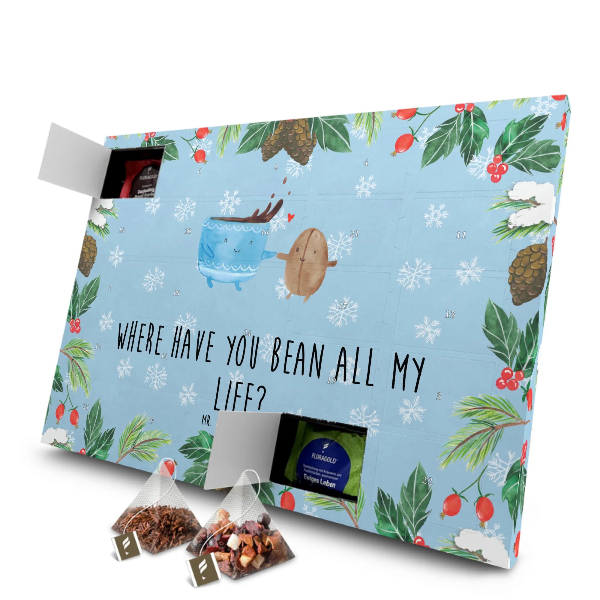 Entdecke den wunderbaren Tee Adventskalender mit dem zauberhaften Motiv einer Kaffeebohne aus der Small World Kollektion von Mr. & Mrs. Panda. Dieser Adventskalender ist nicht nur ein hübsches Deko-Element, sondern auch ein ganz besonderes Geschenk für alle Teeliebhaber und Kaffeefans. Mit dem freudigen Slogan 'Where have you bean all my life?' zaubert er garantiert ein Lächeln auf dein Gesicht und bringt gute Laune in die kalte Jahreszeit.