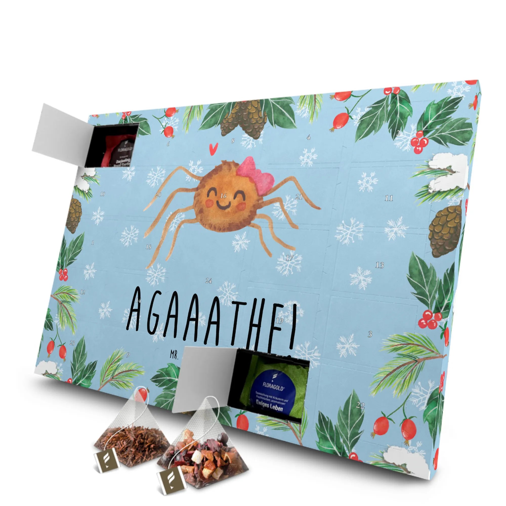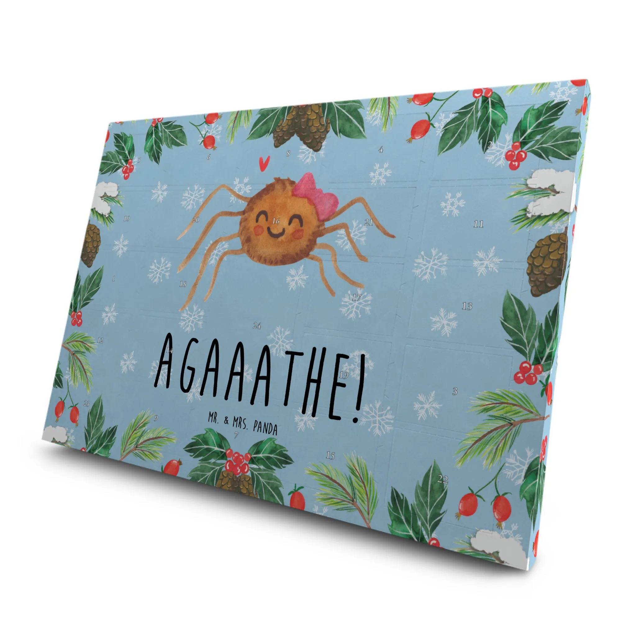 Der Tee Adventskalender Spinne Agathe Freude von Mr. & Mrs. Panda ist das perfekte Geschenk für alle Teeliebhaber und Freunde von niedlichen Motiven! In der nostalgischen Vorweihnachtszeit zaubert dieser liebevoll gestaltete Adventskalender mit dem fröhlichen Motiv der Spinne Agathe, die sich mit ihrem kleinen Schleifchen und dem strahlenden Lächeln auf ihren Lippen präsentiert, jedem ein Lächeln ins Gesicht.