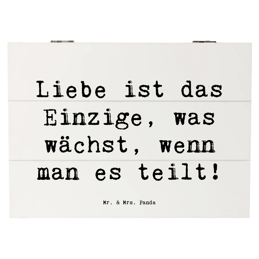 Die wunderschöne Holzkiste von Mr. & Mrs. Panda mit dem Motiv 'Eheversprechen' ist der perfekte Begleiter für einen der schönsten Tage in deinem Leben: Deine Hochzeit! Diese zauberhafte Erinnerungskiste ist nicht nur ein ideales Aufbewahrungsort für wertvolle Schätze, sondern auch ein wunderbares Hochzeitsgeschenk für das Brautpaar. Sie ist perfekt geeignet, um Erinnerungen an besondere Moments wie den Trauungs-tag, den ersten Tanz oder sogar Bilder und Glückwünsche von den Gästen aufzubewahren. Die Worte 'Liebe ist das Einzige, was wächst, wenn man es teilt!' auf der Kiste machen sie zu einem besonderen Geschenk, das ewig in Erinnerung bleibt.