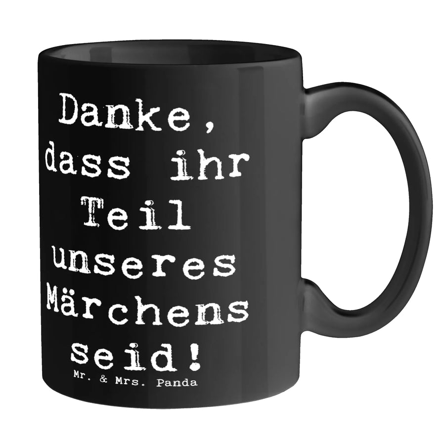 Die wunderschöne Tasse "Danke, dass ihr Teil unseres Märchens seid!" von Mr. & Mrs. Panda ist das perfekte Geschenk für Deine Hochzeitsgäste! Mit einem Füllvermögen von 325 ml bietet diese Keramiktasse nicht nur Platz für köstlichen Kaffee oder Tee, sondern ist auch ein charmantes Andenken an einen der schönsten Tage Deines Lebens. Unsere Tasse ist fantasievoll gestaltet und bringt genau den richtigen Hauch von Romantik in jede Tasse.