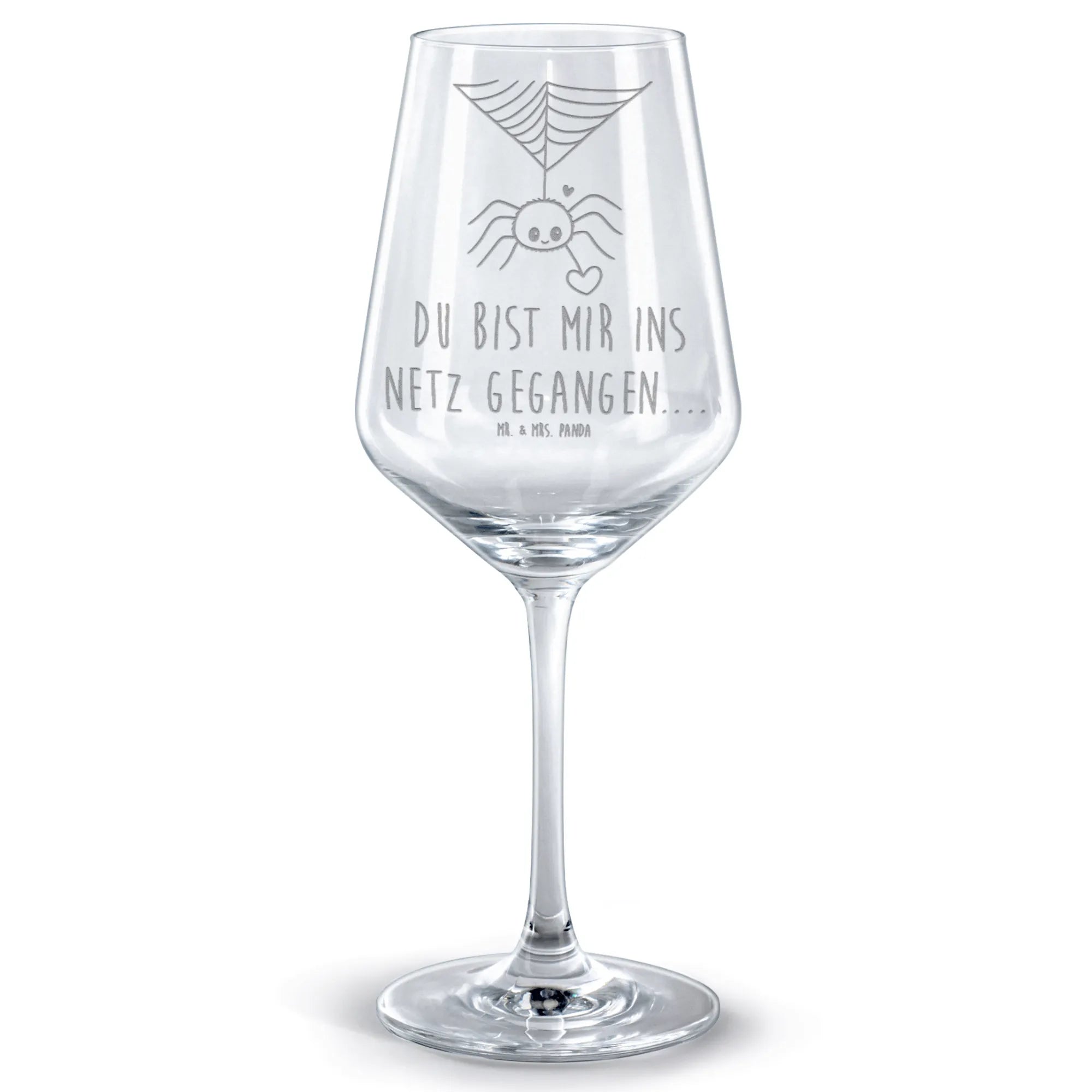 Das wunderschöne Rotweinglas mit der besonderen Gravur 'Du bist mir ins Netz gegangen....' aus der beliebten Kollektion Spinne Agathe von Mr. & Mrs. Panda ist das perfekte Geschenk für alle Weinliebhaber! 🍷