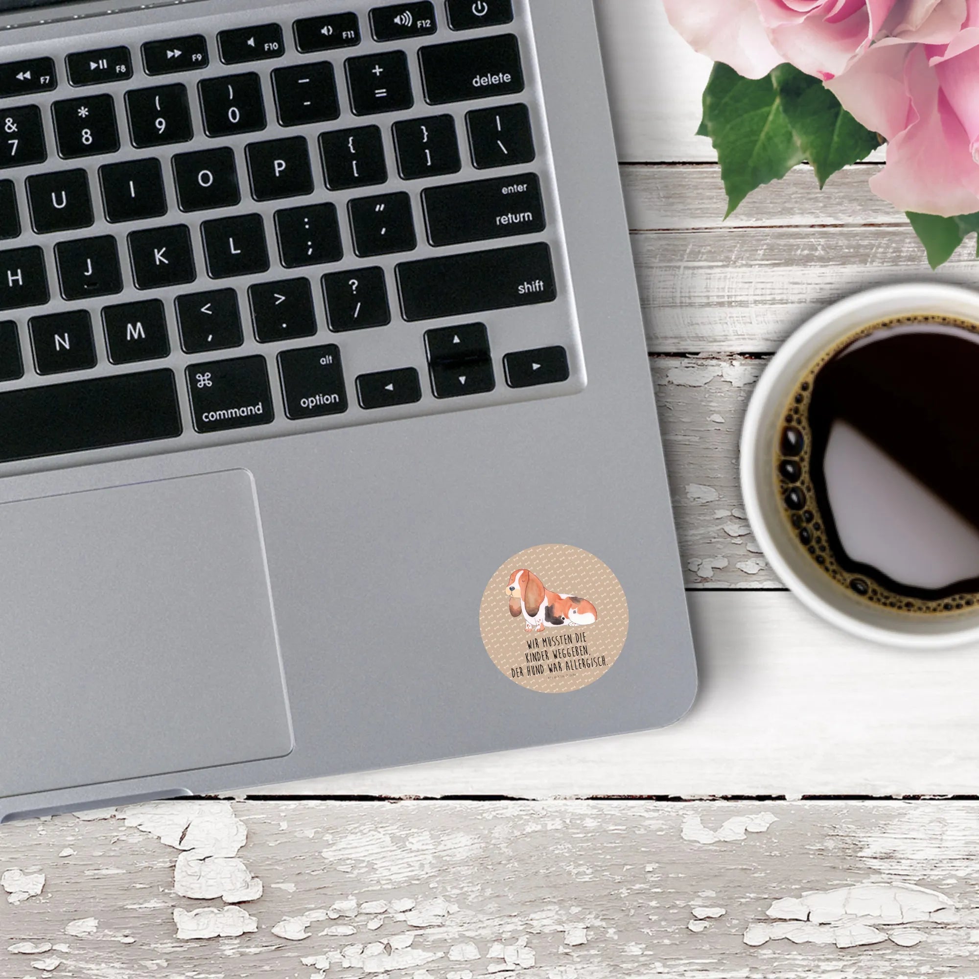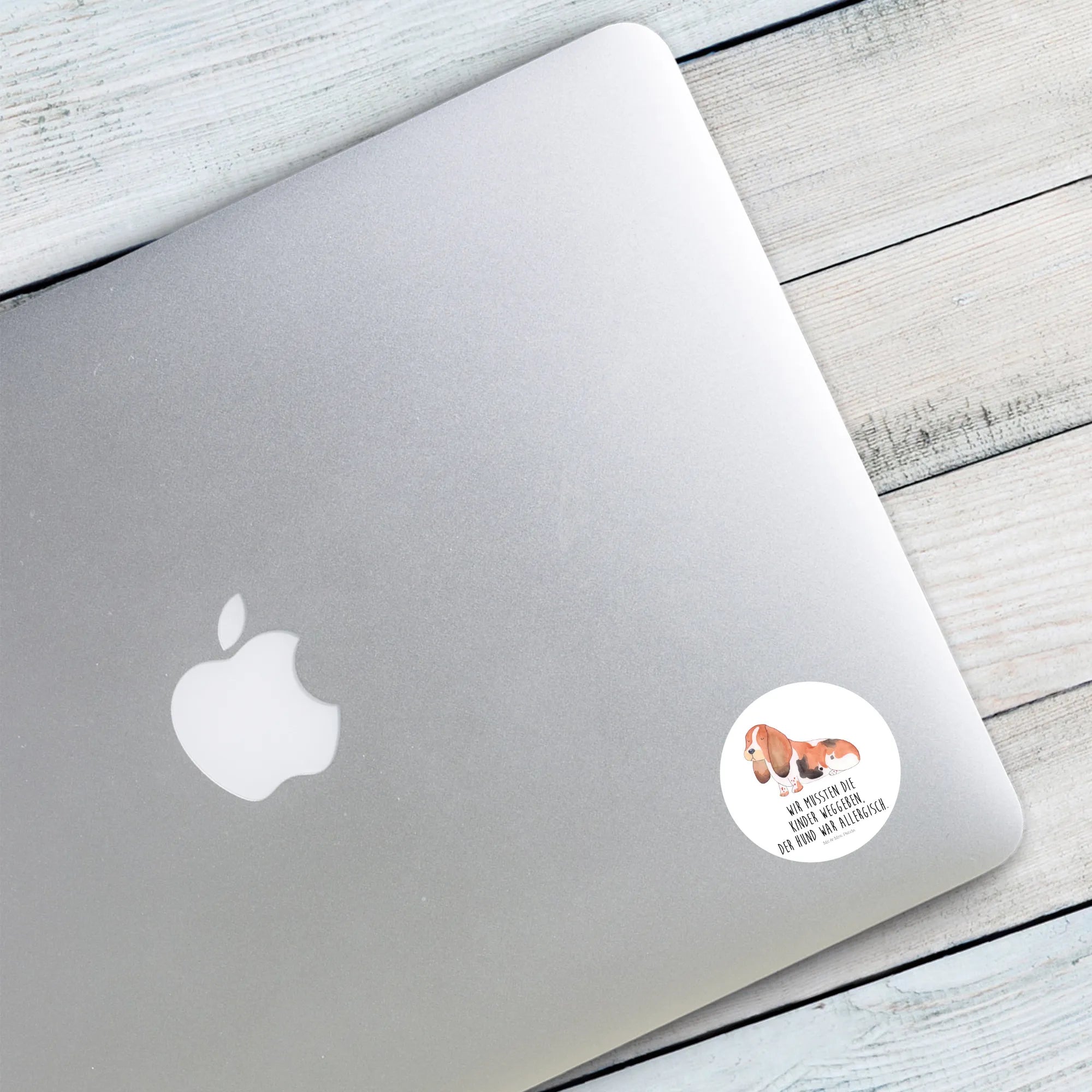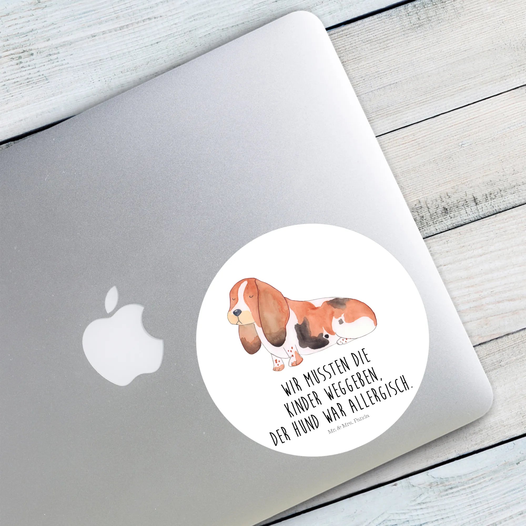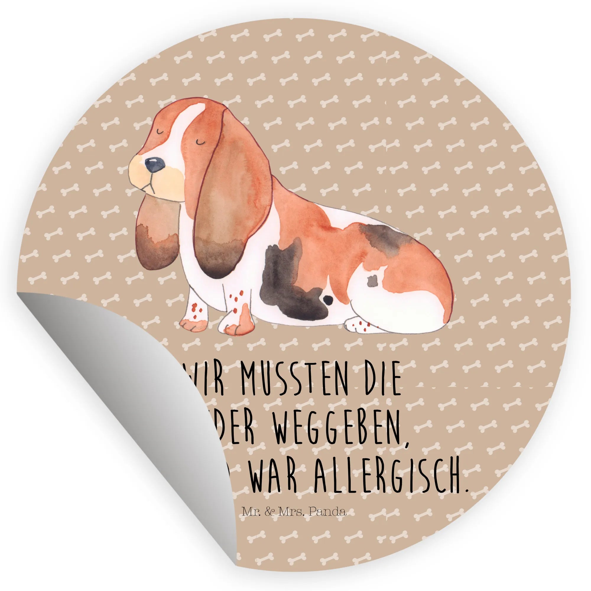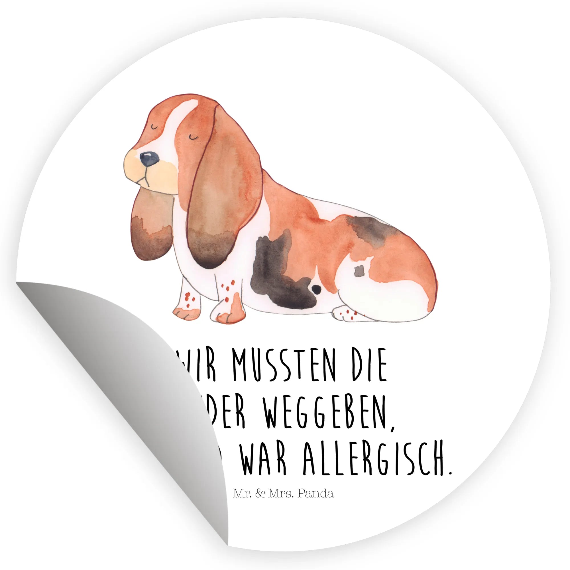 Ein bezaubernder 40mm Rund Aufkleber von Mr. & Mrs. Panda – perfekt für alle, die Hundeliebe mit einer Prise Humor zeigen wollen. Unser süßer Basset Hound steht im Mittelpunkt dieser Illustration und trägt den witzigen Spruch: „Wir mussten die Kinder weggeben. Der Hund war allergisch.“ Ein echter Blickfang aus der liebevollen Hunde Kollektion.