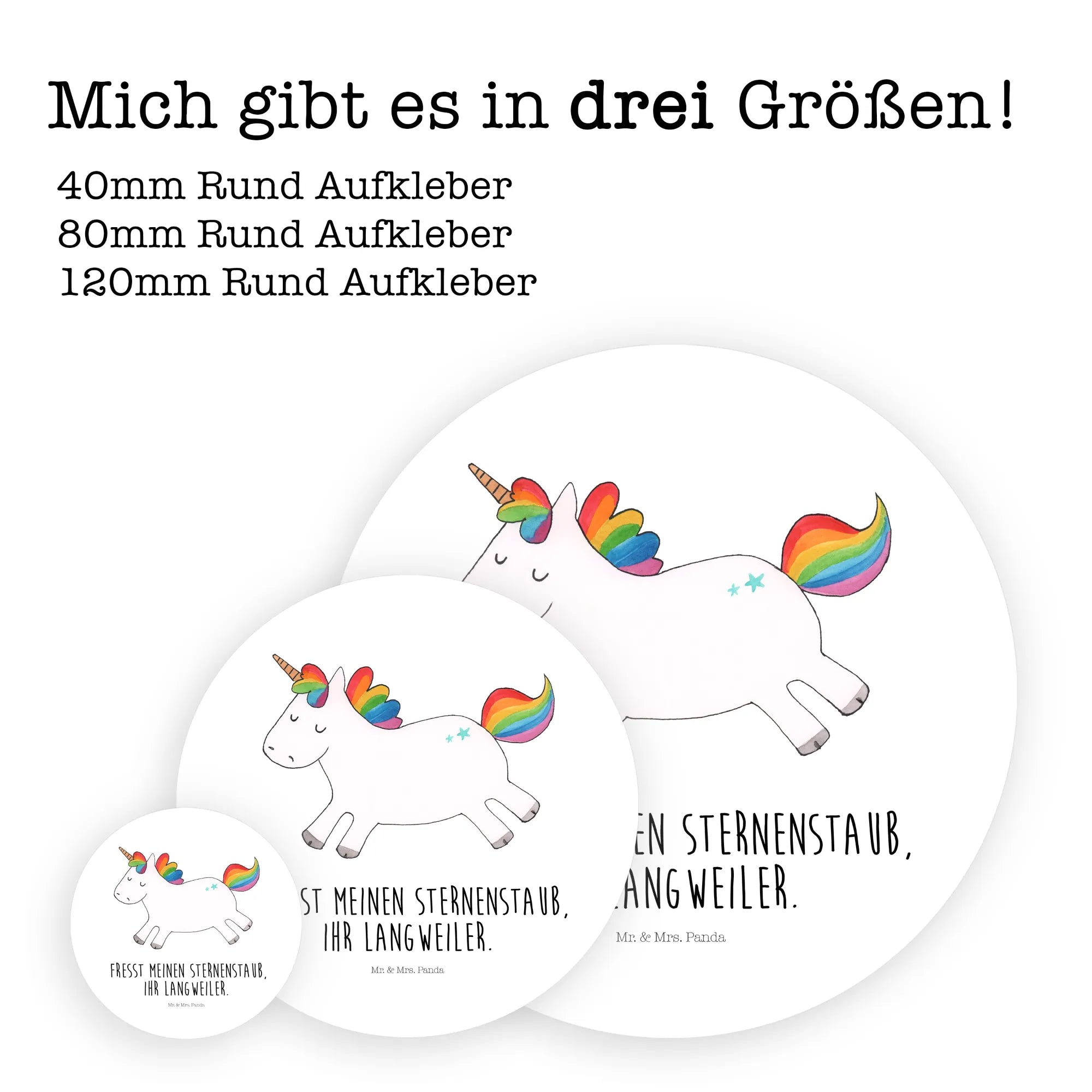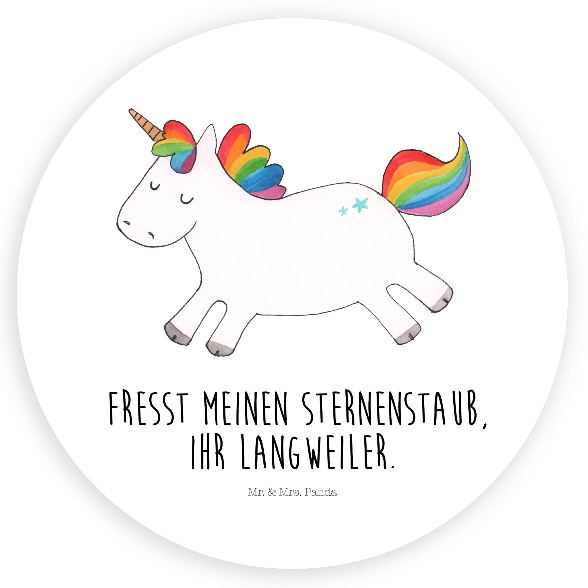 Fröhlichkeit und Lebensfreude pur strahlt das Einhorn Happy aus! Mit jedem Funken seines Sternenstaubs erinnert es uns daran, dass das Leben ein buntes Abenteuer ist. Es verbreitet die Botschaft "Fresst meinen Sternenstaub, ihr Langweiler" und fordert uns alle heraus, das Gewöhnliche hinter uns zu lassen und die Freude in jedem Moment zu finden. Lass dich von seinem spielerischen Geist und witzigen Aufruf mitreißen und bringe Farbe in deinen Alltag. Das Einhorn ermutigt dich, deinen eigenen Funken der Lebensfreude zu entdecken und ohne Zurückhaltung du selbst zu sein. Ein Lächeln kann alles verändern, also genieße den Spaß und teile die Freude mit anderen.
