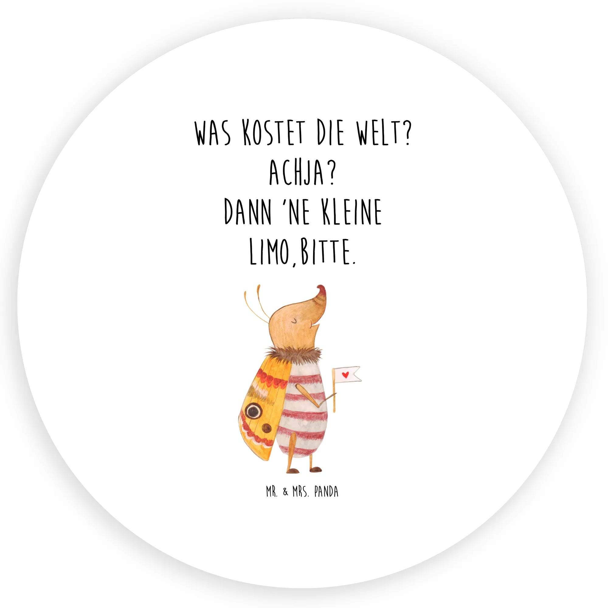 Von der Küchendeko bis zum Schreibtischaccessoire, ein kleiner Nachtfalter mit einer Fahne, auf der ein Herz prangt, bringt einen Hauch von Unbekümmertheit in unser Leben. Der Spruch 'Was kostet die Welt? Achja? Dann ne kleine Limo, bitte.' bringt uns zum Schmunzeln und ruft in Erinnerung, wie wichtig es ist, auch mal fünfe gerade sein zu lassen. Dieser niedliche Käfer, der sorglos seine Fahne schwingt, erzählt die Geschichte davon, wie schön es ist, einfach mal das Leben zu genießen, ohne sich zu sehr um die Sorgen des Alltags zu kümmern. Ein Motiv von Mr. & Mrs. Panda, das dazu einlädt, sich eine kleine Auszeit zu gönnen und die süßen Seiten des Lebens zu schätzen.