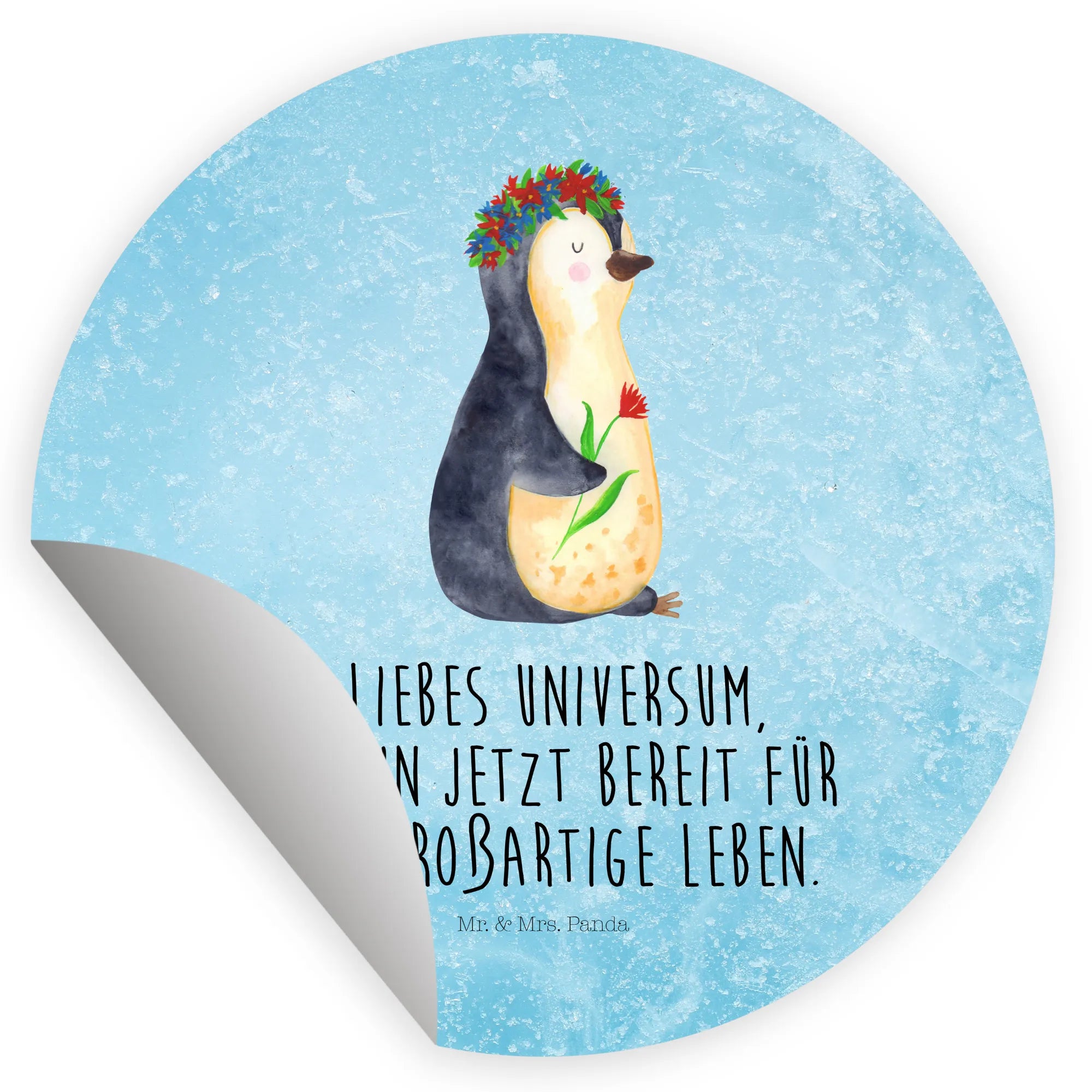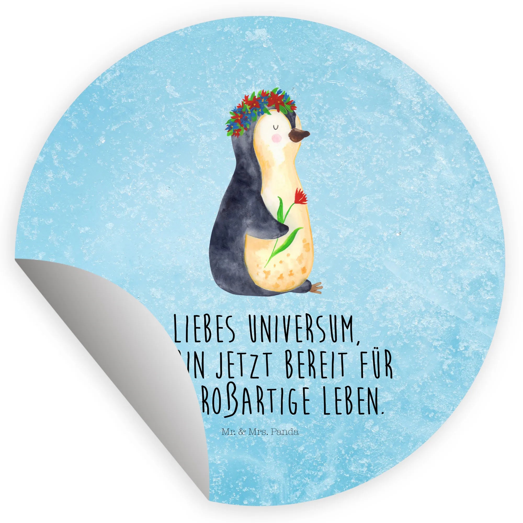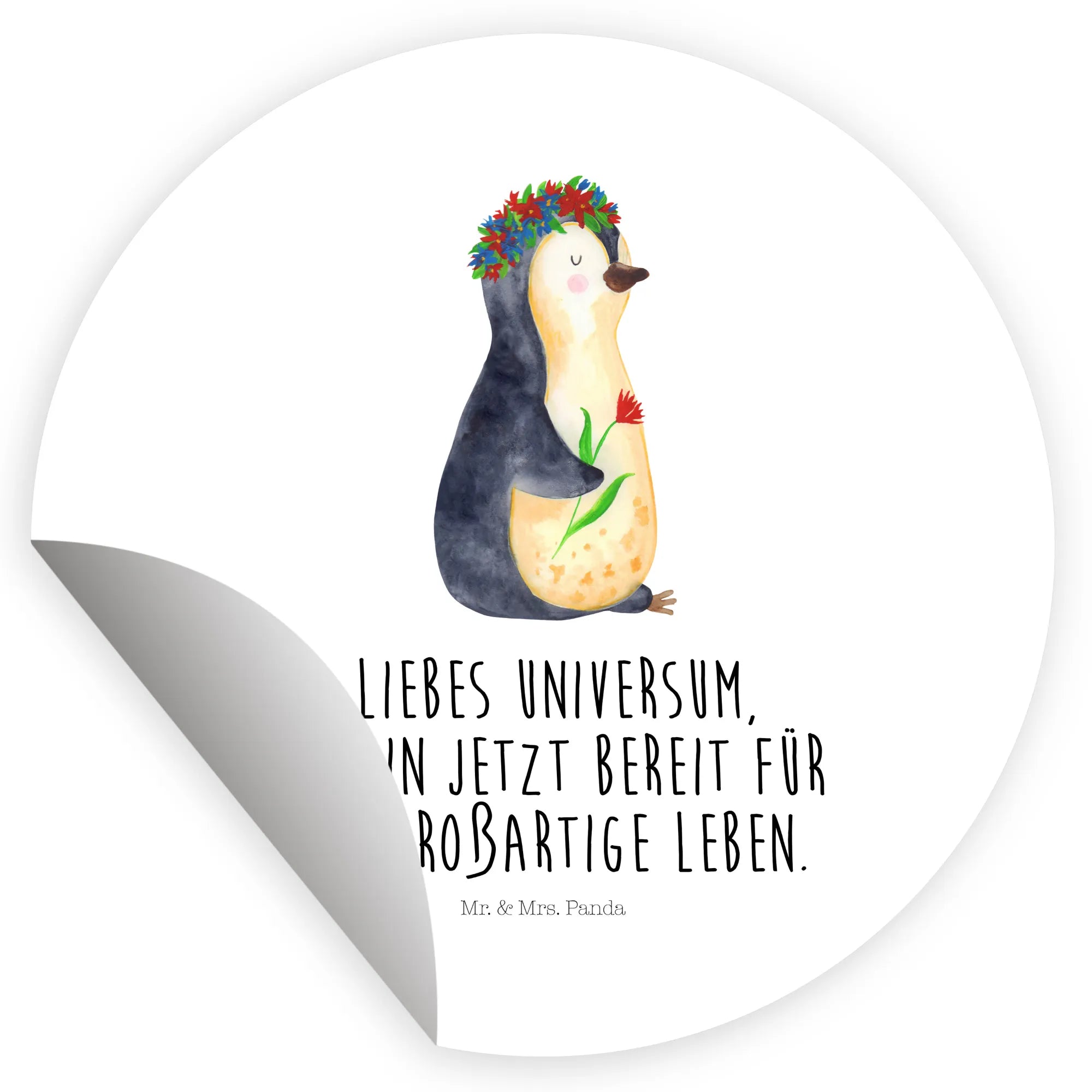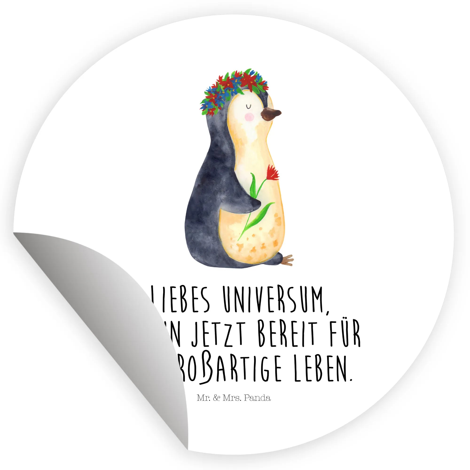 Ein zauberhafter 40mm Rundaufkleber von Mr. & Mrs. Panda – mit dem süßen Pinguin im Blumenkranz und dem Mut machenden Spruch: „Liebes Universum, ich bin jetzt bereit für das großartige Leben.“ Dieser runde Sticker kombiniert Niedlichkeit mit Lebensfreude und ist die perfekte Geschenkidee für viele Gelegenheiten. 🌸🐧