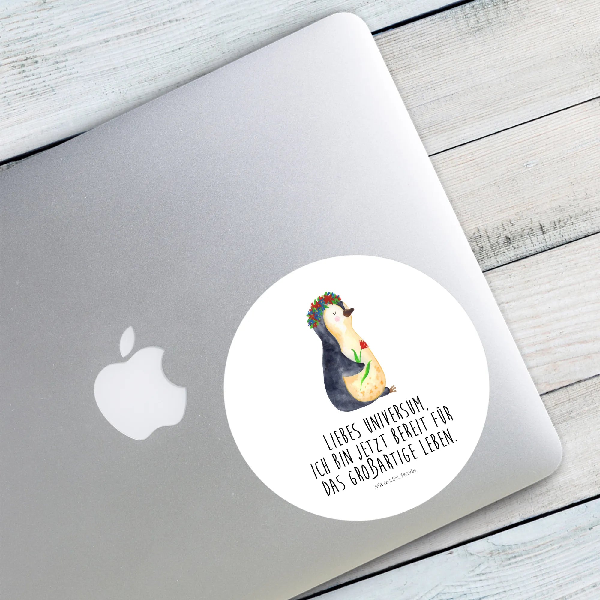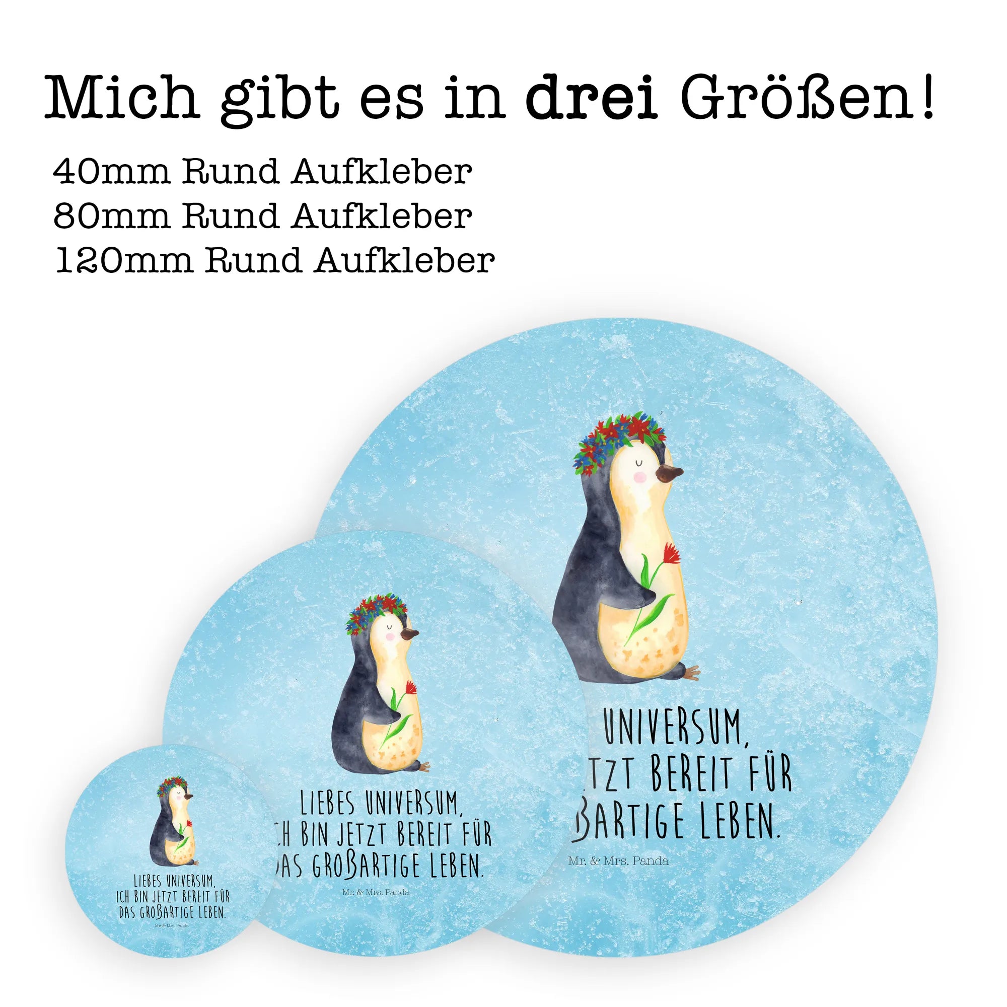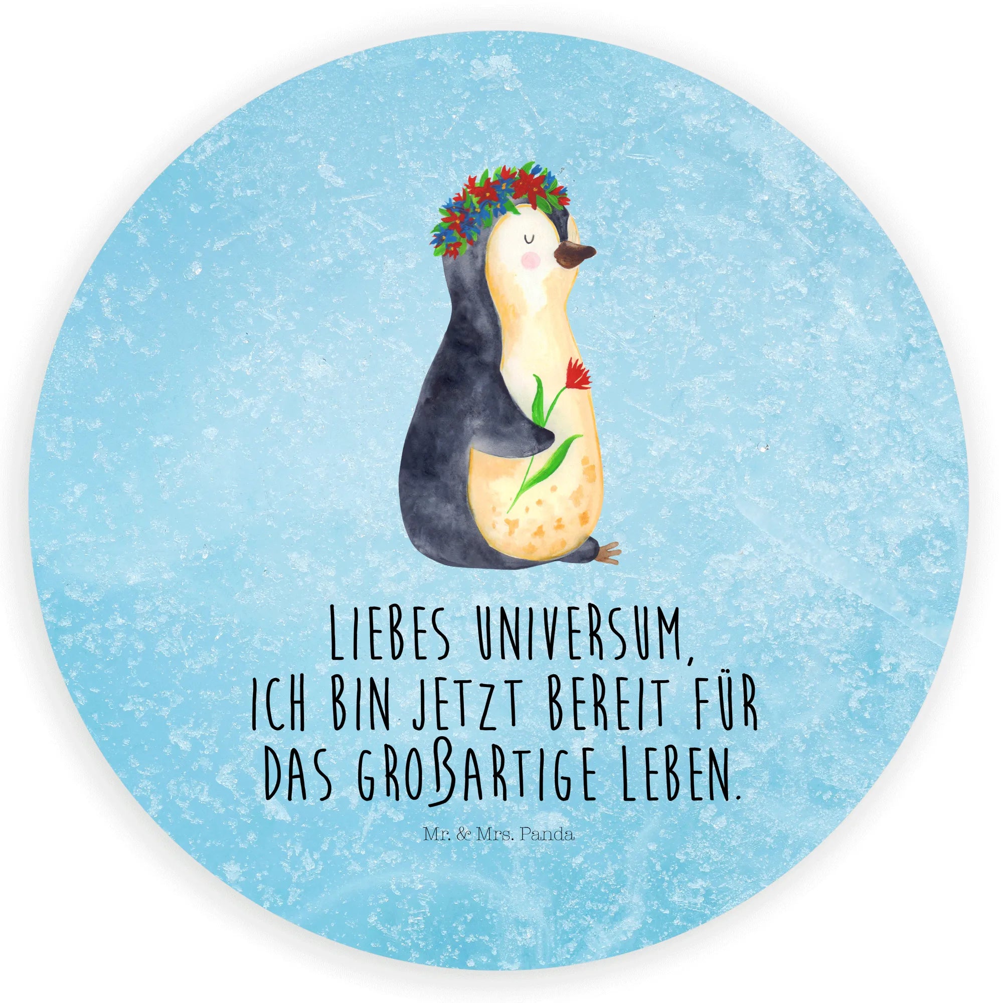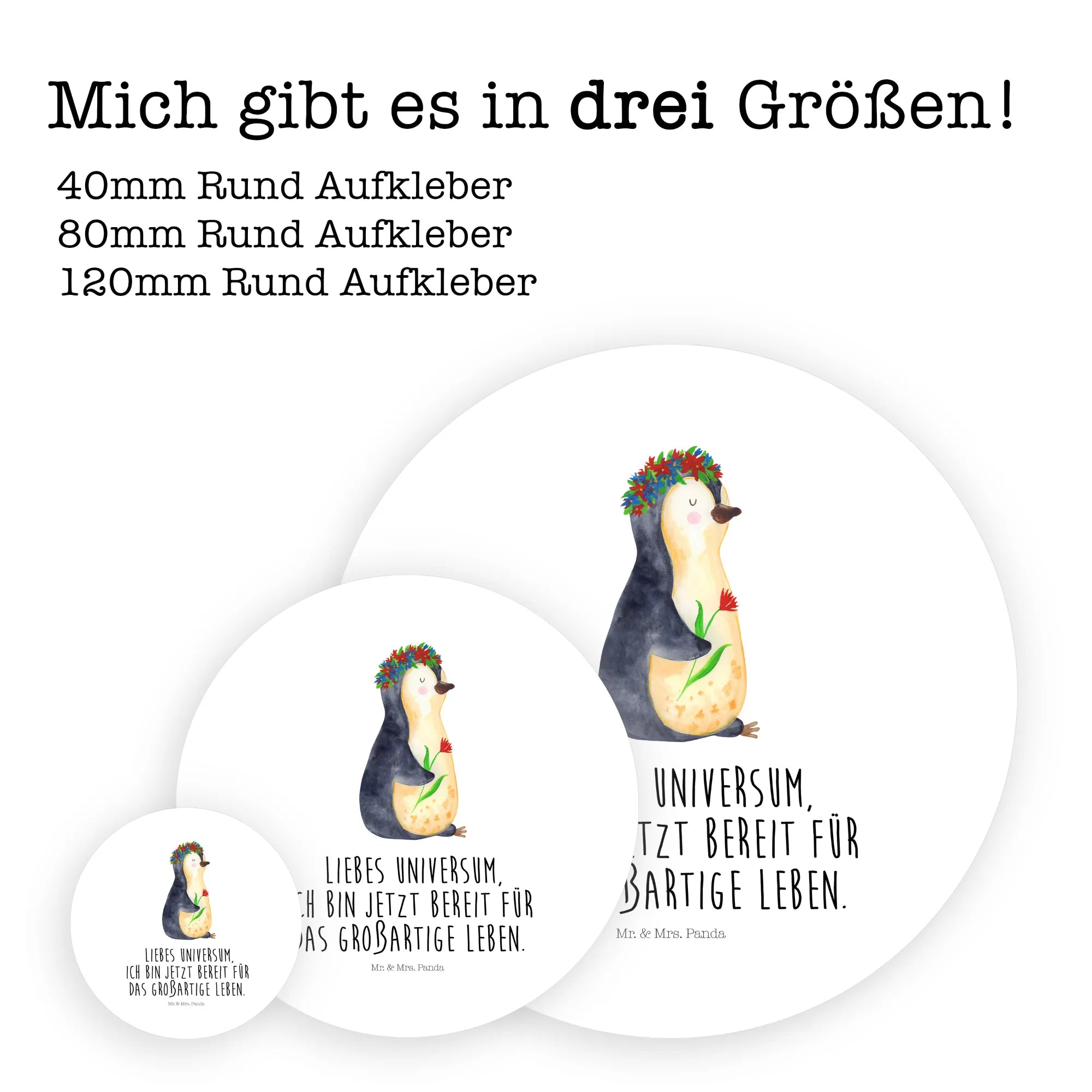 Ein zauberhafter 40mm Rundaufkleber von Mr. & Mrs. Panda – mit dem süßen Pinguin im Blumenkranz und dem Mut machenden Spruch: „Liebes Universum, ich bin jetzt bereit für das großartige Leben.“ Dieser runde Sticker kombiniert Niedlichkeit mit Lebensfreude und ist die perfekte Geschenkidee für viele Gelegenheiten. 🌸🐧