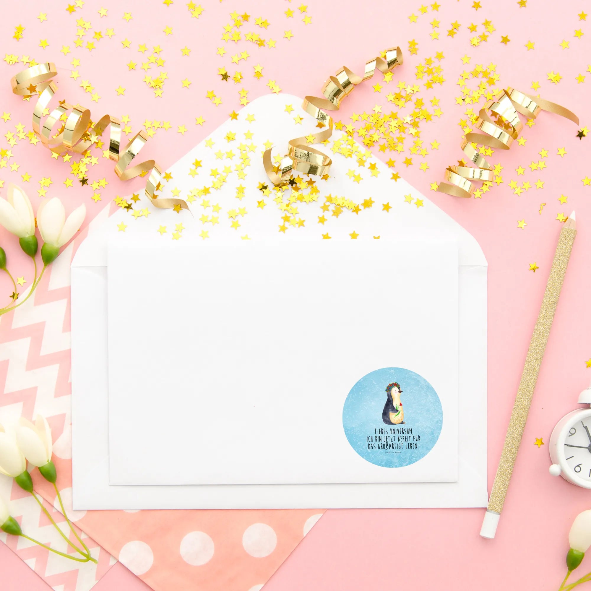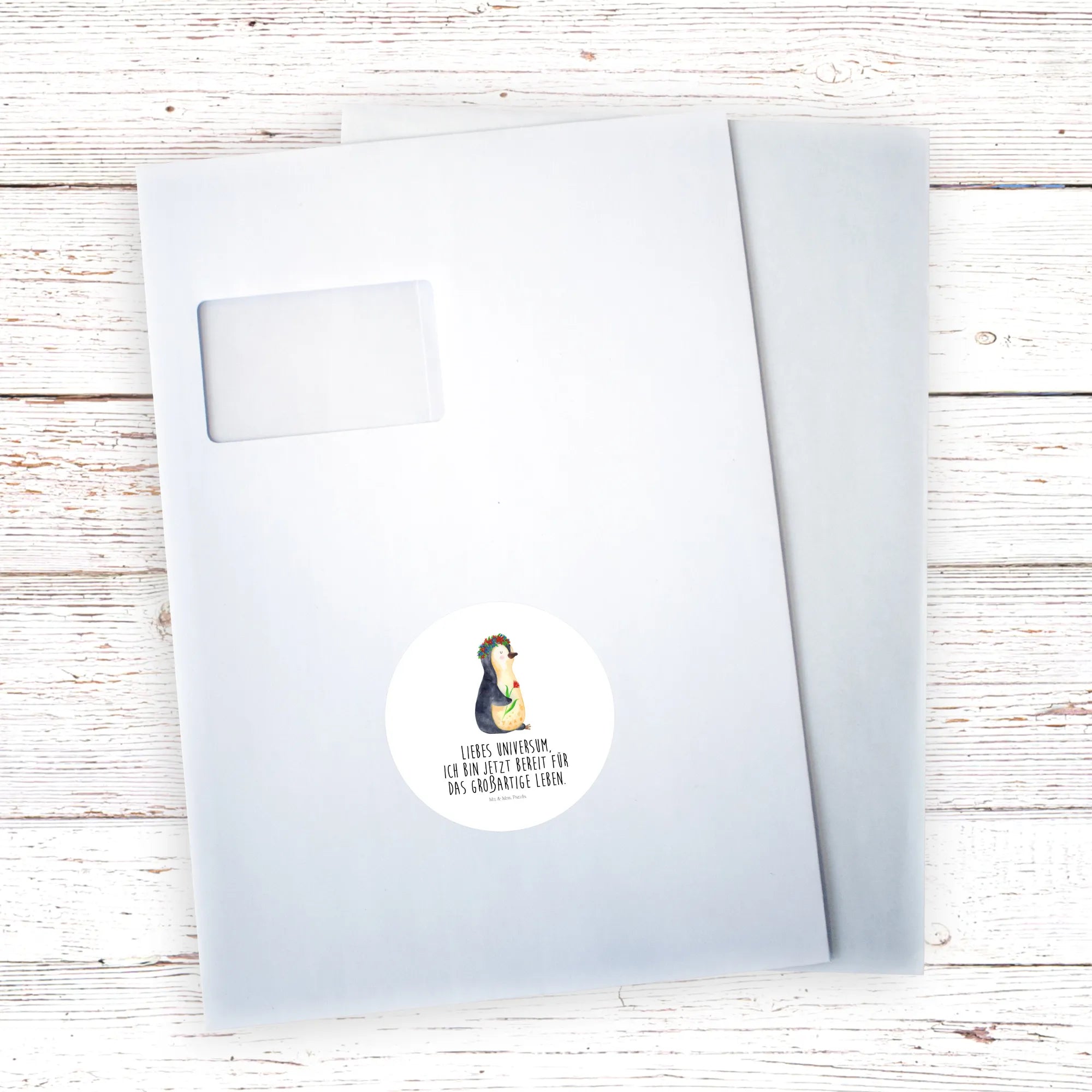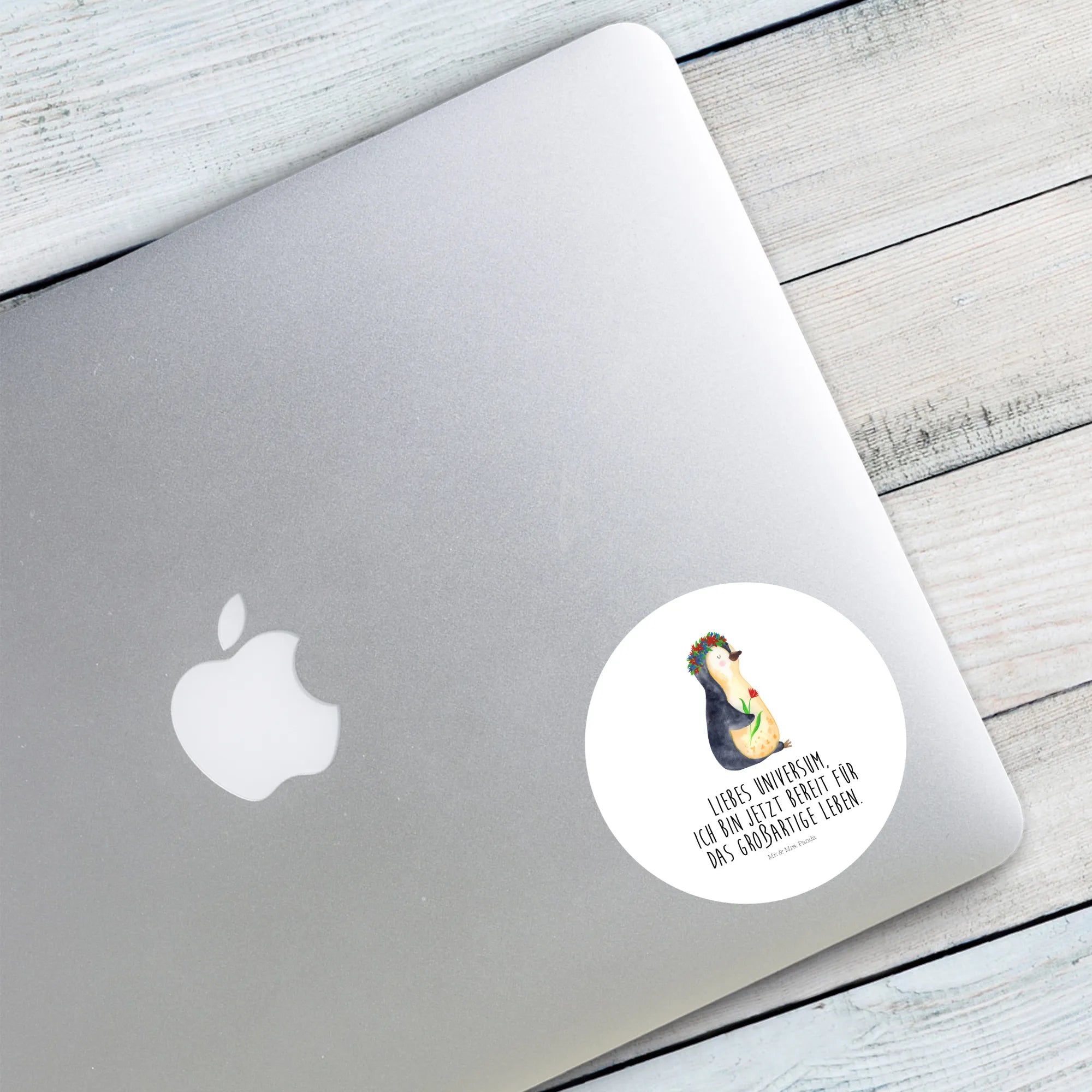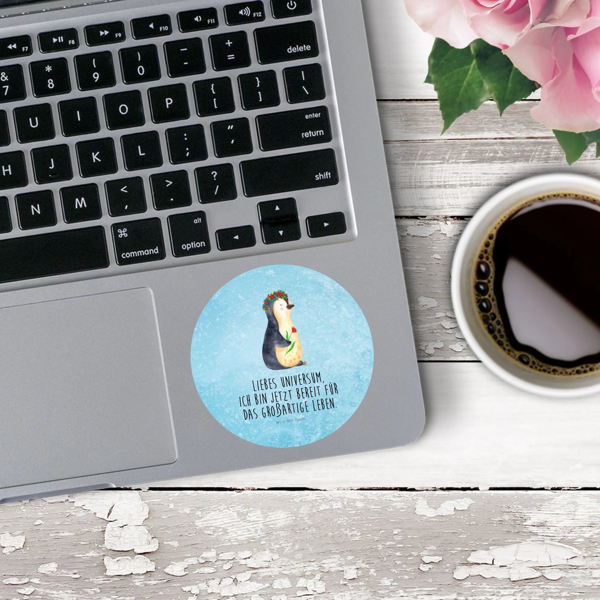 Ein zauberhafter 40mm Rundaufkleber von Mr. & Mrs. Panda – mit dem süßen Pinguin im Blumenkranz und dem Mut machenden Spruch: „Liebes Universum, ich bin jetzt bereit für das großartige Leben.“ Dieser runde Sticker kombiniert Niedlichkeit mit Lebensfreude und ist die perfekte Geschenkidee für viele Gelegenheiten. 🌸🐧