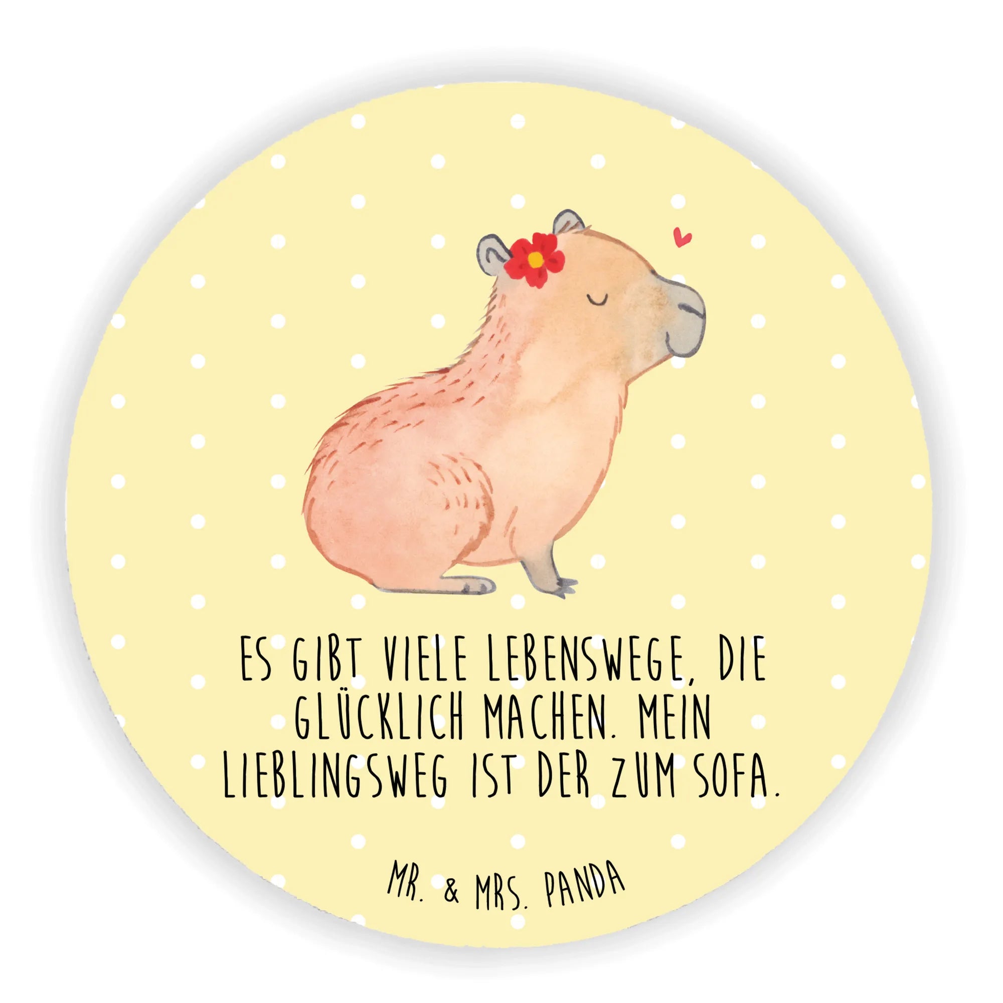 In der gemütlichen Welt von Mr. & Mrs. Panda gibt es viele kleine Momente des Glücks zu entdecken. Auf diesem liebevollen Motiv findest du ein friedvolles Capybara, das mit geschlossenen Augen und einem sanften Lächeln pure Entspannung ausstrahlt. Das Highlight ist die verspielte rote Blume mit gelber Mitte, die frech auf seinem Kopf thront und dem Tier einen zauberhaften Ausdruck verleiht. Ein kleines Herz über dem Capybara rundet die liebevolle Szenerie ab und bringt die besondere Wärme des Moments zur Geltung. Die Illustration ist warm und sanft coloriert, was die beruhigende Ausstrahlung noch verstärkt. Der Spruch 'Es gibt viele Lebenswege, die glücklich machen. Mein Lieblingsweg ist der zum Sofa.' passt perfekt zu der friedlichen Atmosphäre und entführt dich auf einen entspannten Weg voller einfach zu findendem Glück.