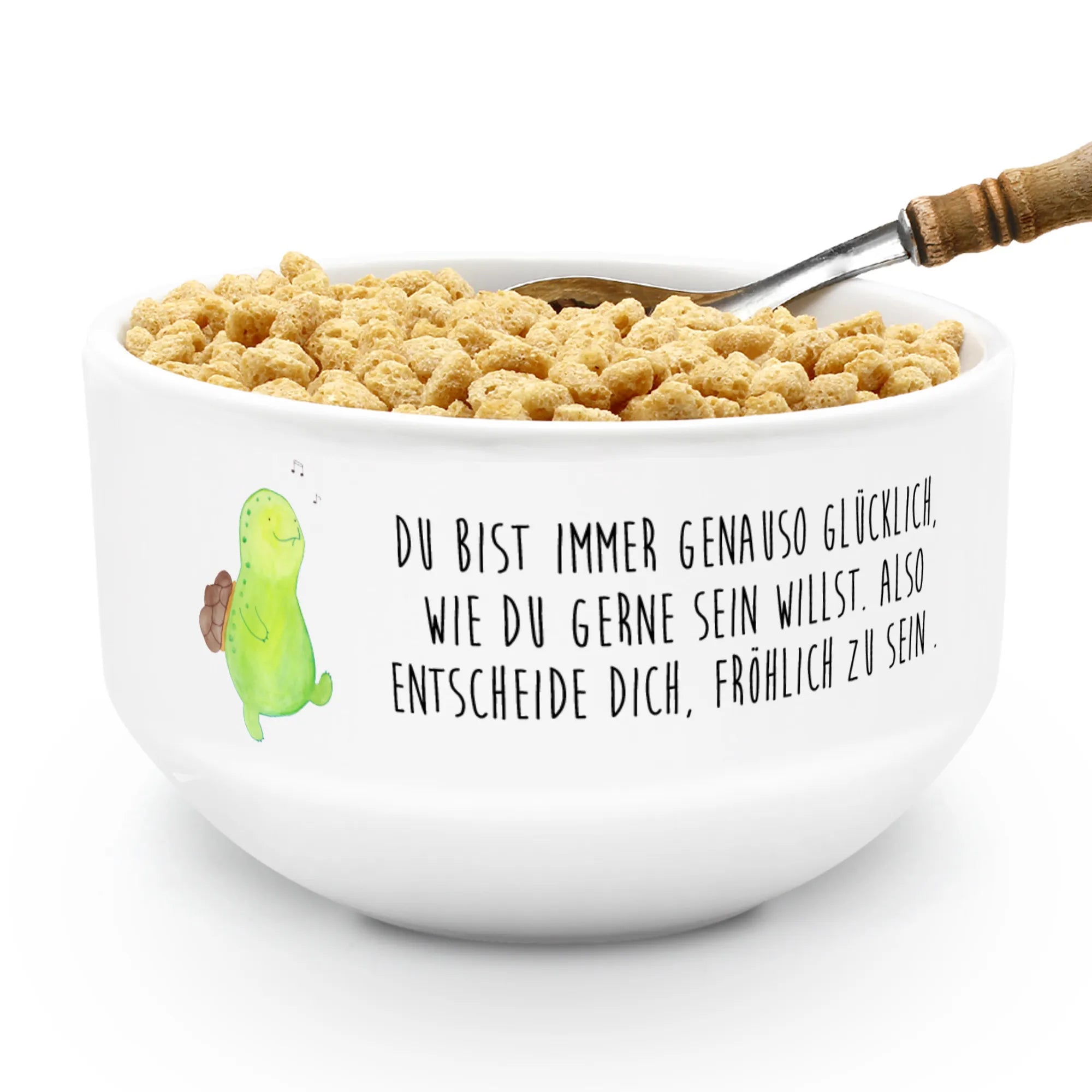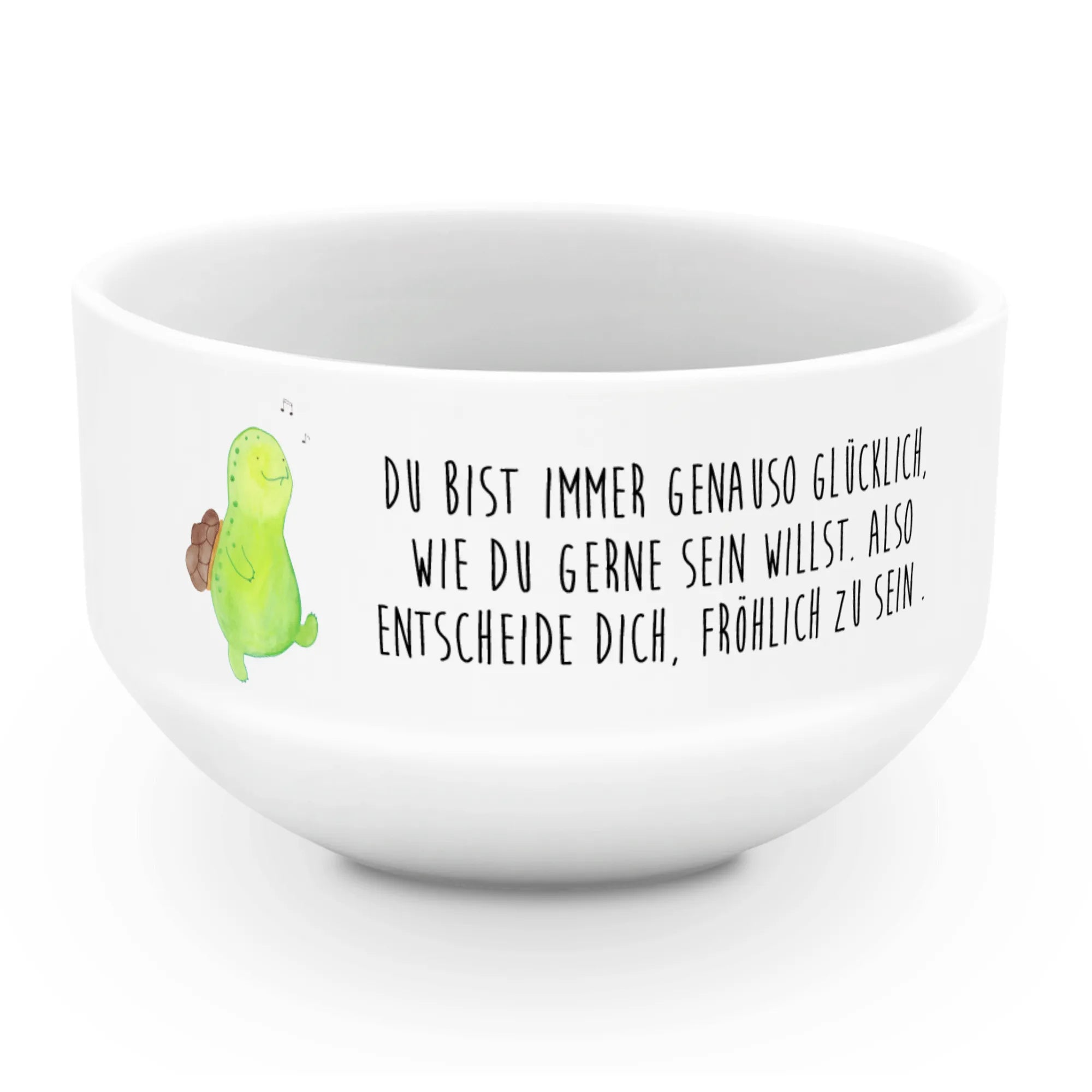 Jedes Mal, wenn du deinen leckeren Haferbrei, knackige Cornflakes oder frisches Obst in dieser Müslischale servierst, wirst du von der süßen Schildkröte begleitet, die fröhlich ihr Lied pfeift. Sie erinnert dich daran, dass du immer genauso glücklich bist, wie du dich entscheidest zu sein. Ein perfektes Geschenk für liebe Menschen oder dich selbst, um den Alltag ein wenig bunter und fröhlicher zu gestalten!
