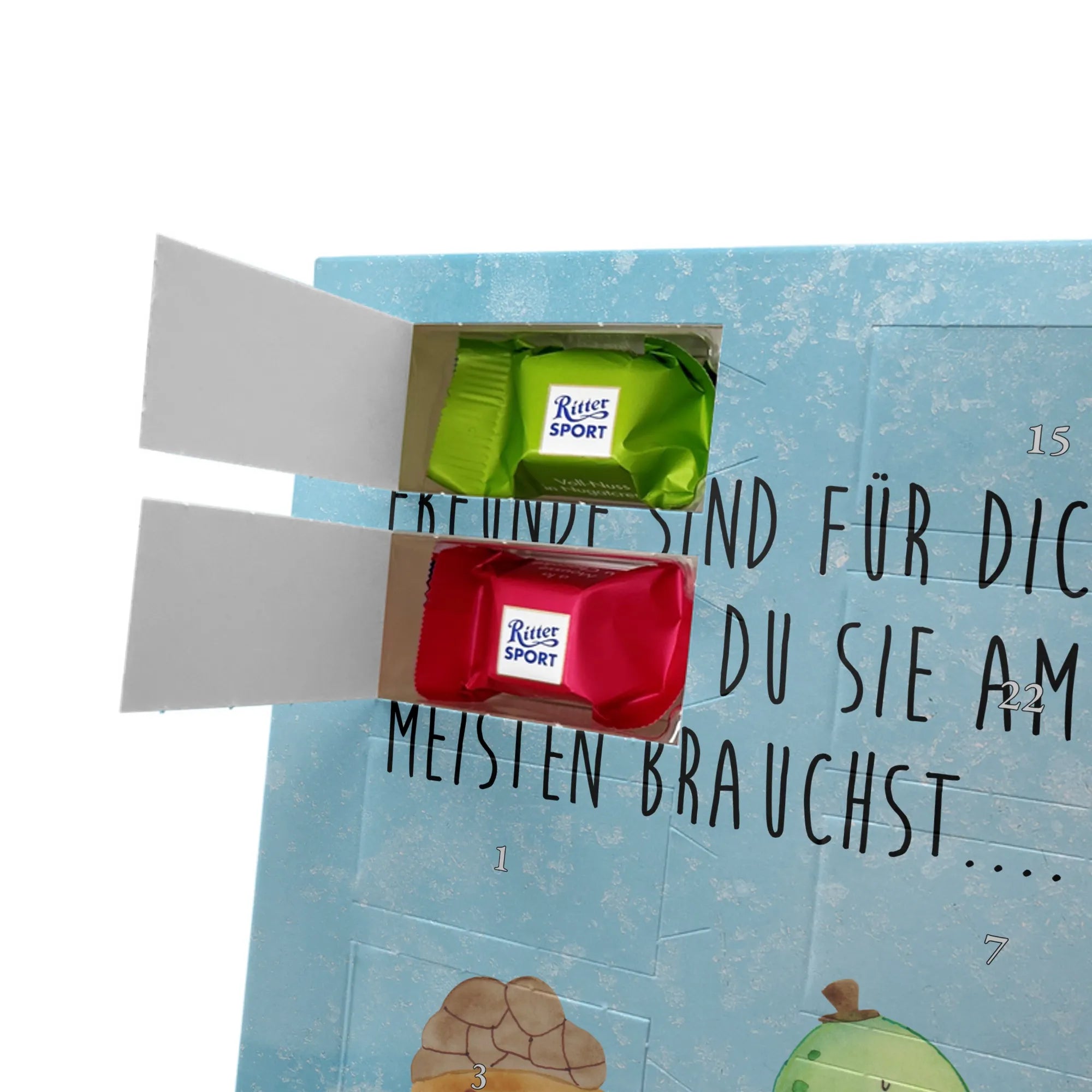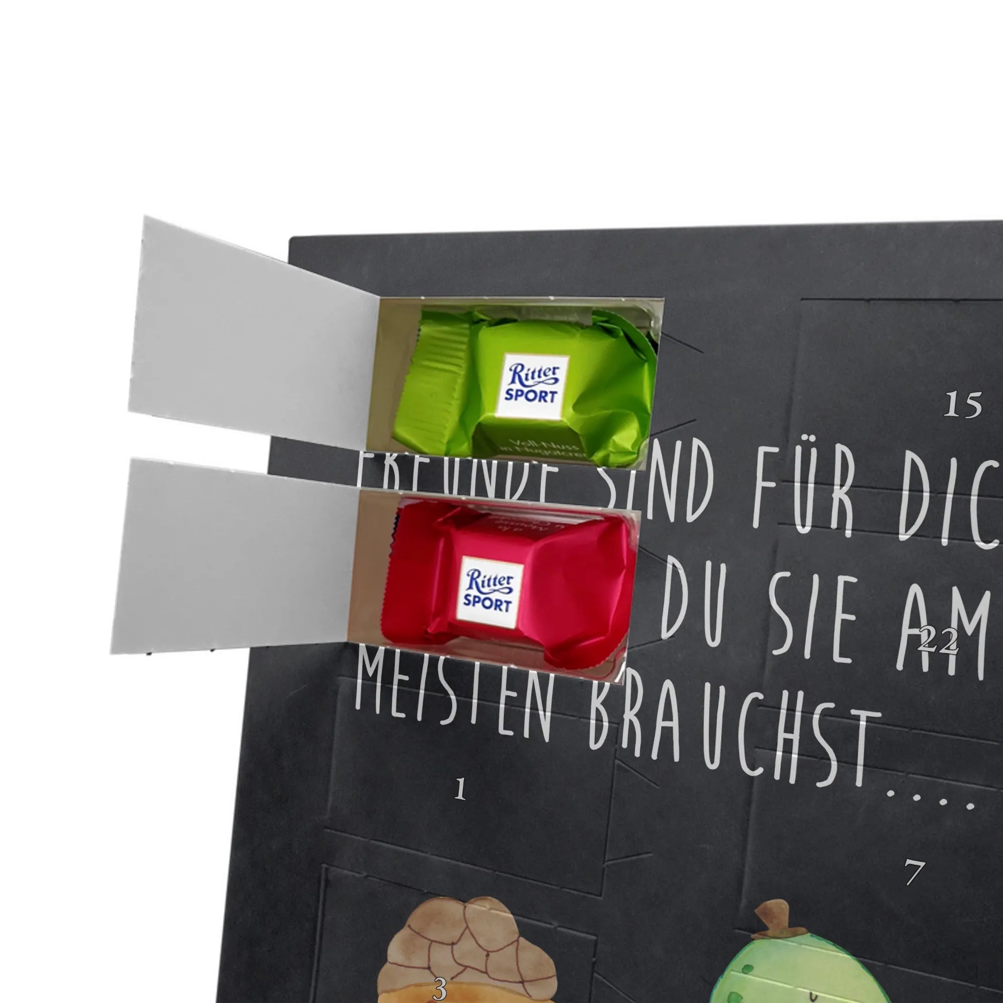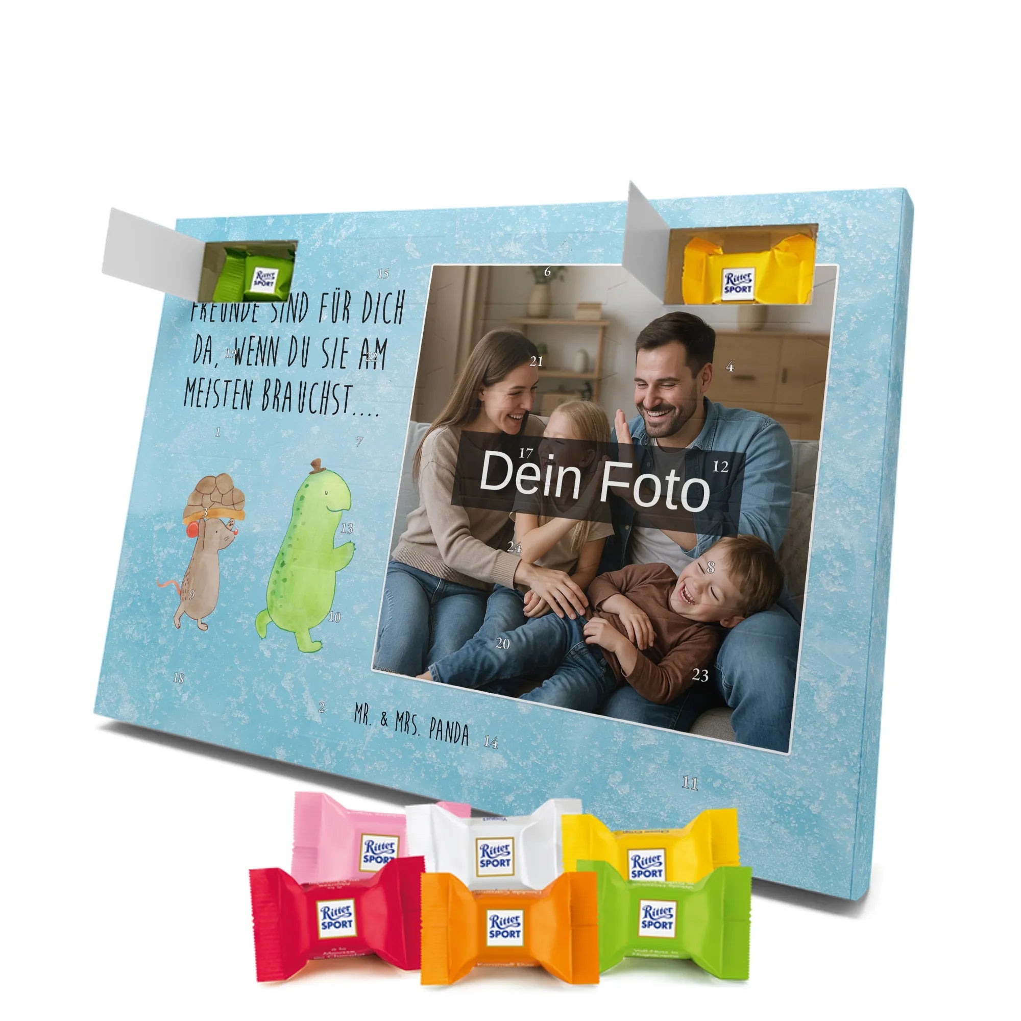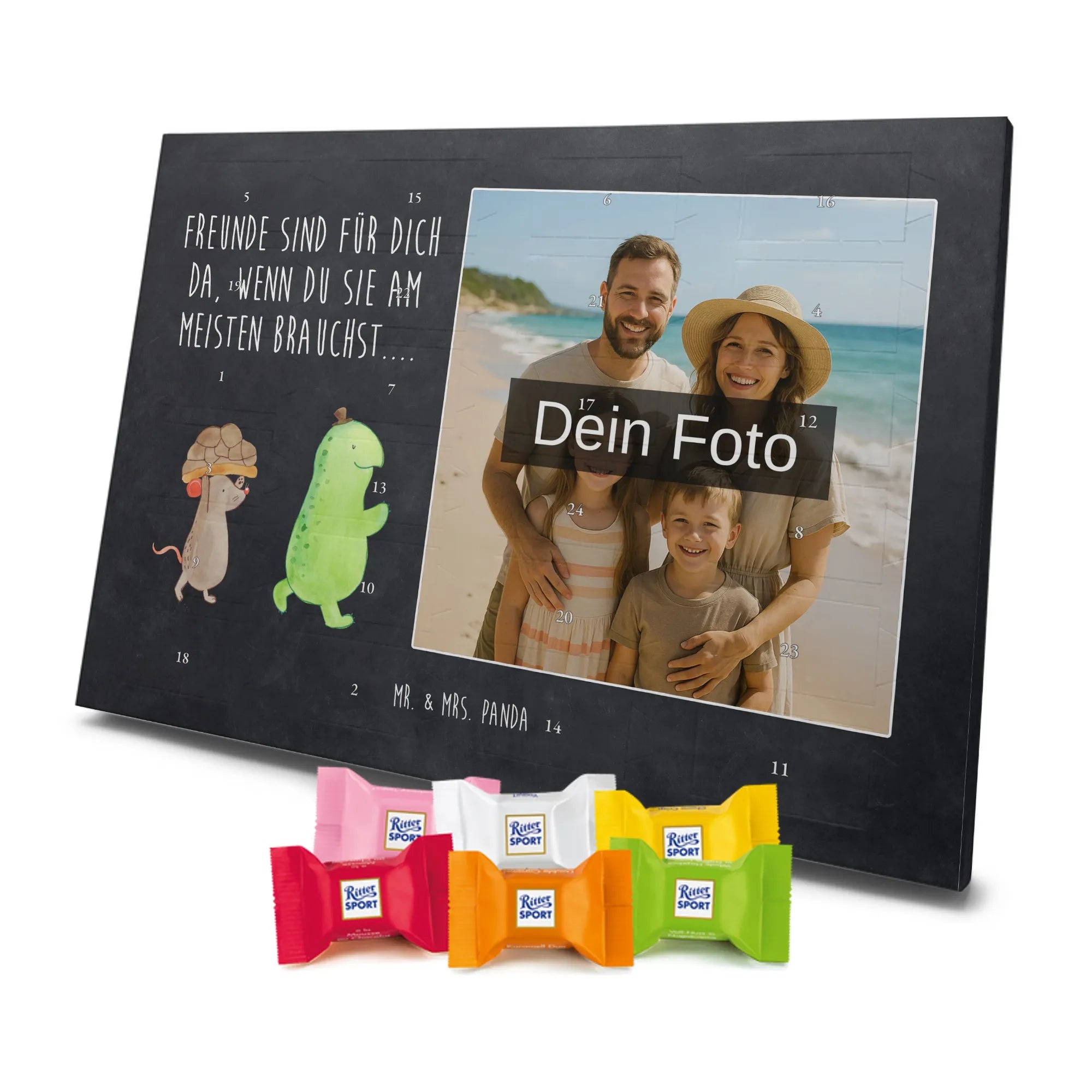 Schoko Foto Adventskalender personalisiert – ein fröhlicher Hingucker von Mr. & Mrs. Panda, der Adventszeit und Erinnerungen verbindet. Der Kalender ist bedruckt mit zauberhaften Motiven & Sprüchen von Mr. & Mrs. Panda und lässt sich ganz leicht mit einem Foto deiner Wahl personalisieren. Achtung Bildqualität: Für ein scharfes Druckbild solltest du ein Foto in hoher Auflösung verwenden. Kontrolliere den Bildausschnitt, damit wichtige Gesichter oder Details nicht verloren gehen. Verwende nur Fotos, für die du die Rechte besitzt oder die frei nutzbar sind. Bitte beachte: Die Fotos werden weder nachbearbeitet noch zugeschnitten und personalisierte Foto Artikel sind vom Umtausch ausgeschlossen. Die Verarbeitung überzeugt mit seidenmatter Oberflächenveredelung und bedruckten Seitenflächen für ein edles Finish. Maße: 325 mm x 225 mm x 27 mm. Besonderheit: Du kannst den Kalender aufhängen oder aufstellen – ganz flexibel. Gefüllt ist der Kalender mit Ritter Sport Schokowürfeln in leckeren Geschmacksrichtungen wie Mousse au Chocolat, Schoko Crisp, Voll-Nuss in Nougatcreme, Karamell Duo, Joghurt und Erdbeer-Joghurt. Ein liebevolles Geschenk, das jeden Tag im Advent versüßt.