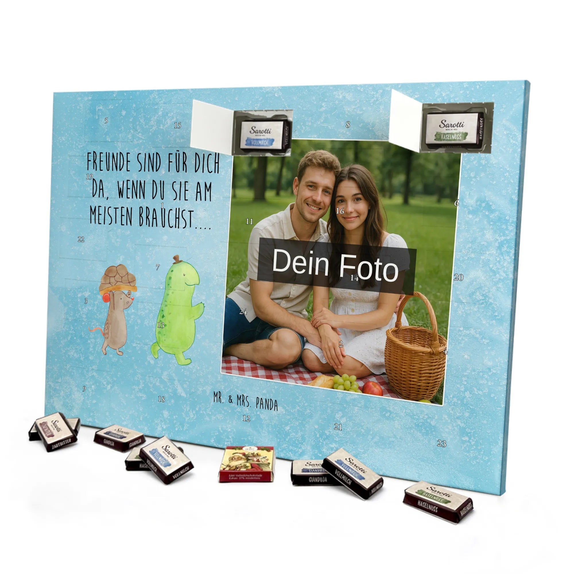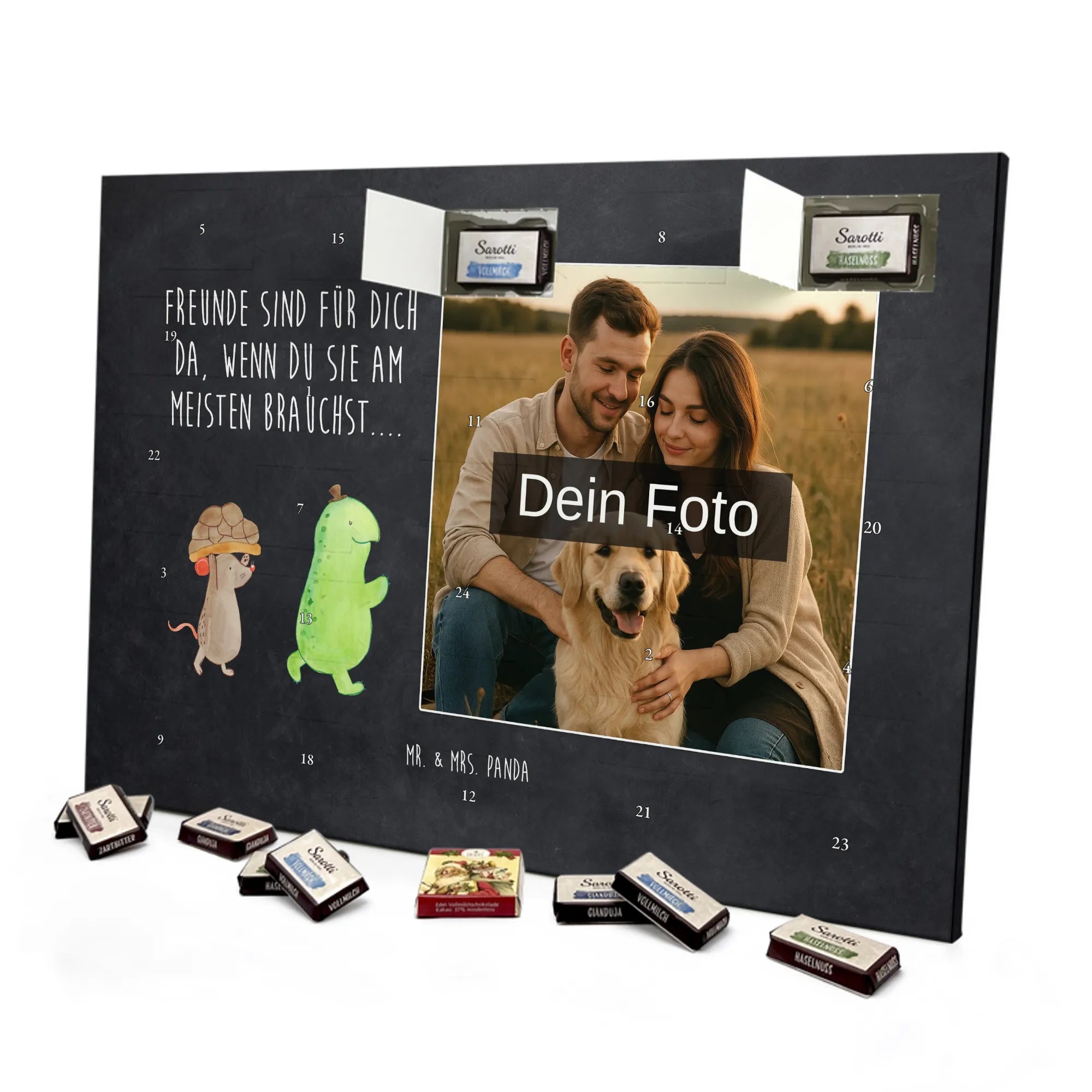 Schoko Foto Adventskalender personalisiert – ein zauberhaftes Geschenk, das Erinnerungen und Geschmack vereint. Mr. & Mrs. Panda haben liebevolle Motive und Sprüche gestaltet, die den Kalender umrahmen; dein Foto setzt die persönliche Note. Für ein optimales Druckbild lade bitte ein Foto mit hoher Auflösung hoch und achte auf einen passenden Bildausschnitt, damit wichtige Details nicht abgeschnitten werden. Bitte nur Bilder verwenden, für die du die Rechte besitzt. Die seidenmatte Oberflächenveredelung sorgt für edle Haptik und die bedruckten Seitenflächen für ein rundum gelungenes Design. Maße: 355 mm x 245 mm x 11 mm – kann aufgehängt oder aufgestellt werden. Wichtiger Hinweis: Wir bearbeiten oder schneiden die Fotos nicht nach; eine Rücknahme personalisierter Foto Artikel ist ausgeschlossen. Gefüllt mit 24 einzeln verpackten Schokoladentäfelchen in den Geschmacksrichtungen Vollmilch, Nougat, Zartbitter und Haselnuss von Sarotti® und Confiserie Heidel®. Insgesamt enthält der Kalender 107 g Markenschokolade. Ideal als Geschenk für Partner, Familie oder Freunde – persönlich, süß und liebevoll verpackt von Mr. & Mrs. Panda.