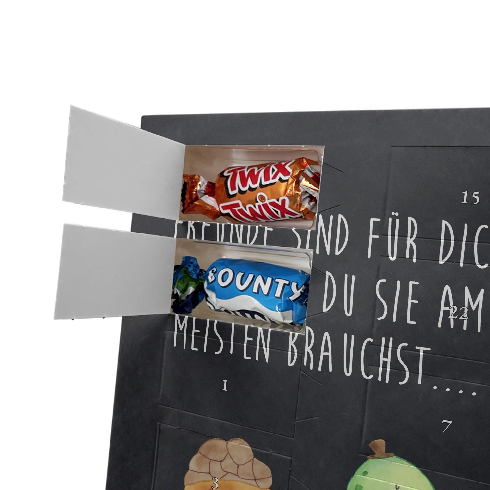 Charmanter Personalisierter Adventskalender mit Schoko-Foto von Mr. & Mrs. Panda – eine liebevolle Art, die Adventszeit zu personalisieren. Der Kalender ist mit den typischen Mr. & Mrs. Panda Motiven und herzlichen Sprüchen bedruckt; du kannst die Vorderseite mit deinem Lieblingsfoto gestalten. Achte auf eine hohe Auflösung deines Fotos, damit das Druckbild schön scharf wird, und kontrolliere den Bildausschnitt, damit keine wichtigen Details verloren gehen. Bitte lade nur Bilder hoch, für die du die Bildrechte besitzt oder eine Erlaubnis zur Nutzung vorliegt. Die Verarbeitung ist hochwertig: brillante Druckqualität, seidenmatte Oberflächenveredelung und bedruckte Seitenflächen für ein rundes Design. Maße: 325 mm x 225 mm x 27 mm. Der Kalender kann aufgehängt oder aufgestellt werden – ganz nach Belieben. Wichtig: Die Fotos werden nicht nachbearbeitet oder zugeschnitten; personalisierte Foto-Artikel sind vom Widerruf ausgenommen. Gefüllt ist der Adventskalender mit Celebrations Schokolade – 24 feine Füllungen in 8 verschiedenen Sorten (Maltesers, Mars, Snickers, Twix, Milky Way, Bounty, Galaxy, Galaxy Caramel). Ein persönliches Geschenk, das Erinnerungen und Genuss wunderbar verbindet.
