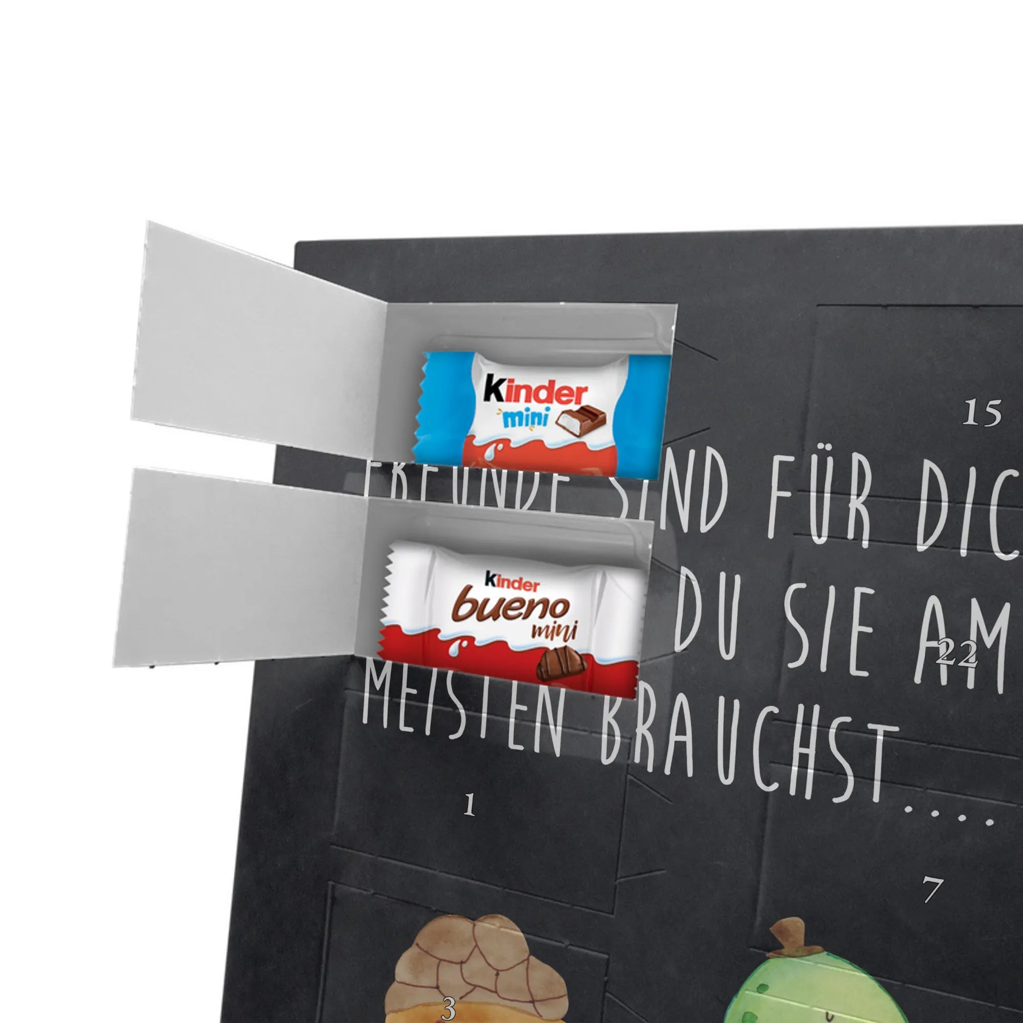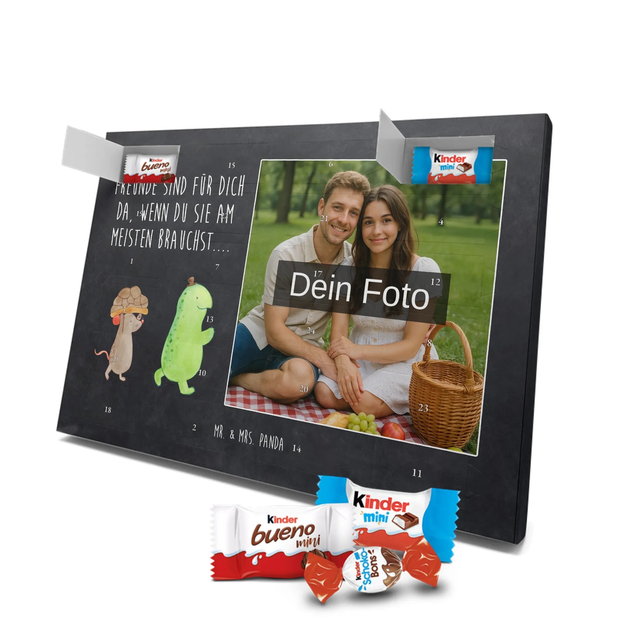 Unser personalisierten Schoko Foto Adventskalender ist ein echtes Highlight in der Adventszeit – handlich, individuell und voller süßer Überraschungen. Du personalisierst die Vorderseite mit deinem liebsten Foto und wir kombinieren es mit liebevollen Motiven und Sprüchen von Mr. & Mrs. Panda. Bitte achte auf eine ausreichende Bildauflösung und einen passenden Bildausschnitt, damit das Druckergebnis gestochen scharf ist. Lade nur Bilder hoch, deren Rechte du besitzt oder bei denen du die Erlaubnis hast, besonders wenn Personen darauf zu sehen sind. Wichtig: Fotos werden nicht retuschiert oder zugeschnitten; personalisierte Foto-Artikel sind vom Widerruf ausgeschlossen. Der Kalender besticht durch brillante Druckqualität und eine seidenmatte Oberflächenveredelung sowie bedruckte Seitenflächen. Maße: 355 mm x 245 mm x 11 mm. Du kannst ihn entweder aufstellen oder an die Wand hängen. Gefüllt ist der Adventskalender mit kinder® Schokolade, inklusive kinder® Schoko-Bons, kinder® Bueno mini und kinder® Schokolade mini. Ein liebevolles, persönliches Geschenk für Kinder, Freunde oder die bessere Hälfte – individuell, süß und mit dem typischen Mr. & Mrs. Panda Charme.