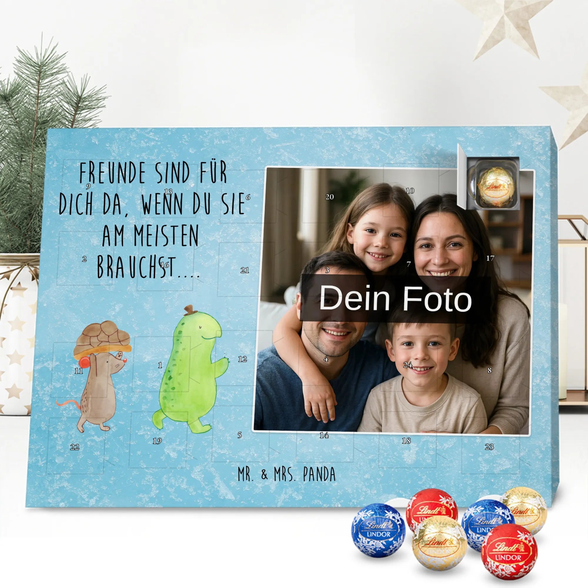 Mach die Adventszeit persönlich mit unserem Personalisiertes Schoko Foto-Adventskalender von Mr. & Mrs. Panda. Dieser Kalender kombiniert dein Lieblingsfoto mit unseren fröhlichen Illustrationen und liebevollen Sprüchen – perfekt als Geschenk für Partner, Familie oder Freunde. Für ein optimales Druckergebnis bitte ein hochauflösendes Bild verwenden und den Bildausschnitt so wählen, dass wichtige Details nicht verloren gehen. Beachte, dass wir Fotos nicht nachbearbeiten oder zuschneiden; lade nur Bilder hoch, für die du die Rechte besitzt. Die hochwertige Verarbeitung beinhaltet eine seidenmatte Oberflächenveredelung und bedruckte Seitenflächen, außerdem ist der Kalender robust und kann aufgehängt oder aufgestellt werden. Maße: 233 mm x 178 mm x 24 mm. Gefüllt mit Lindt Lindor Markenschokolade: 24 einzeln verpackte Kugeln in den Sorten Vollmilch, Feinherb und Weiße Schokolade. Inhaltsstoffe und Allergene sind angegeben; es kann Haselnüsse und Mandeln enthalten. Hinweis: Personalisierte Foto-Artikel sind vom Umtausch ausgeschlossen. Ein süßer, persönlicher Adventsgruß von Mr. & Mrs. Panda.