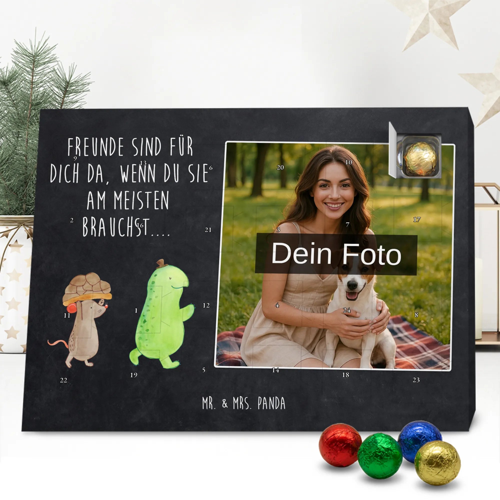 Liebevoll gestalteter Personalisierter Foto-Adventskalender von Mr. & Mrs. Panda – perfektes Geschenk für alle, die Weihnachten mit einer persönlichen Note mögen. Du erhältst einen Adventskalender, bedruckt mit unseren typischen Mr. & Mrs. Panda Motiven & Sprüchen, und kannst ein eigenes Foto einfügen. Bitte lade ein Foto in hoher Auflösung hoch und achte auf den Bildausschnitt, damit wichtige Gesichter und Details nicht verloren gehen. Verwende nur Bilder, für die du die Rechte besitzt oder eine Erlaubnis hast. Der Kalender überzeugt durch brillante Druckqualität, eine seidenmatte Oberflächenveredelung und bedruckte Seitenflächen. Maße: 233 mm x 178 mm x 24 mm. Besonderheit: Der Kalender kann aufgehängt oder aufgestellt werden. Hinweis: Die Fotos werden weder aufbereitet noch zugeschnitten; Rücknahme bei personalisierten Foto-Artikeln ist ausgeschlossen. Gefüllt mit MARKENNAMEN Schokolade und leckeren Schokoladenkugeln. Kann Spuren von Haselnüssen, Mandeln, Gluten und Soja enthalten. Kühl und trocken lagern. Ein emotionales, süßes Geschenk, das an jedem Adventstag Freude und Erinnerungen schenkt.