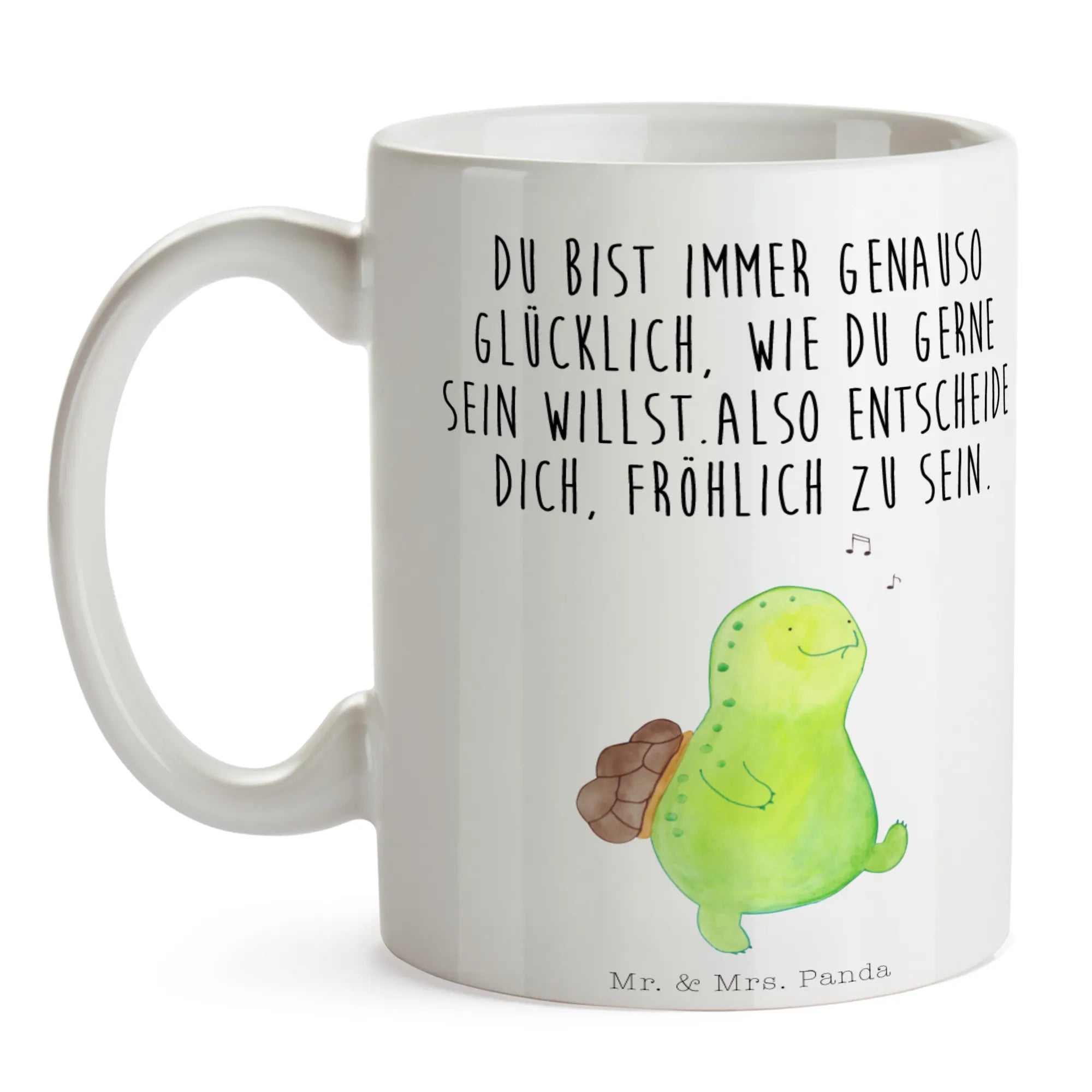 Mr. & Mrs. Panda Tasse „Schildkröte pfeift“ – ein kleines Kunstwerk für deinen Kaffee- oder Teemoment. ☕🐢 Die niedliche Schildkröte marschiert fröhlich über die Tasse und pfeift ihr Lied, während der aufmunternde Spruch „Du bist immer genauso glücklich, wie du gerne sein willst. Also entscheide dich, fröhlich zu sein .“ dich anlächelt.